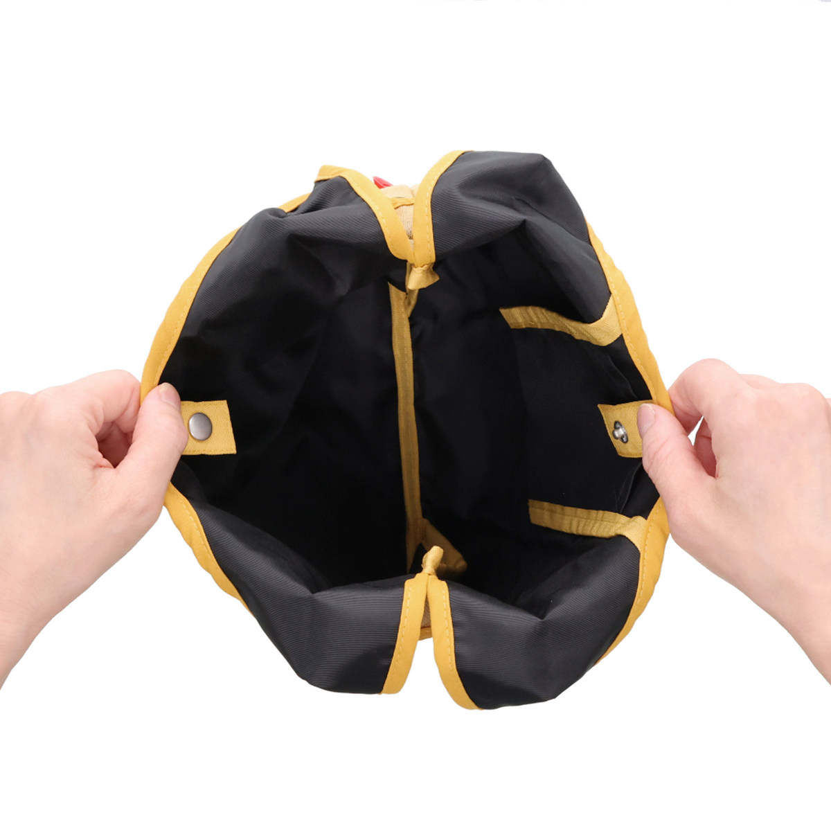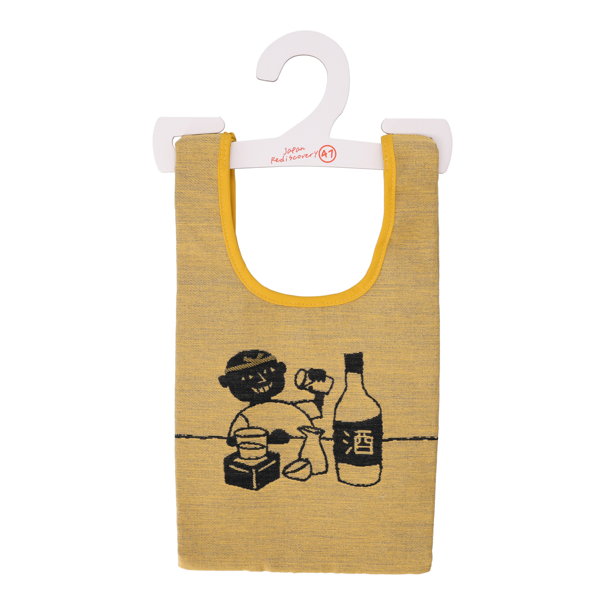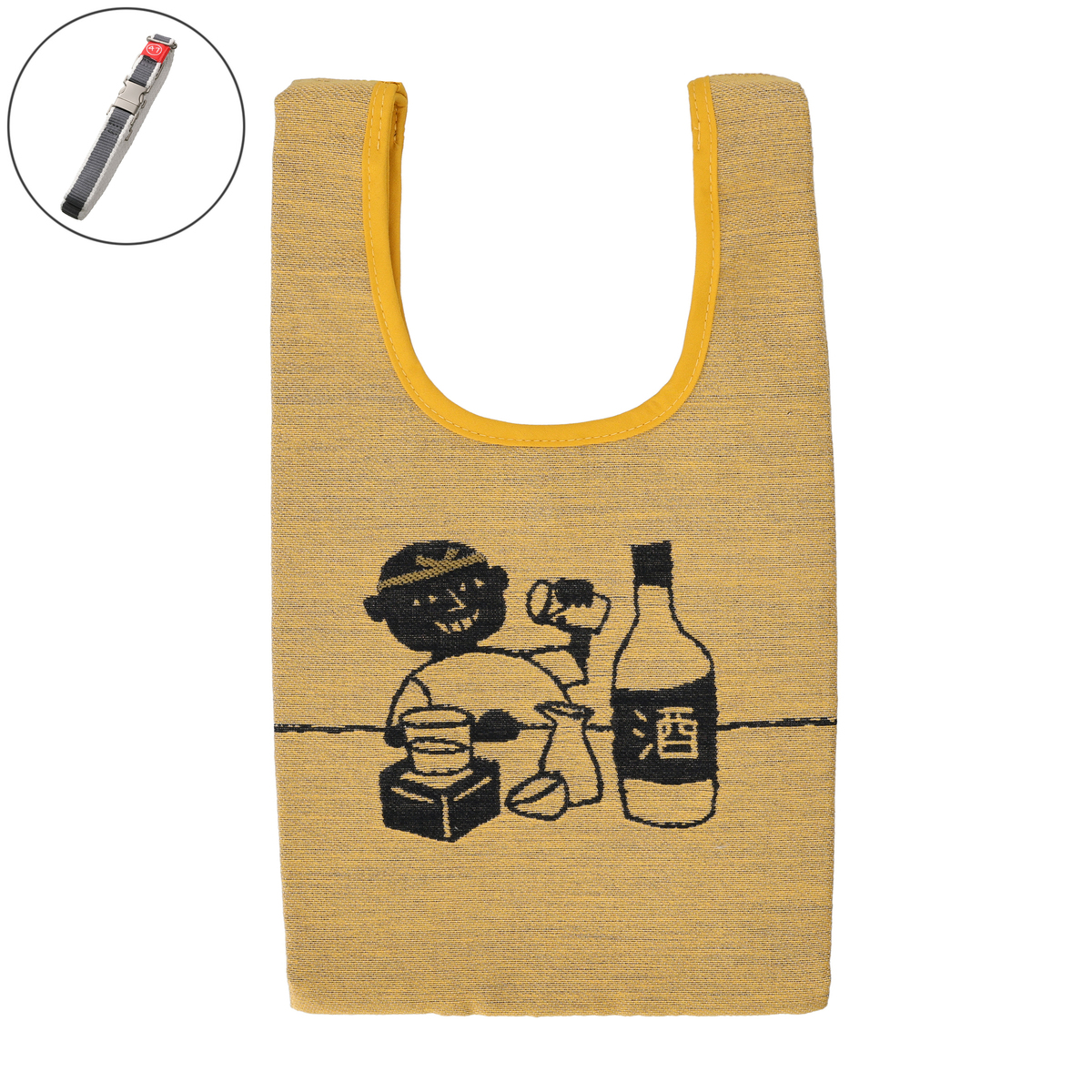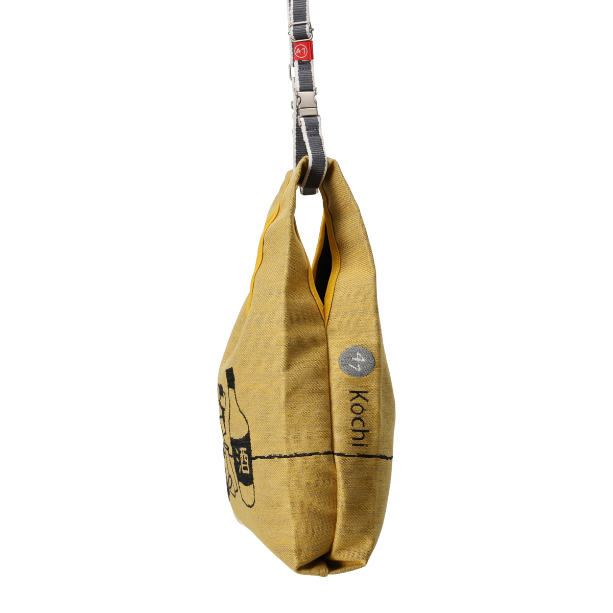 高知を表すモチーフとして「お酒好き」をデザインしたバッグ。ジャカード織りならではの立体感とあたたかみがあり、デザインに豊かな表情と奥行きを感じさせます。コンパクトなサイズ感ですが500mlのペットボトルも入り、内側に吊り下げポケットが一つ付いているので、鍵などの小物も収納可能です
