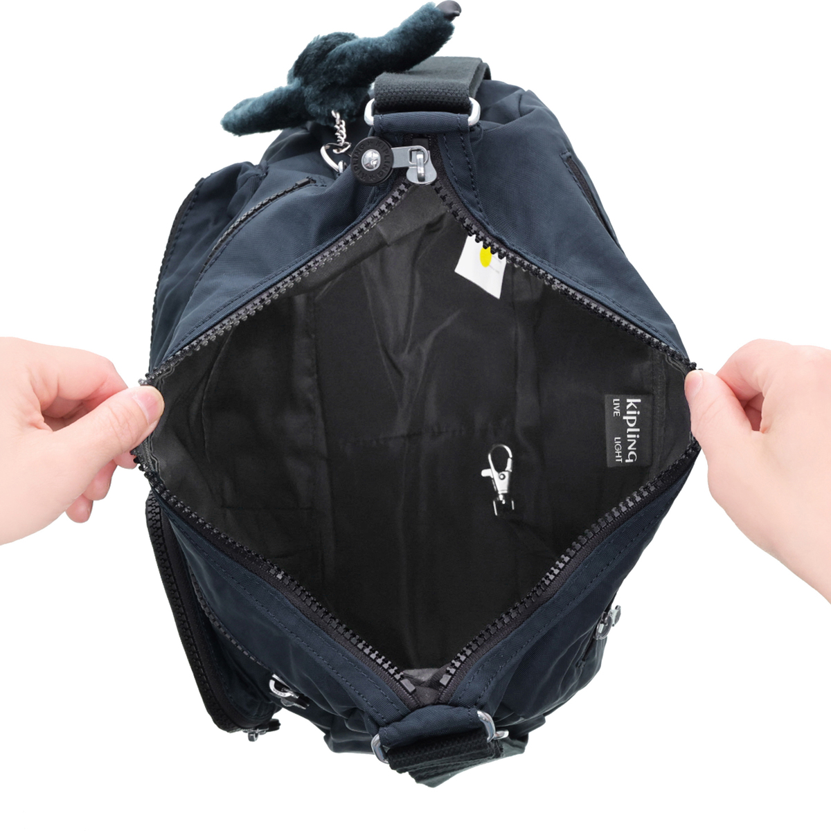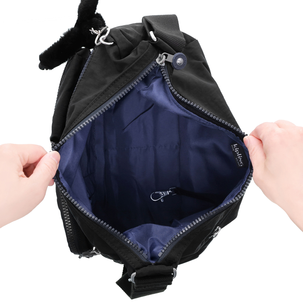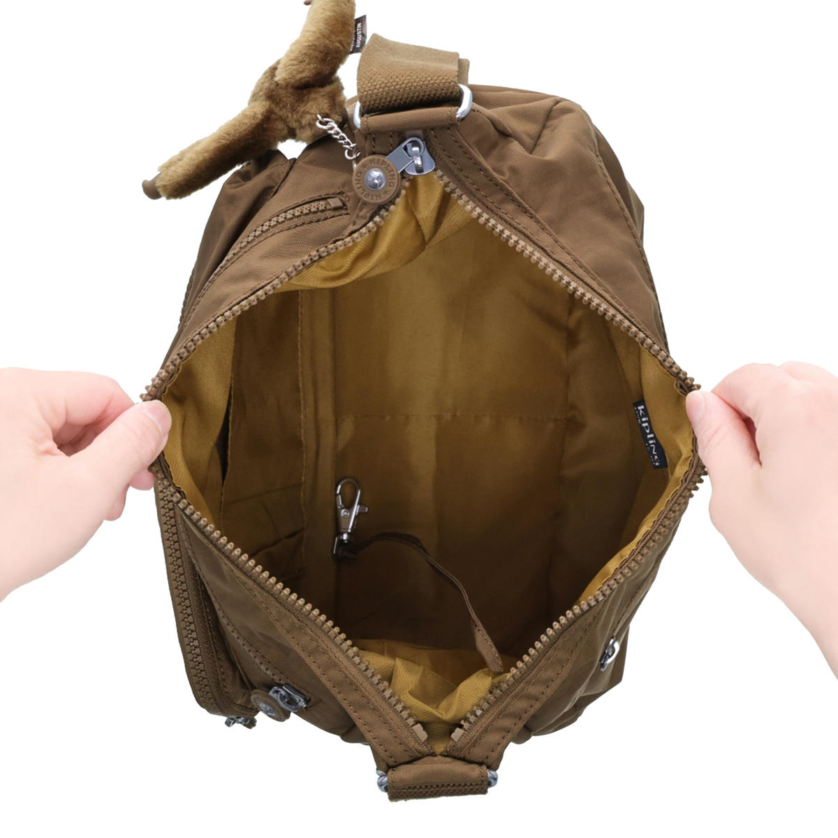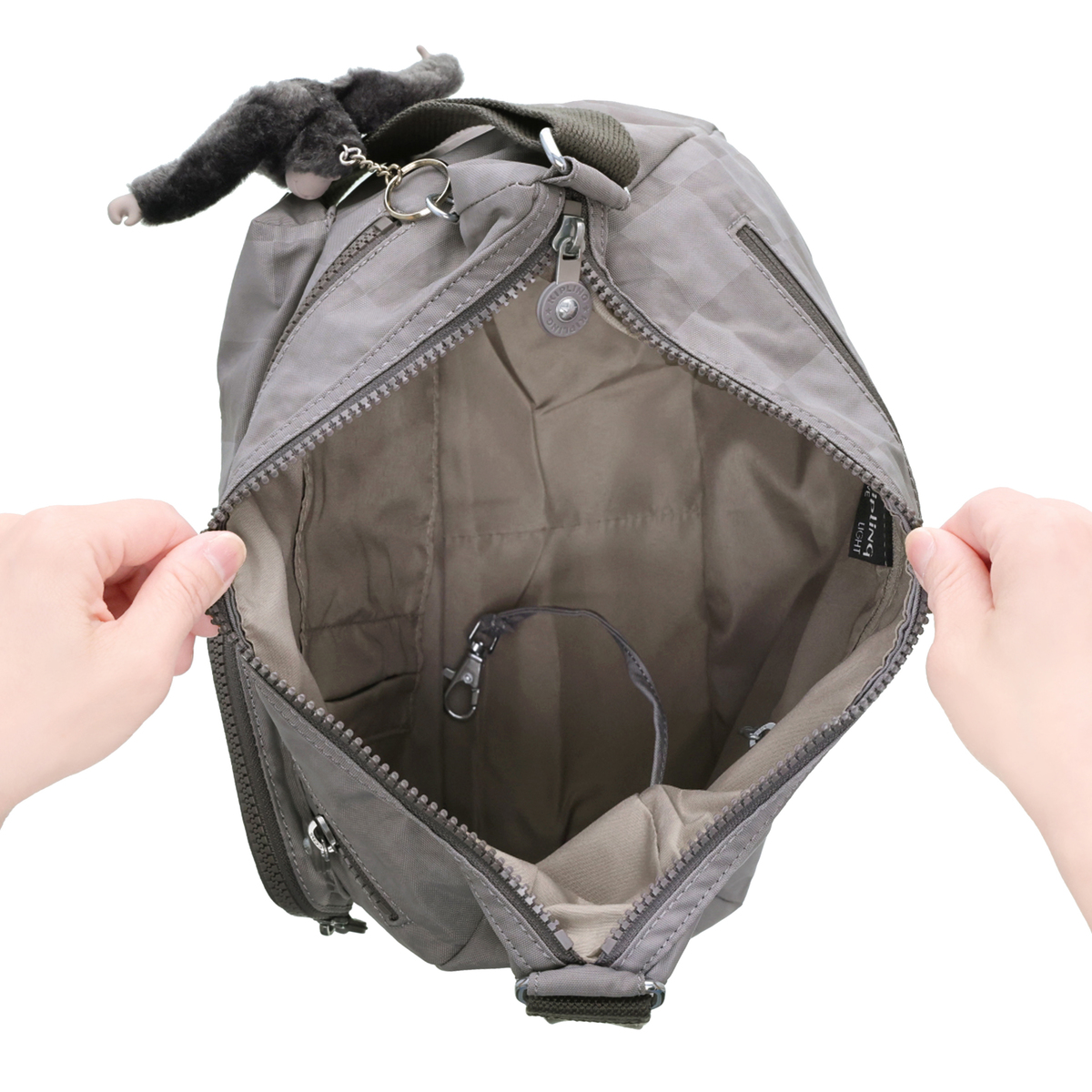 外側前面には形の違うファスナーポケットが3つ、背面にも幅広ファスナーポケットを配置。内部には細かいポケットやキーフックもあり、持ち物をすっきり整理できます