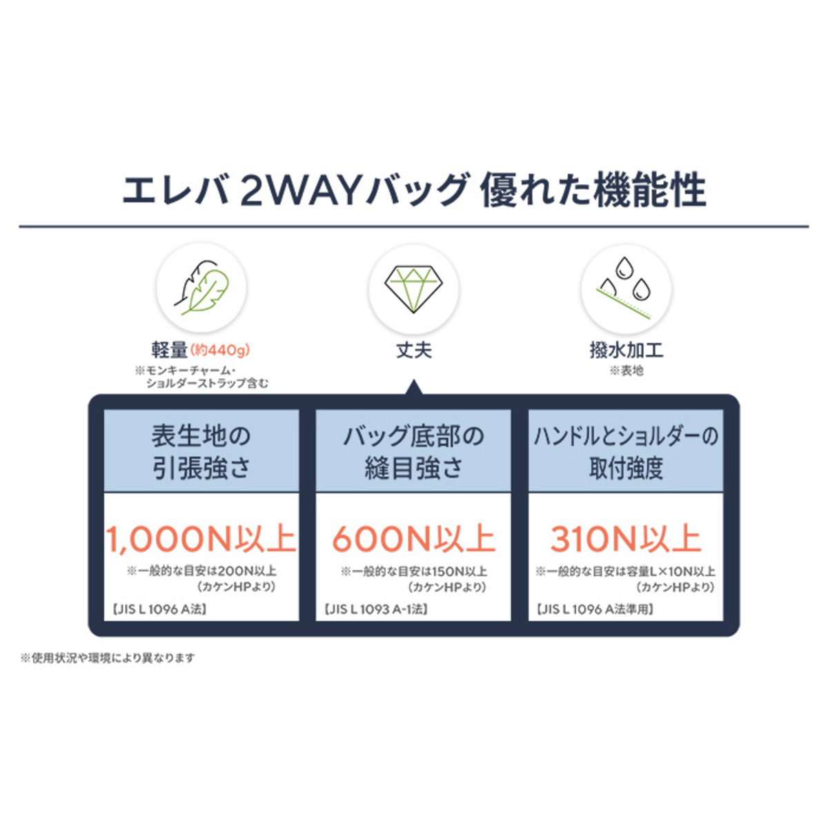 表地にはっ水加工を施したバッグ本体生地は、糸の交差が多い平織で密度があり、耐引裂・摩擦強度が高くなっています。樹脂製のファスナーエレメント(太いタイプ=ポリアセタール樹脂、細いタイプ=ポリエステル樹脂)を使用し、軽量で耐久性もあり開閉も滑らかです