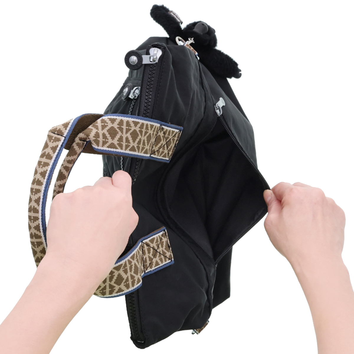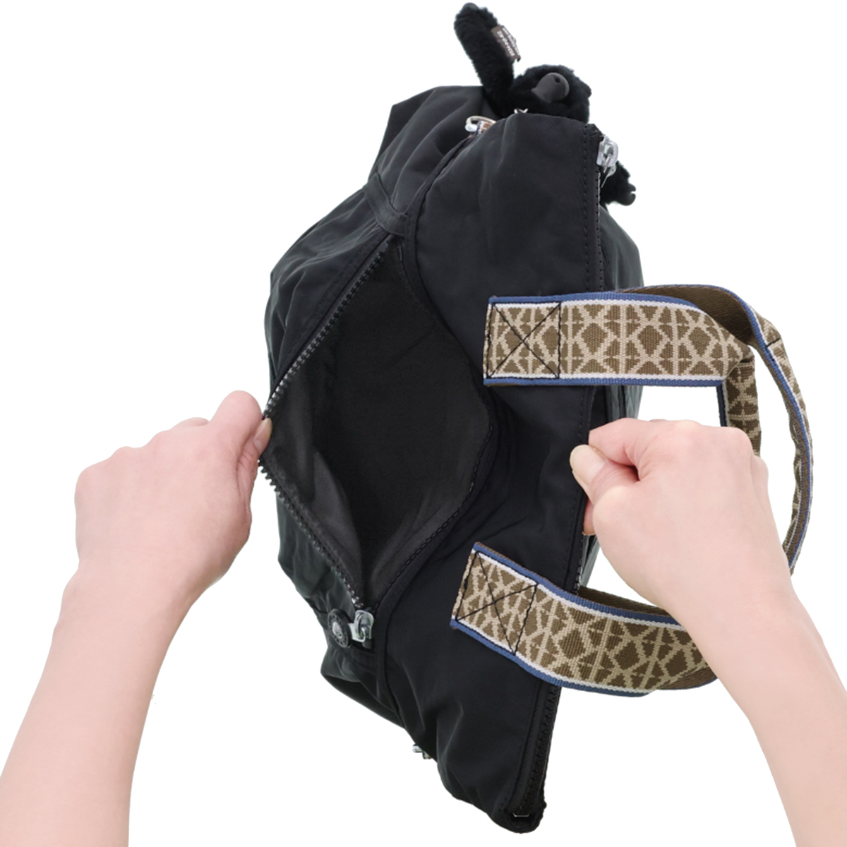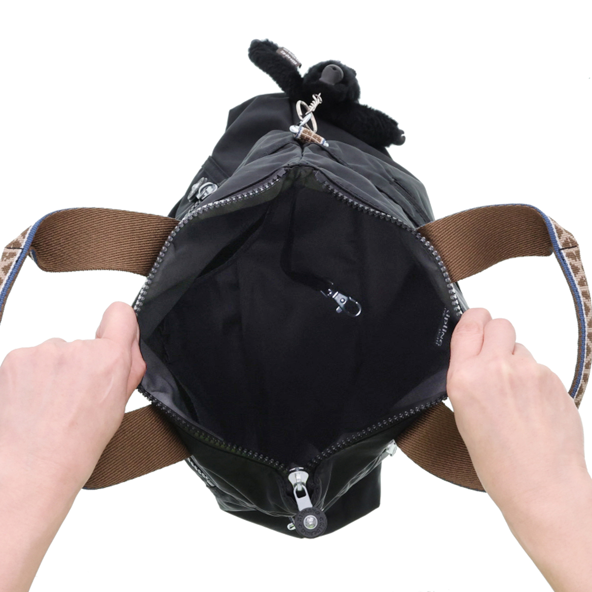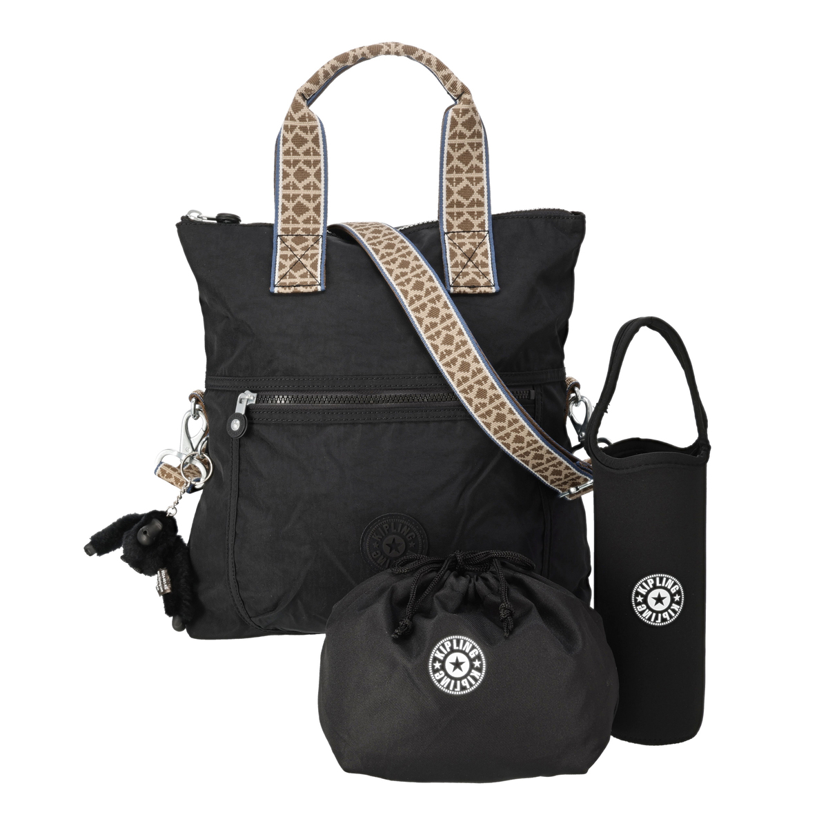 <バッグ> [サイズ(約)] 縦33×横34×マチ8cm <ハンドル立ち上がり> 11cm <ショルダー立ち上がり> 25〜57cm バッグ折り畳み時:34〜66cm [重量(約)]※付属品含む 440g [素材] 表地:ナイロン ※裏地有 [仕様] 付属(取り外し可):チャーム×1、ショルダーストラップ×1、ボトルホルダー×1、巾着ポーチ×1 開閉:ファスナー式 底ビョウ:無 [ポケット] 内側:ファスナーポケット×1、オープンポケット×2、ペン挿し×2、キーフック×1 外側:ファスナーポケット×2 【カンボジア製】 <ボトルホルダー> [サイズ(約)] 縦20×横6.5×マチ6.5cm ハンドル立ち上がり:8cm [重量(約)] 17g [素材] ポリエステル※裏地無 [仕様] 開閉:オープンタイプ 【中国製】 <巾着ポーチ> [サイズ(約)] 縦15×横25×マチ9cm [重量(約)] 25g [素材] ポリエステル※裏地無 [仕様] 開閉:巾着タイプ 【中国製】 [注意事項] ※直射日光や蛍光灯の影響で変色することがありますのでご了承下さい