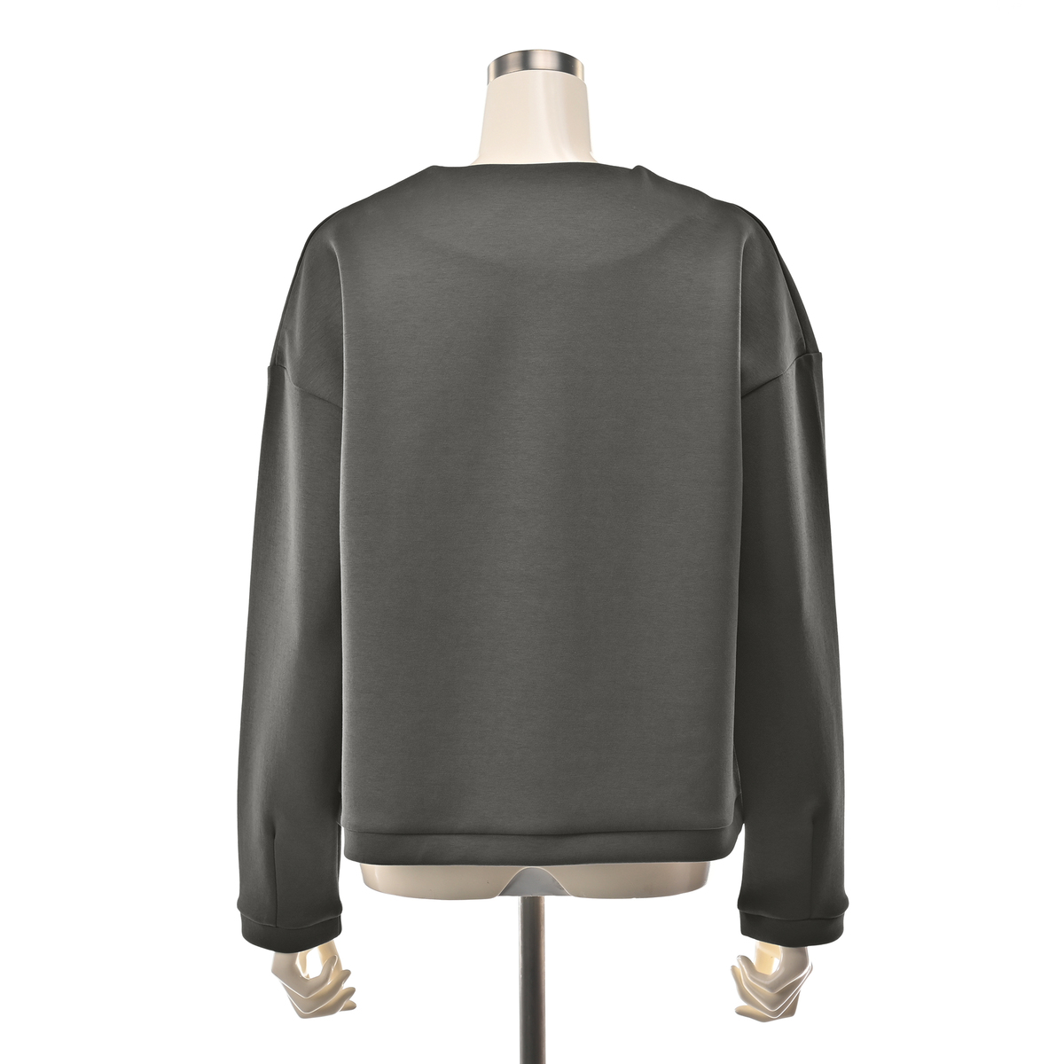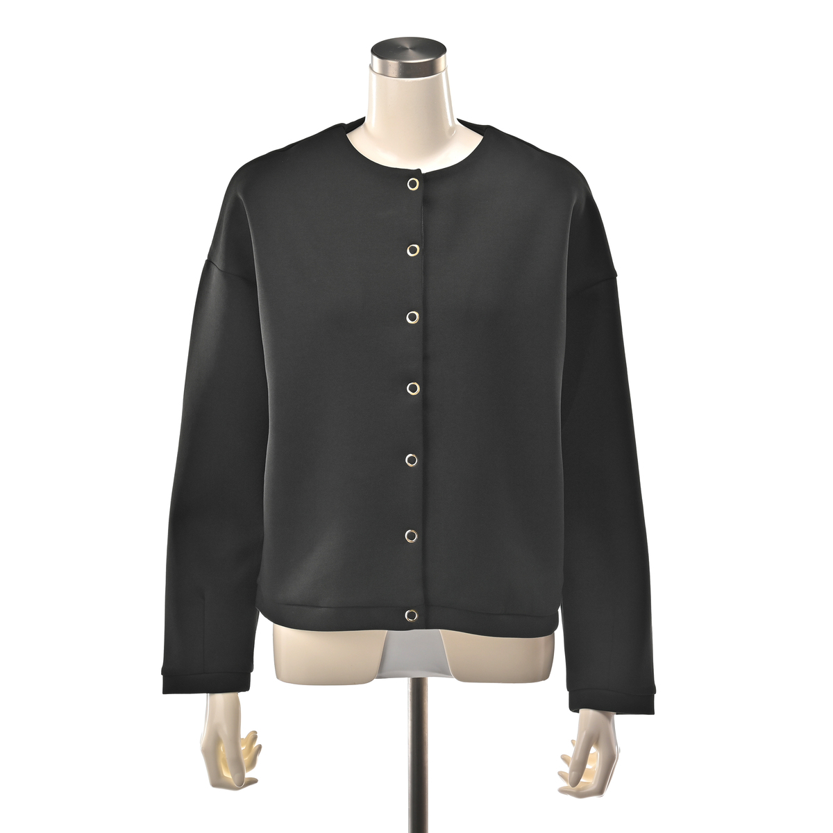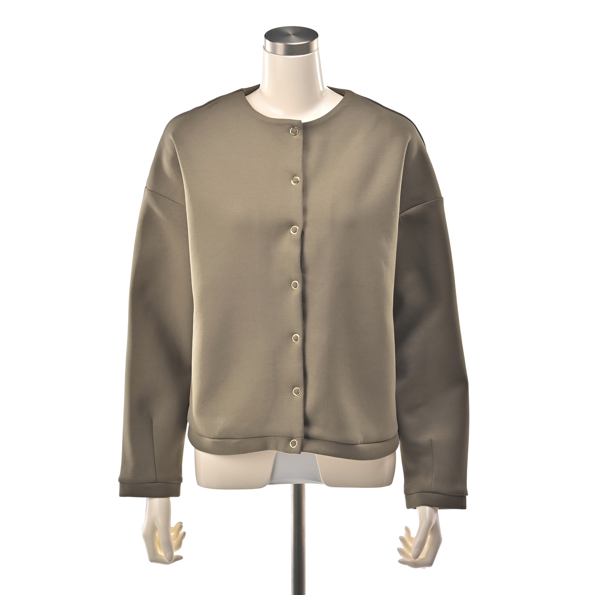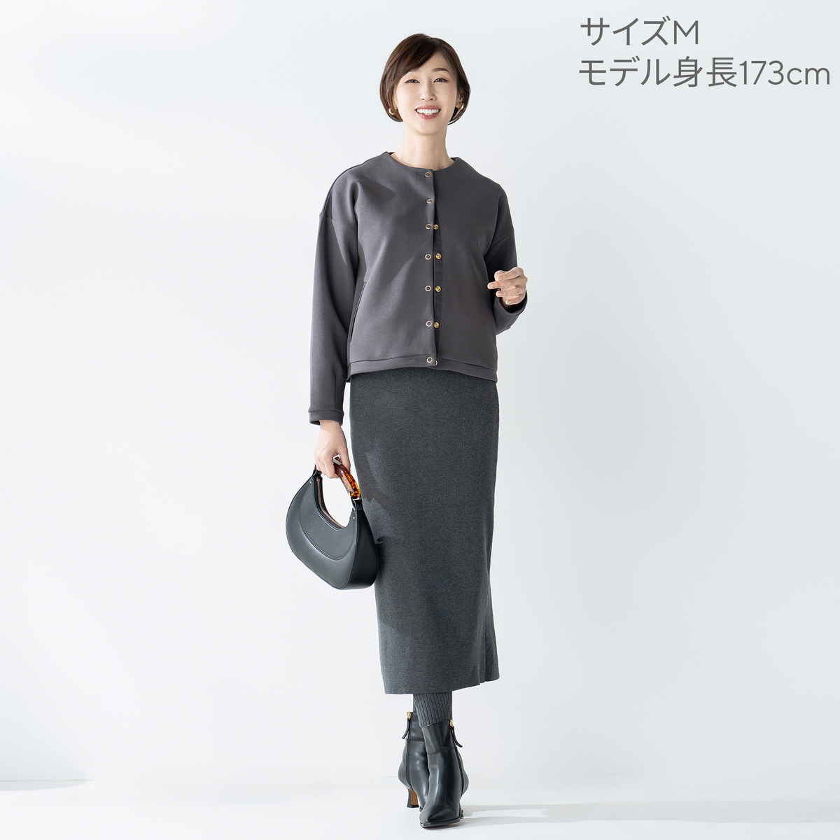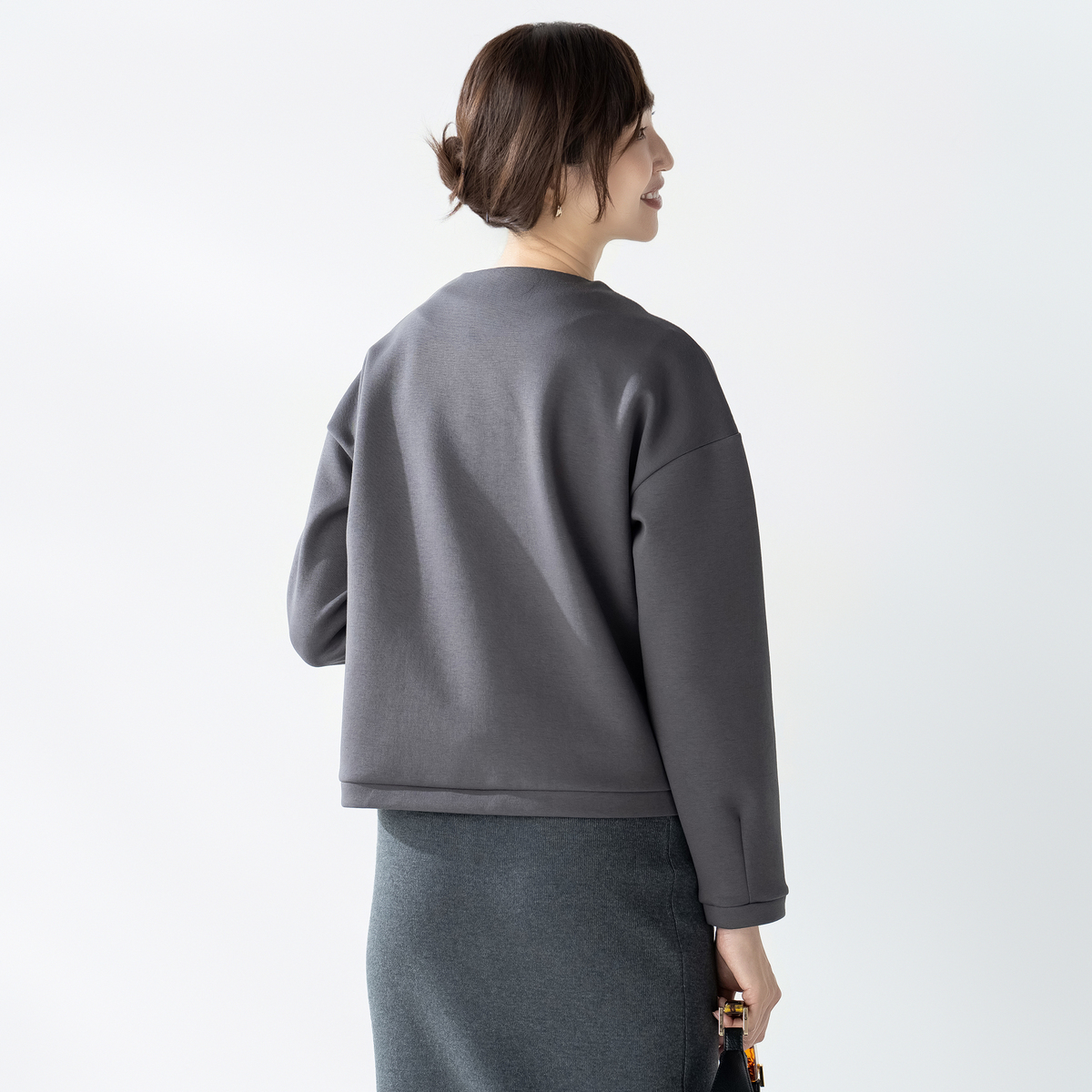 シンプルなダンボールニットジャケットです。華やかなゴールド調のボタンと、開けて着た際に見えるグログランテープも上品なデザインです。羽織りとしても、プルオーバーとしても活躍し、真冬はコートのインにもお使いいただけます