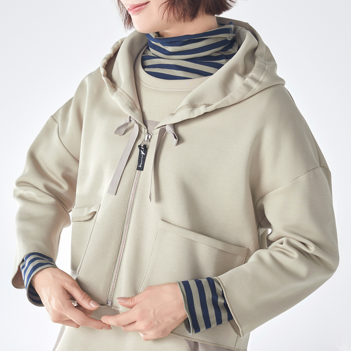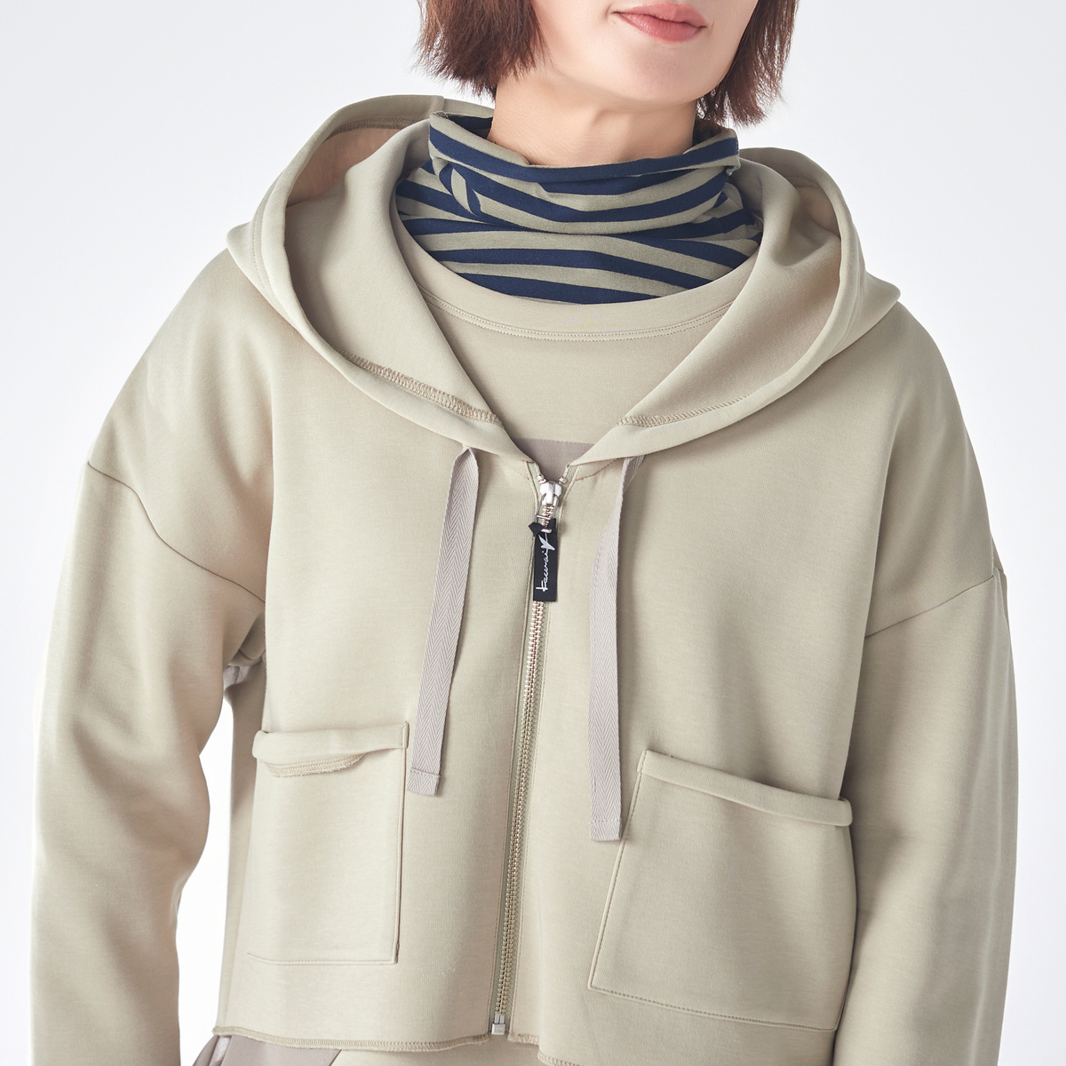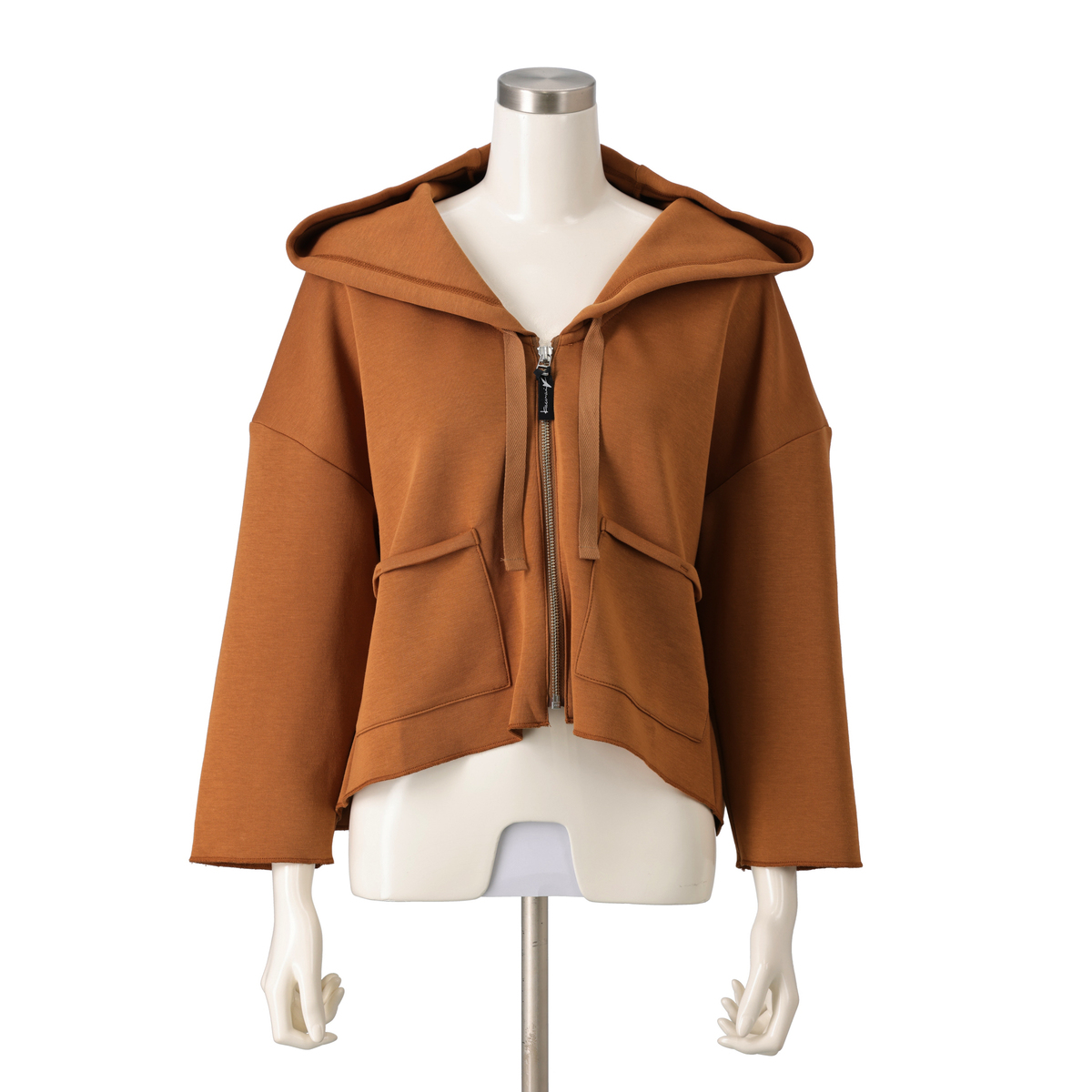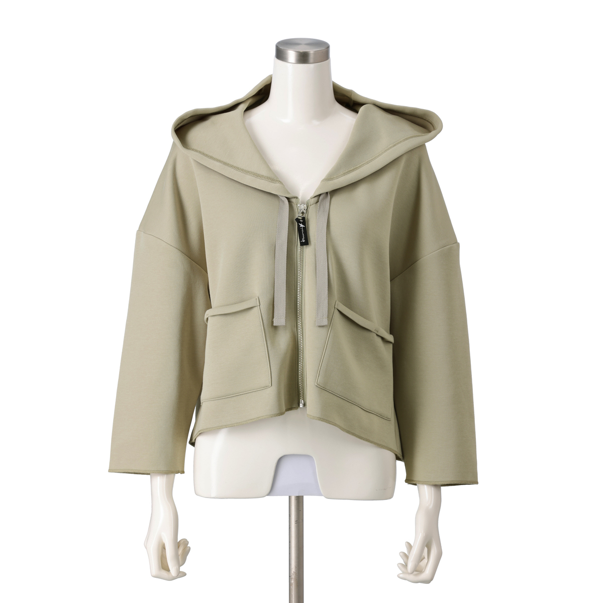 オリジナルジャージ素材の、スポーティーなショートパーカー。素材の肉感がありますが、とても柔らかく、着心地の良い綿混の原料をセレクトして丸編みで仕立てています