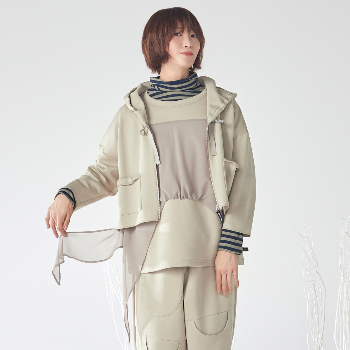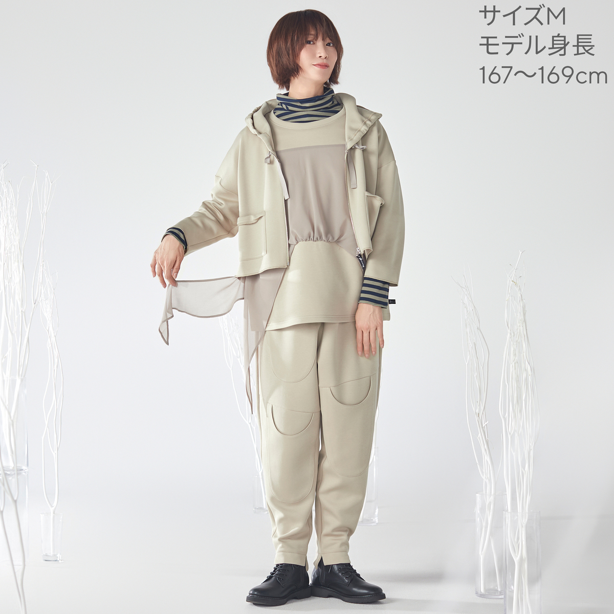 ショート丈とポケットのデザインに惹かれました。同素材のシフォンのトップスはM。パーカーはLにしようと思っていましたが梶原ナビがやったりしているのでいつものサイズで大丈夫とヒントをくれたのでMサイズを選んで正解でした。 細かいディテールも小技が効いていておしゃれさんになれた気分になります。袖口がリブでない所も好きで、ターンバックして中のトップスとのレイヤードを楽しんでいます。