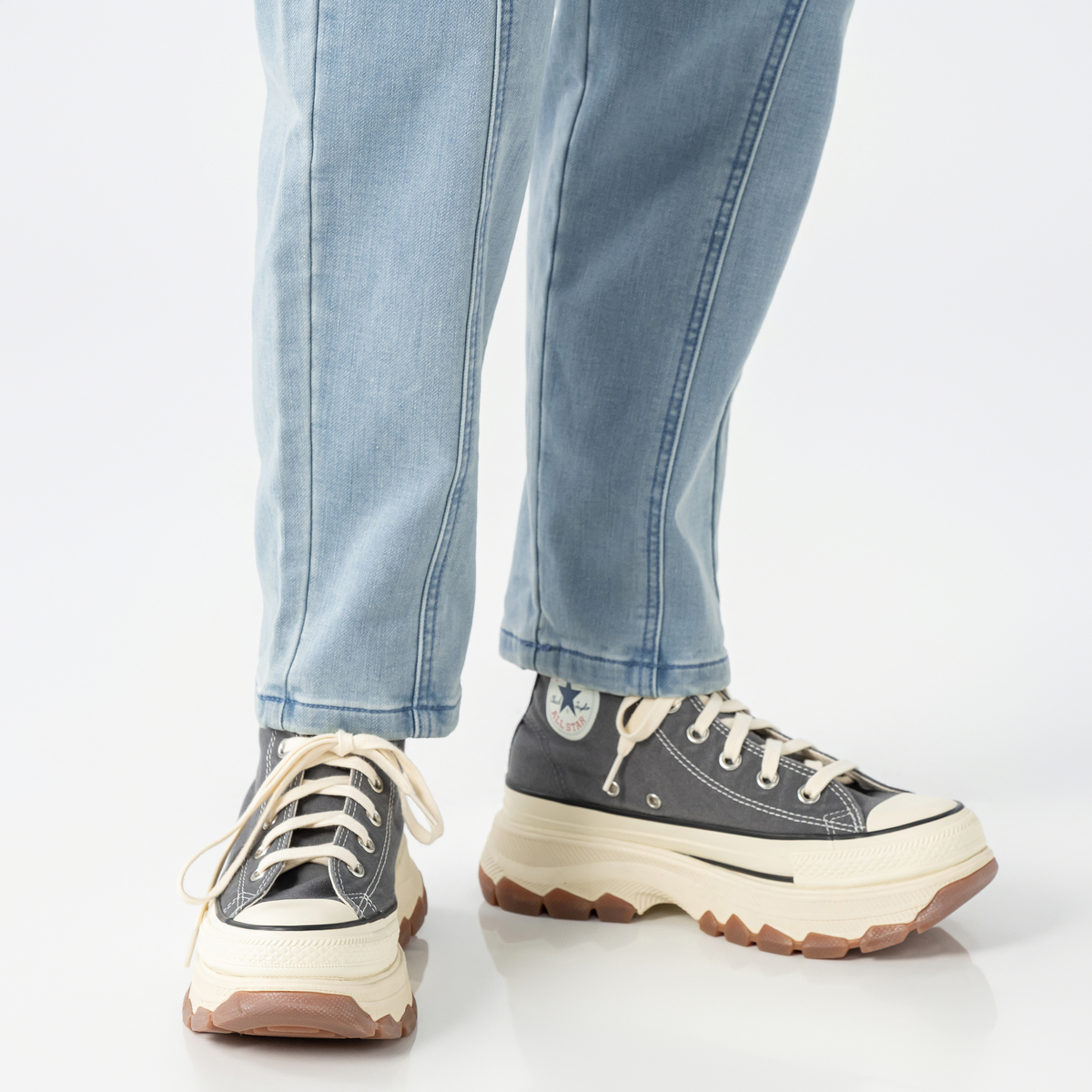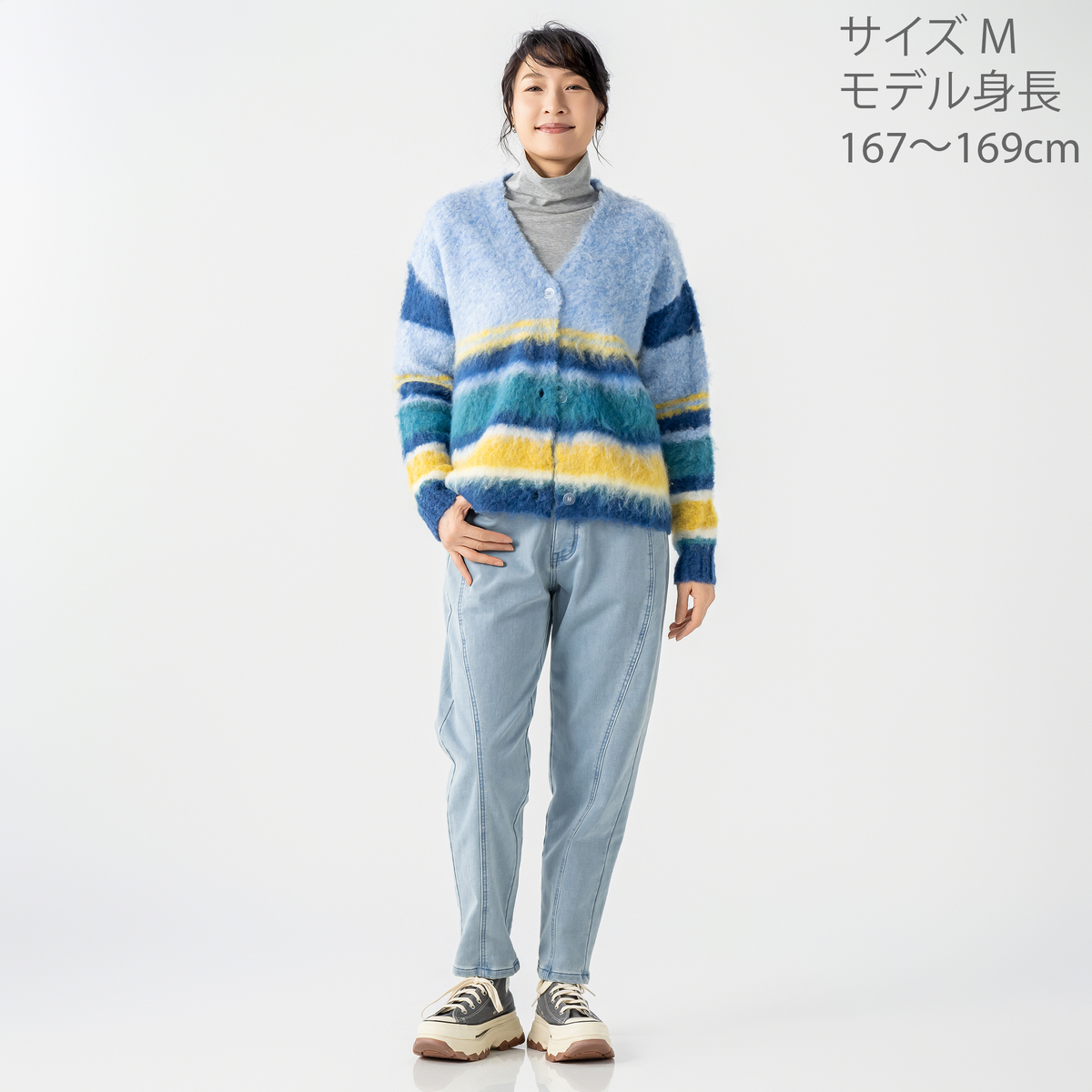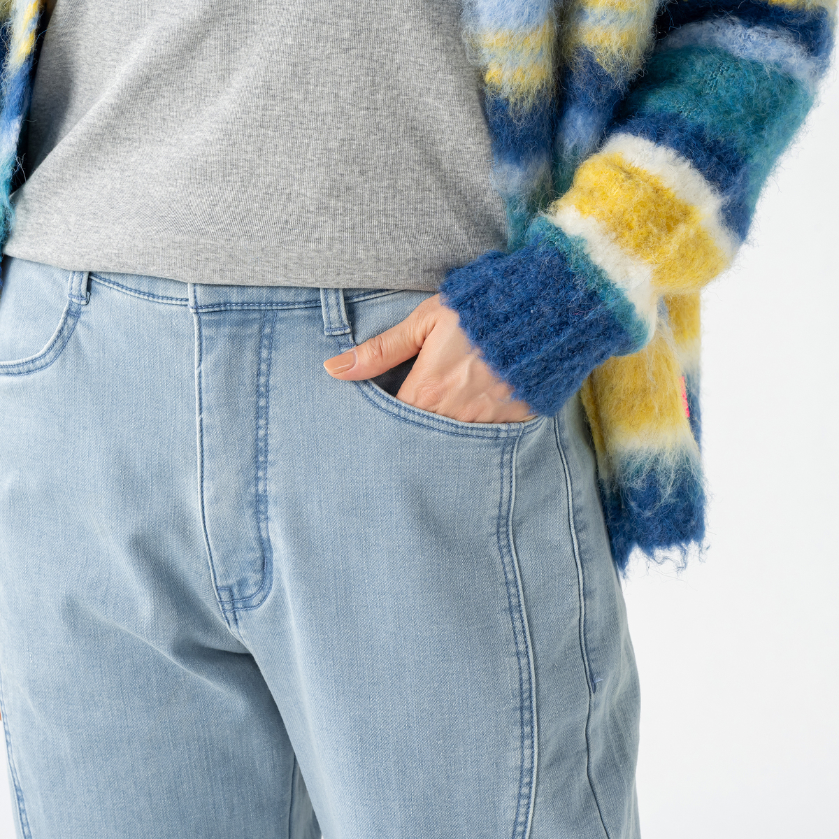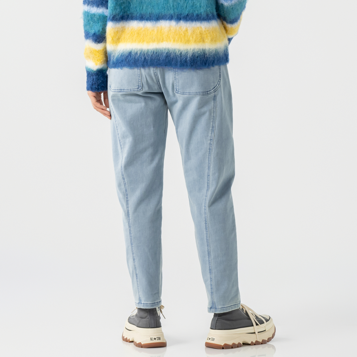 裏起毛素材で仕立てたペグトップシルエットのデニムパンツ。裾に向かって細くなるシルエットが脚をすっきり見せつつ、太ももにはゆとりを持たせた穿き心地の良さです