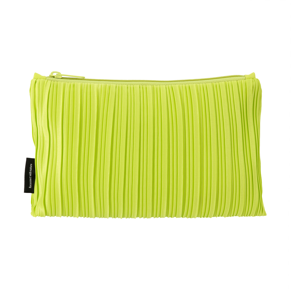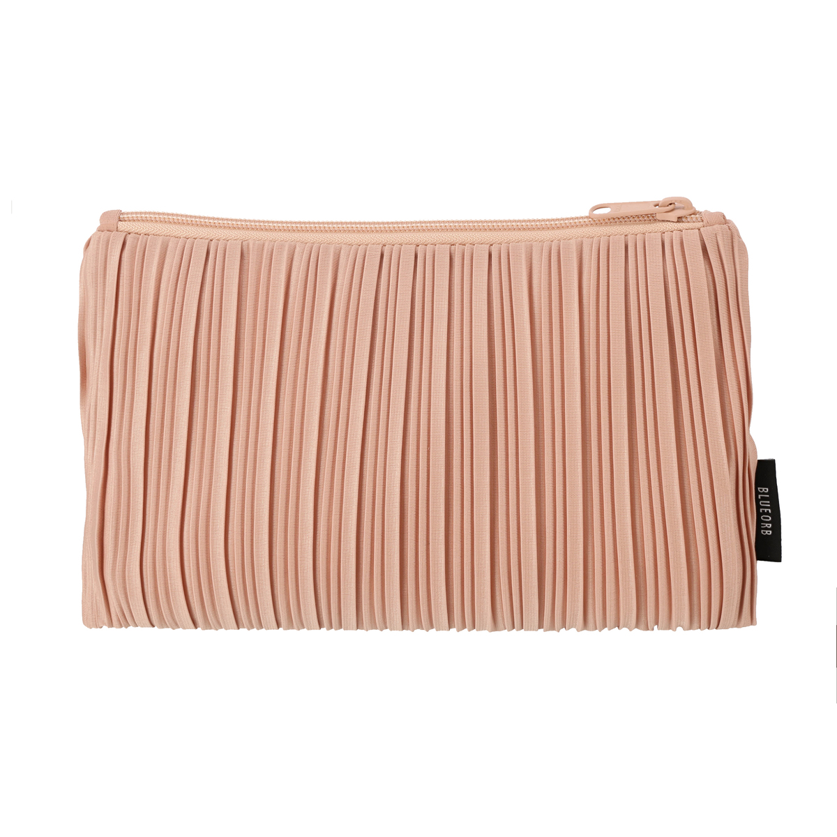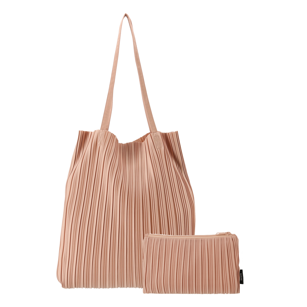 プリーツBagは好きで日本製の小さな物も持っていますが財布やスマホ以外に大きな物を入れると形が歪になり使いにくかったので出番が少なかったのですが、このbagは張りがありプリーツが開いても綺麗で形が崩れないので持ちやすいです。ポーチも同様にフアスナーもスムーズで大きさも良いです。