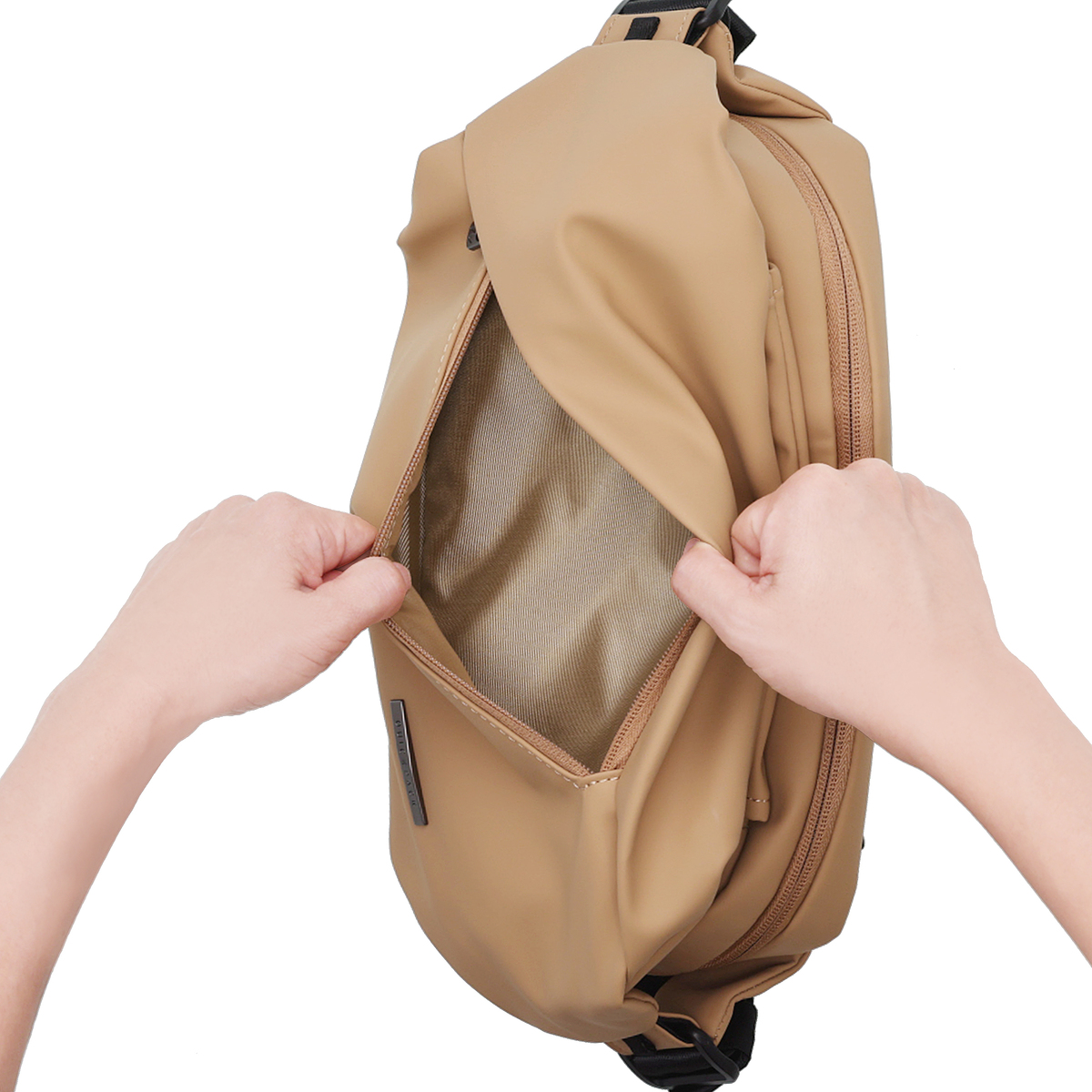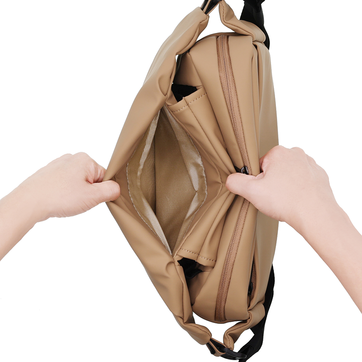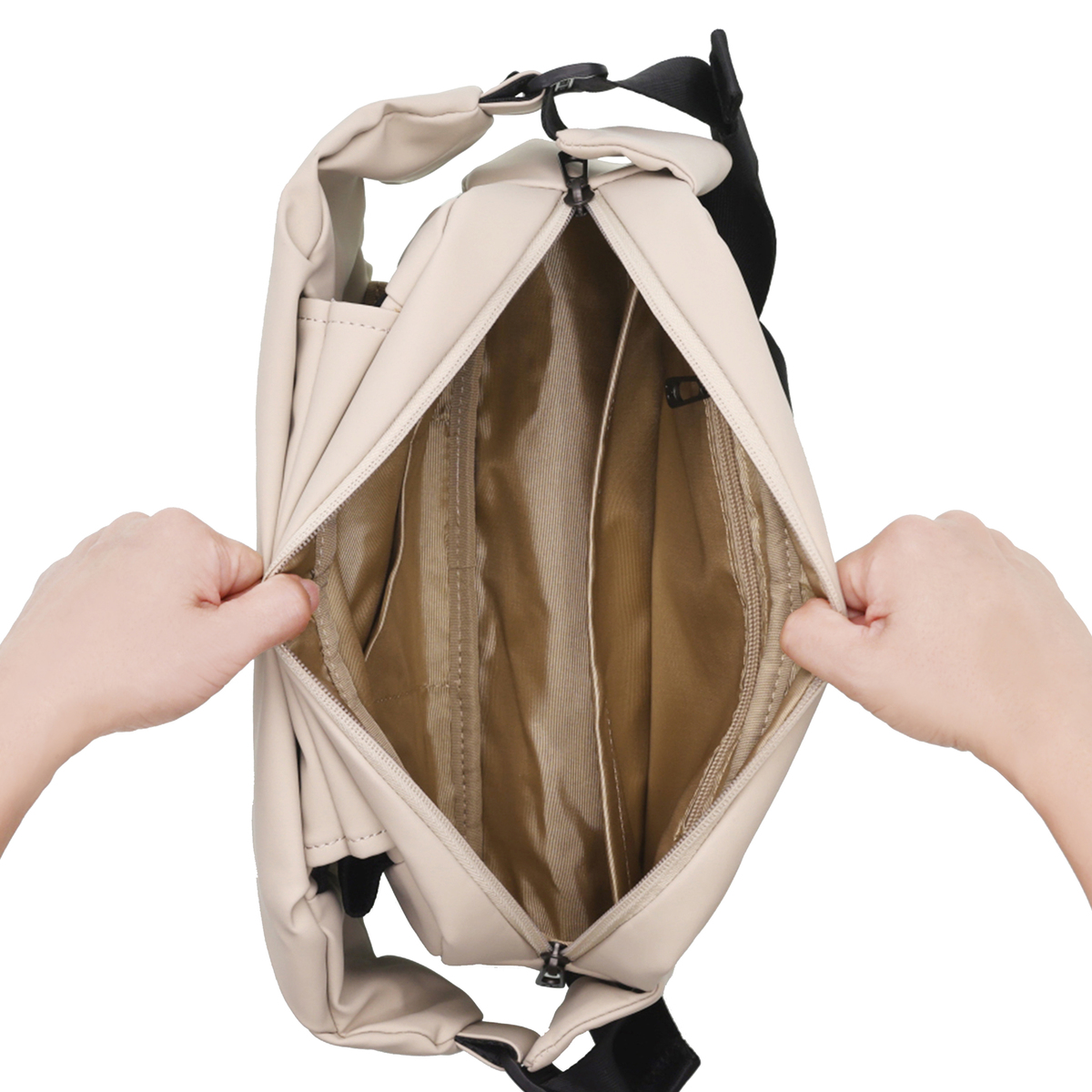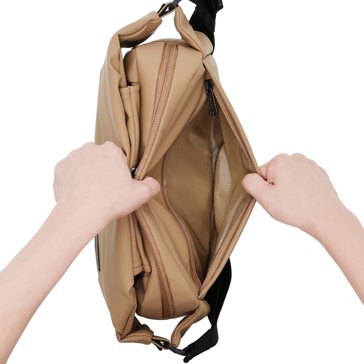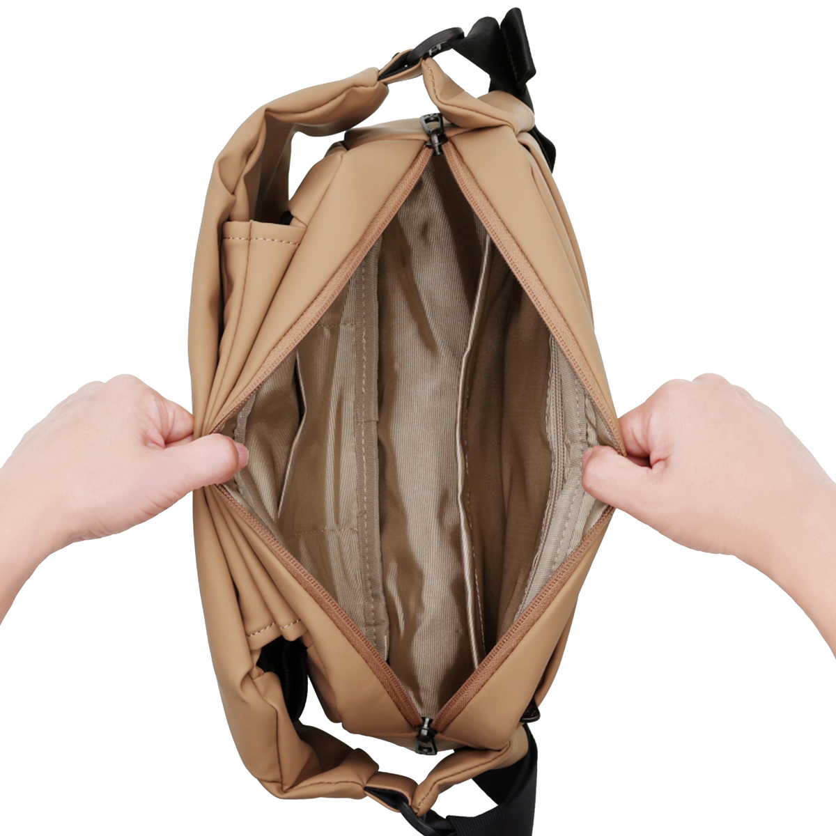 6つのポケットと5つの収納スペースですっきり整頓できるボディバッグ。ペットボトル3本分を収納でき、必要なものを持ち歩くのにちょうど良いサイズ(*1)。サイドクロス構造を採用したドリンクポケットが付いています