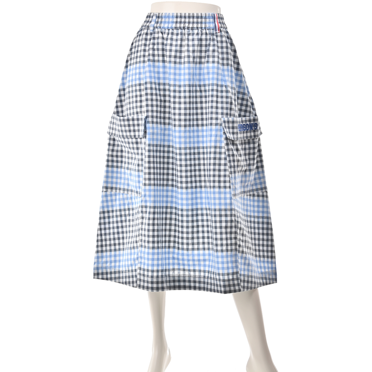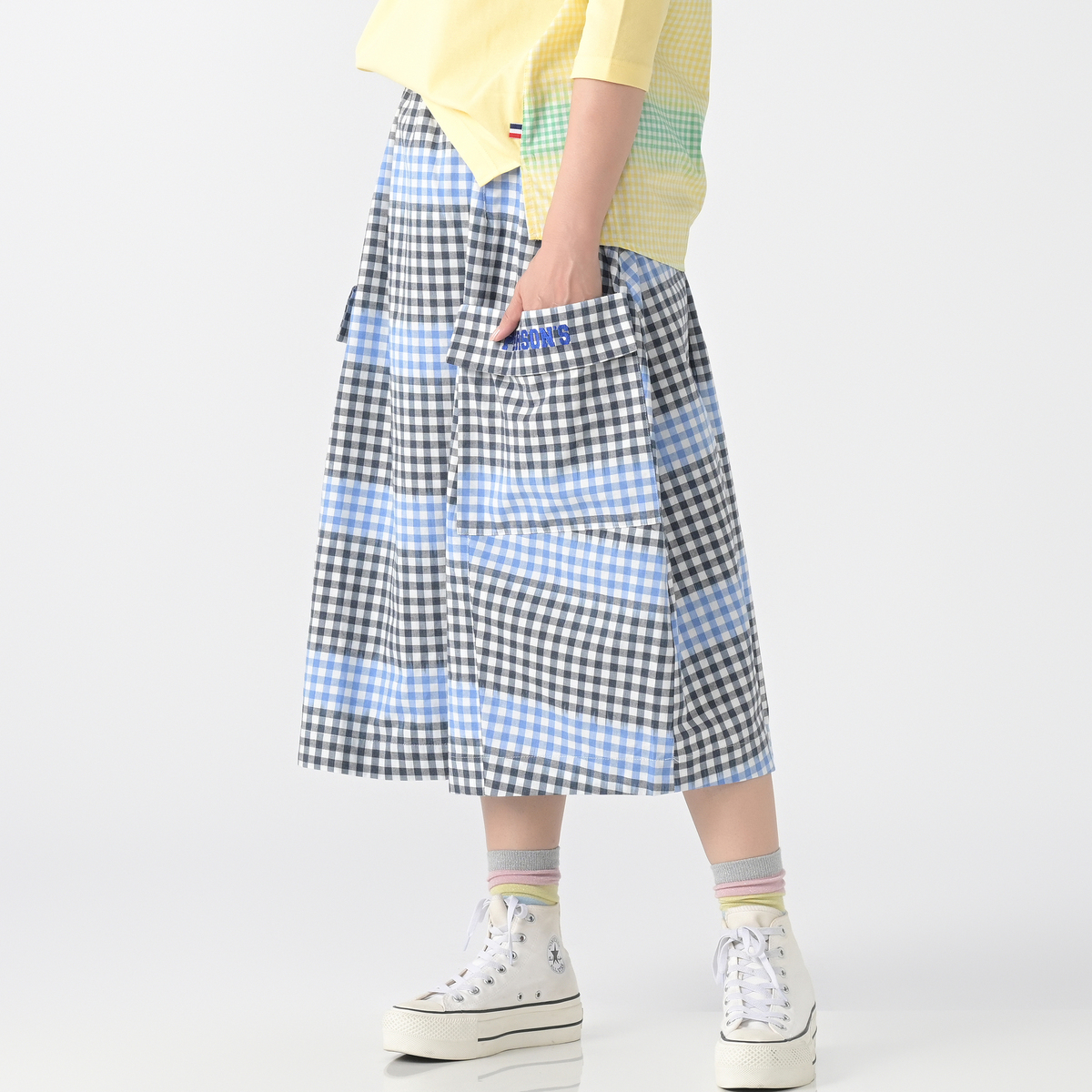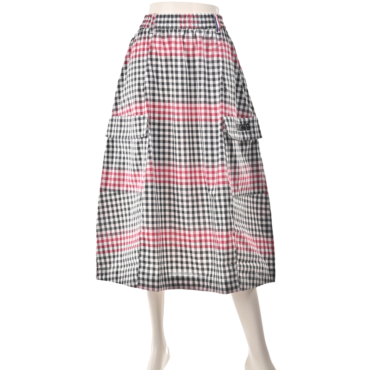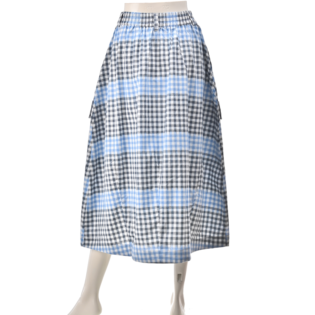 2色使いのグラデーションギンガムチェック素材を使ったバルーンシルエットのスカート。バランス良く着こなせるよう、両脇に大きなアウトポケットを付けています