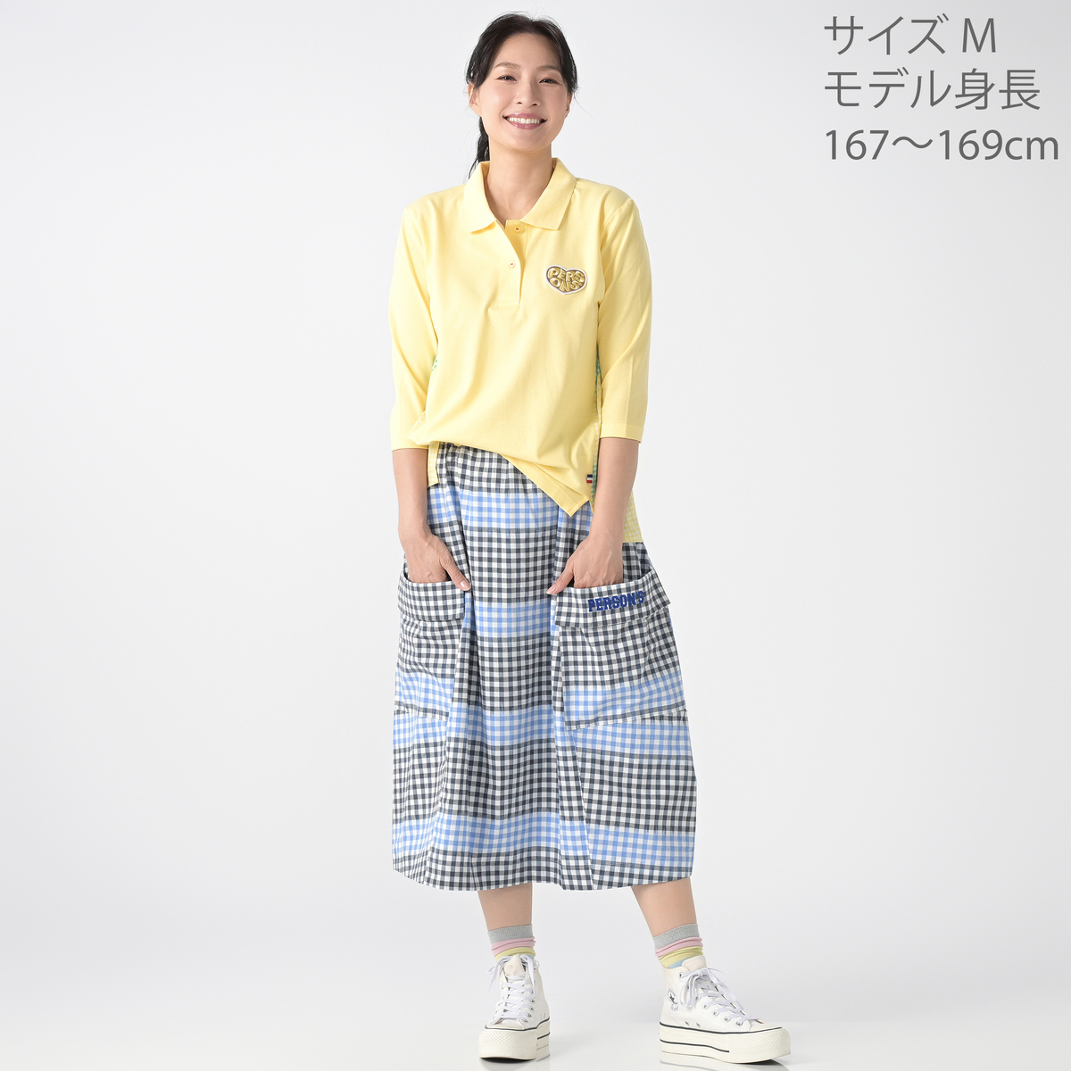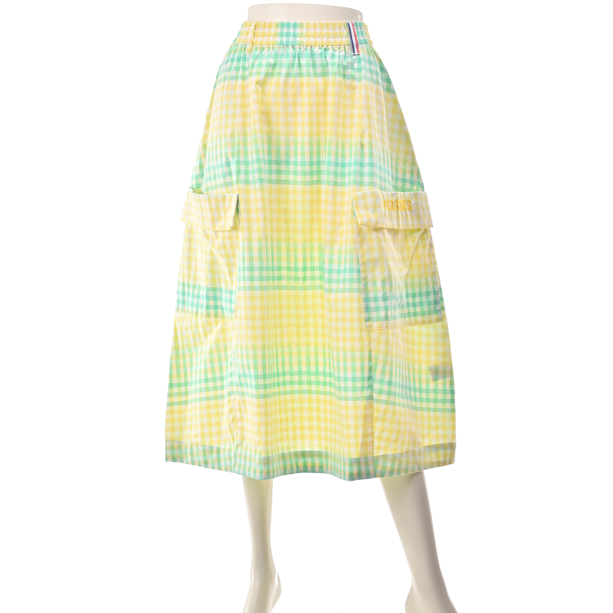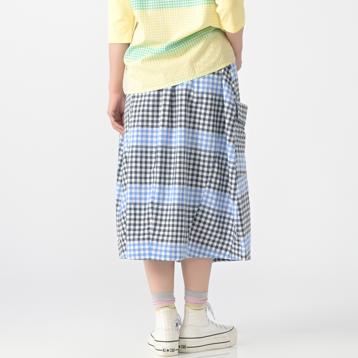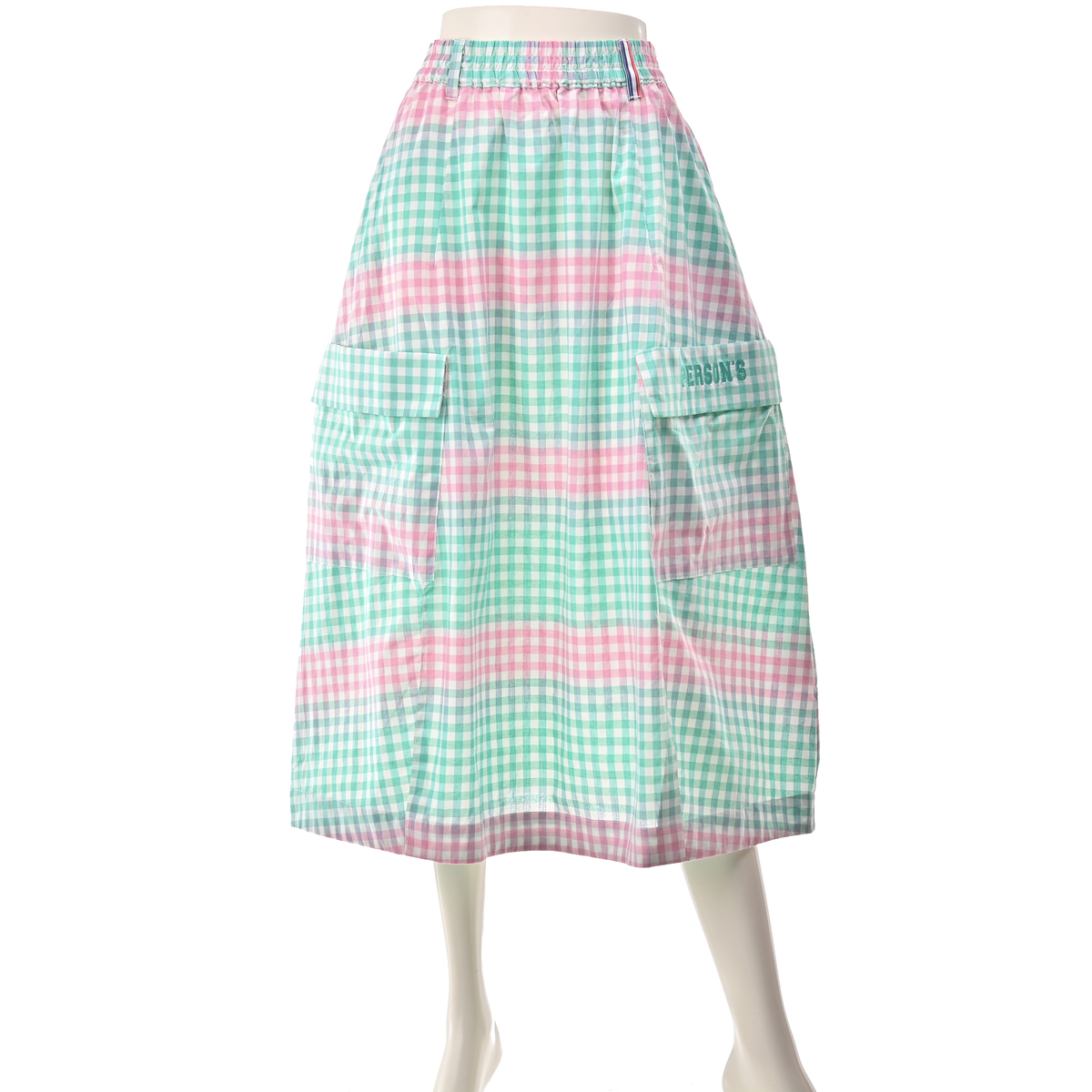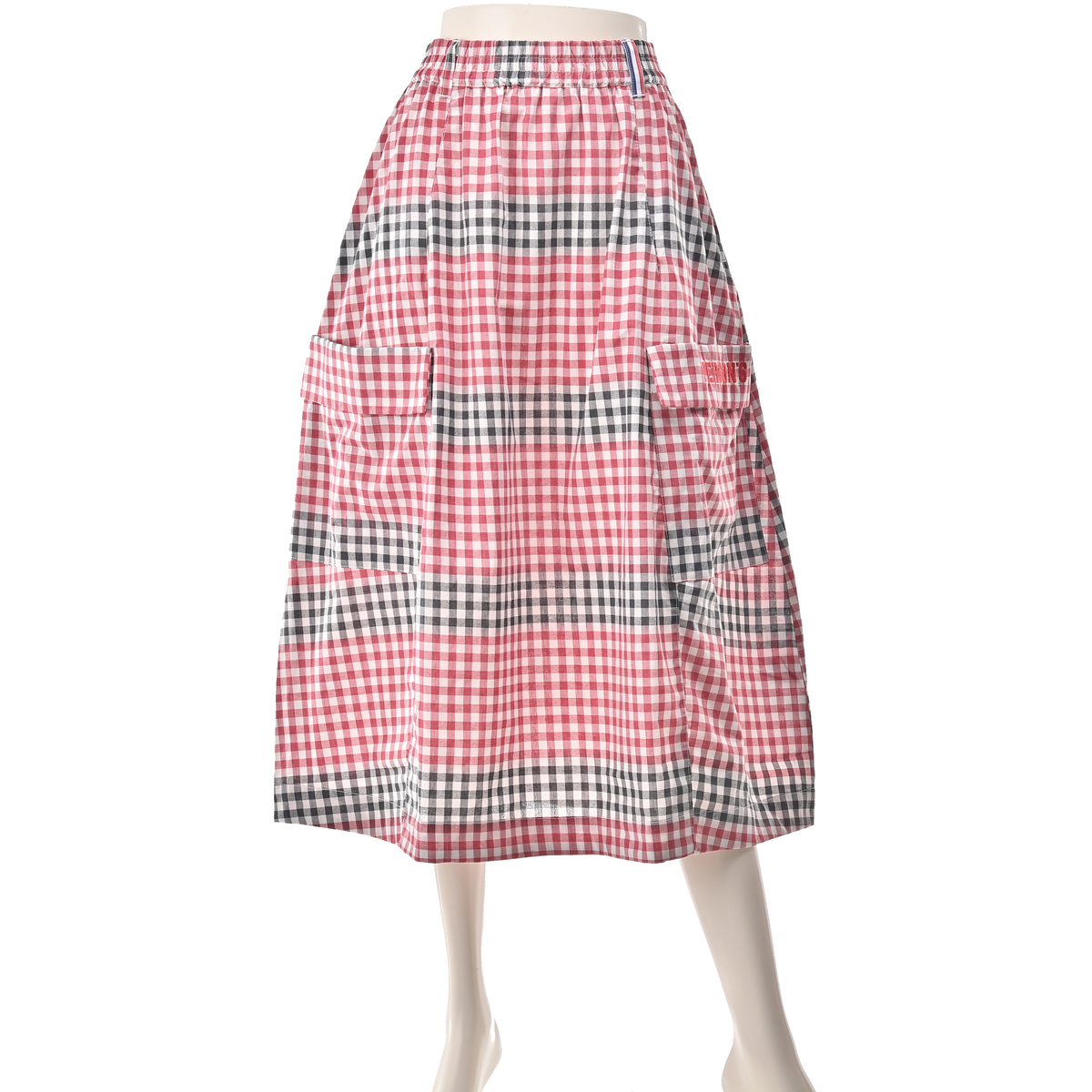 2色使いのグラデーションギンガムチェック素材を使ったバルーンシルエットのスカート。バランス良く着こなせるよう、両脇に大きなアウトポケットを付けています