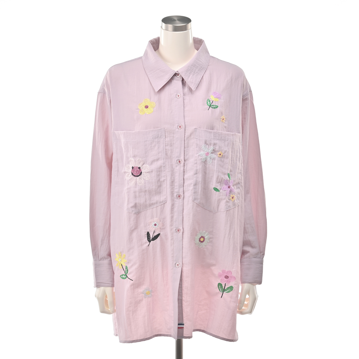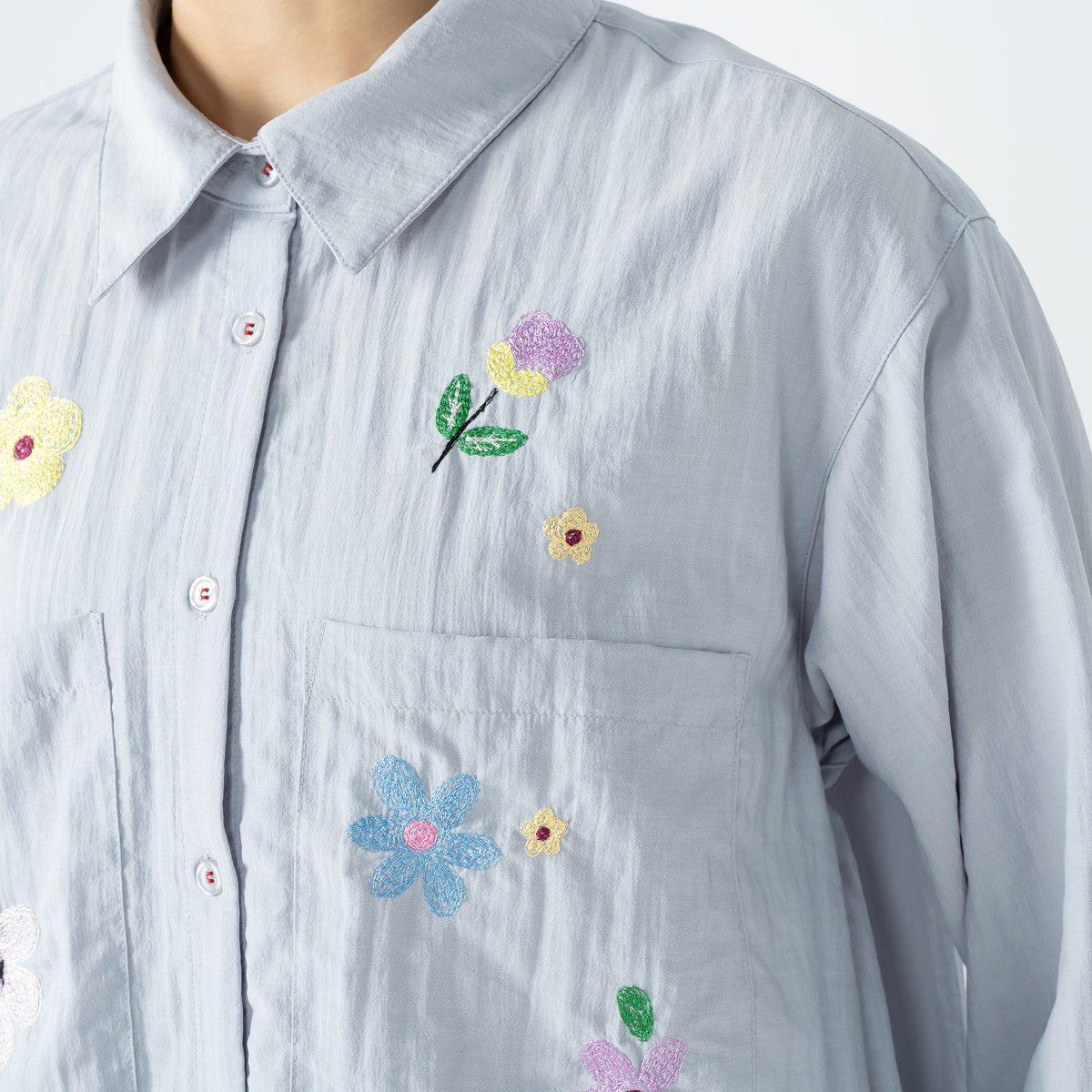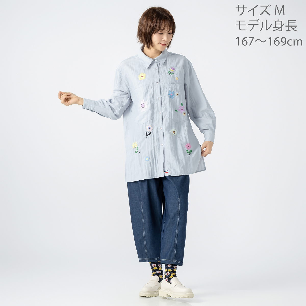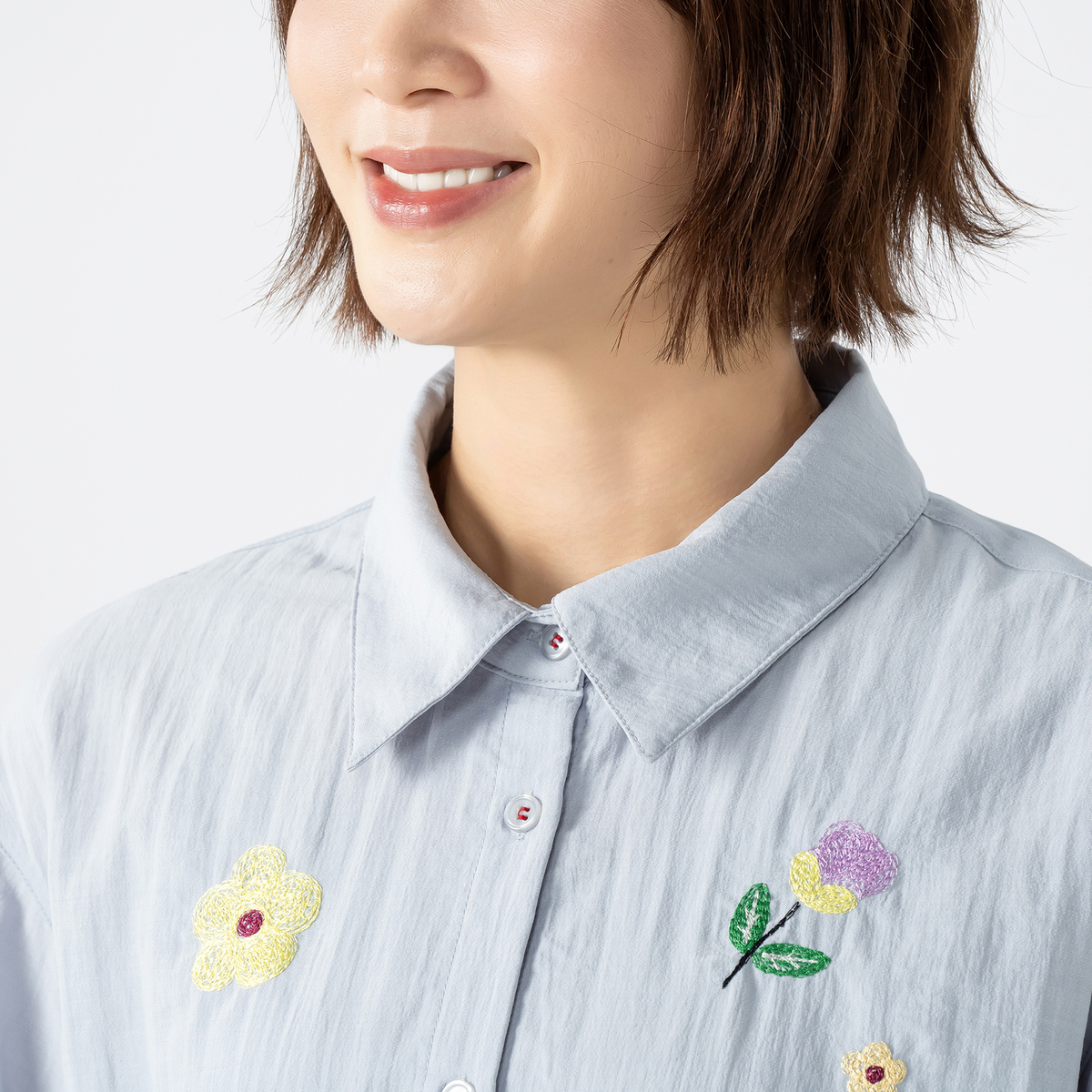 前身頃全体に花の刺繍を施した、ハッピームード溢れるチュニック丈のシャツ。ドライタッチで軽やかな風合いの素材を使用。ゆったりした快適な着心地です