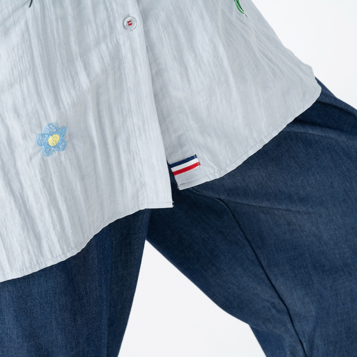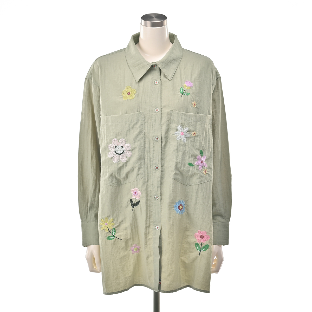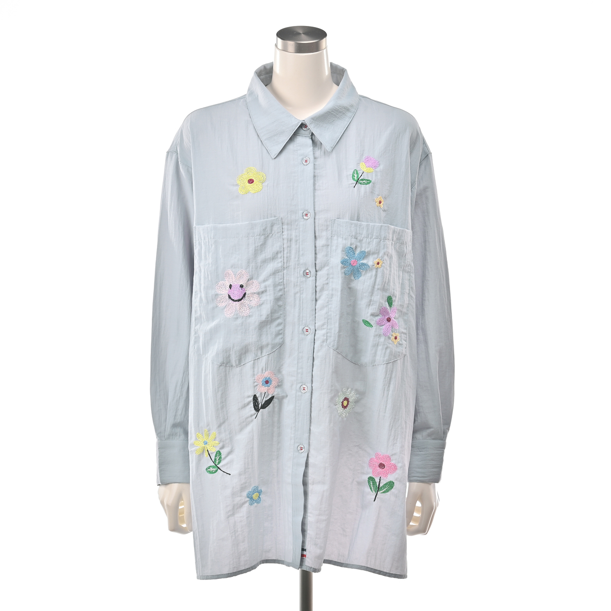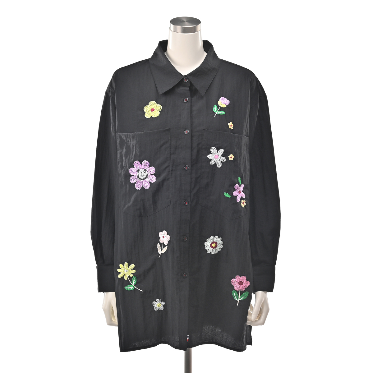前身頃全体に花の刺繍を施した、ハッピームード溢れるチュニック丈のシャツ。ドライタッチで軽やかな風合いの素材を使用。ゆったりした快適な着心地です