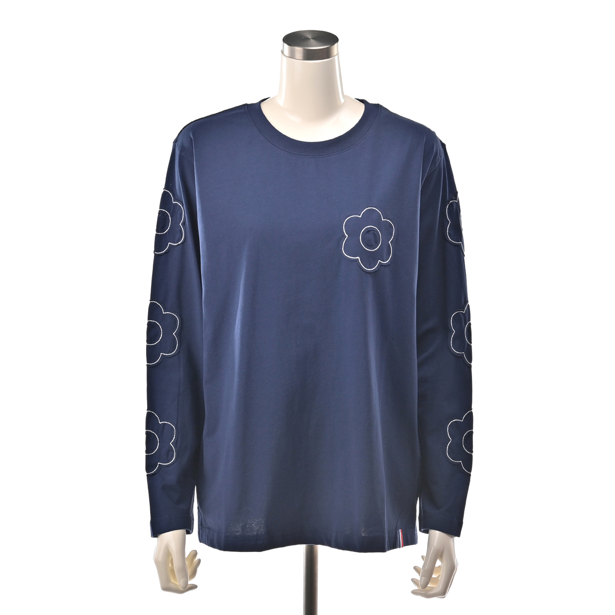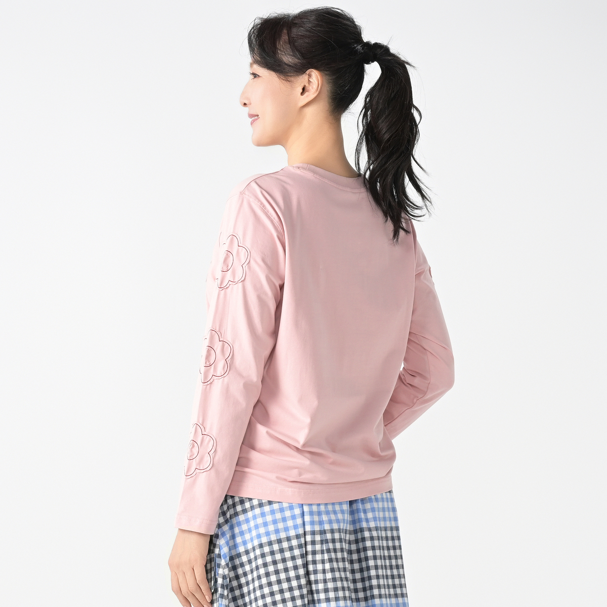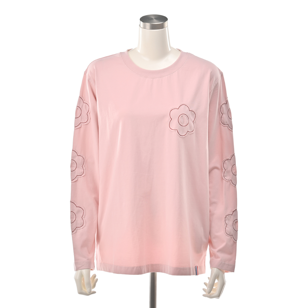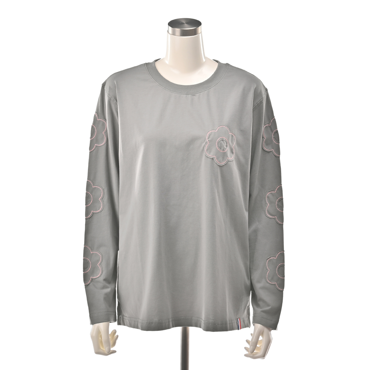 両袖と胸に共生地の花型アップリケをあしらった長袖Tシャツです。配色ステッチがアクセントになり、シンプルな装いにも個性をプラス。さらりとしたストレッチ性カットソー素材を使い、ゆったりとした着心地を楽しめます