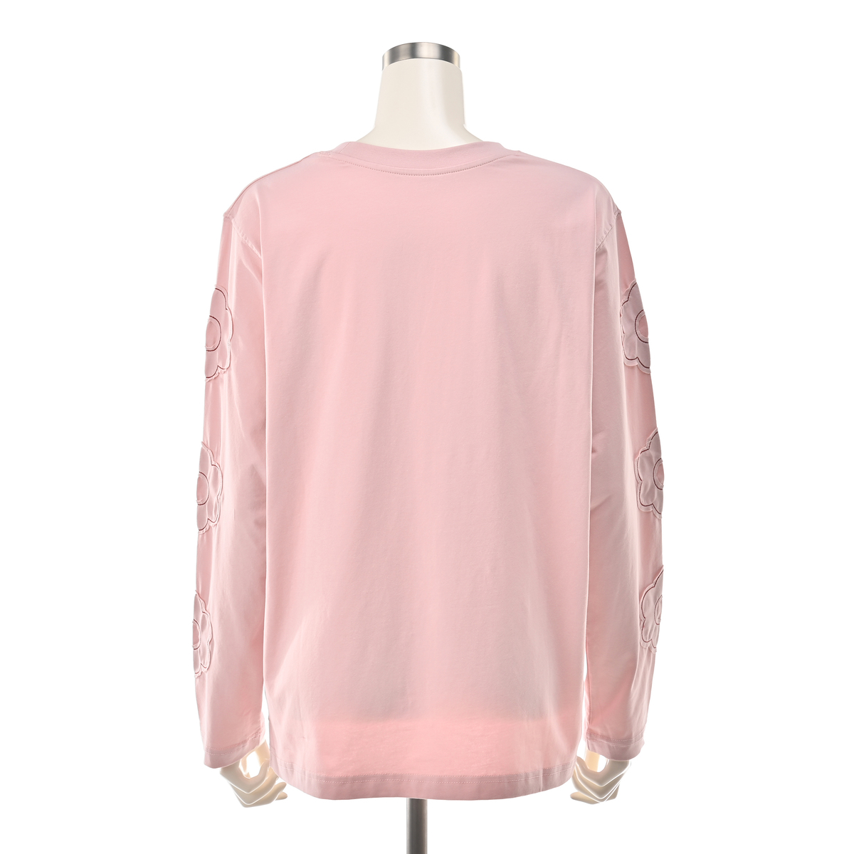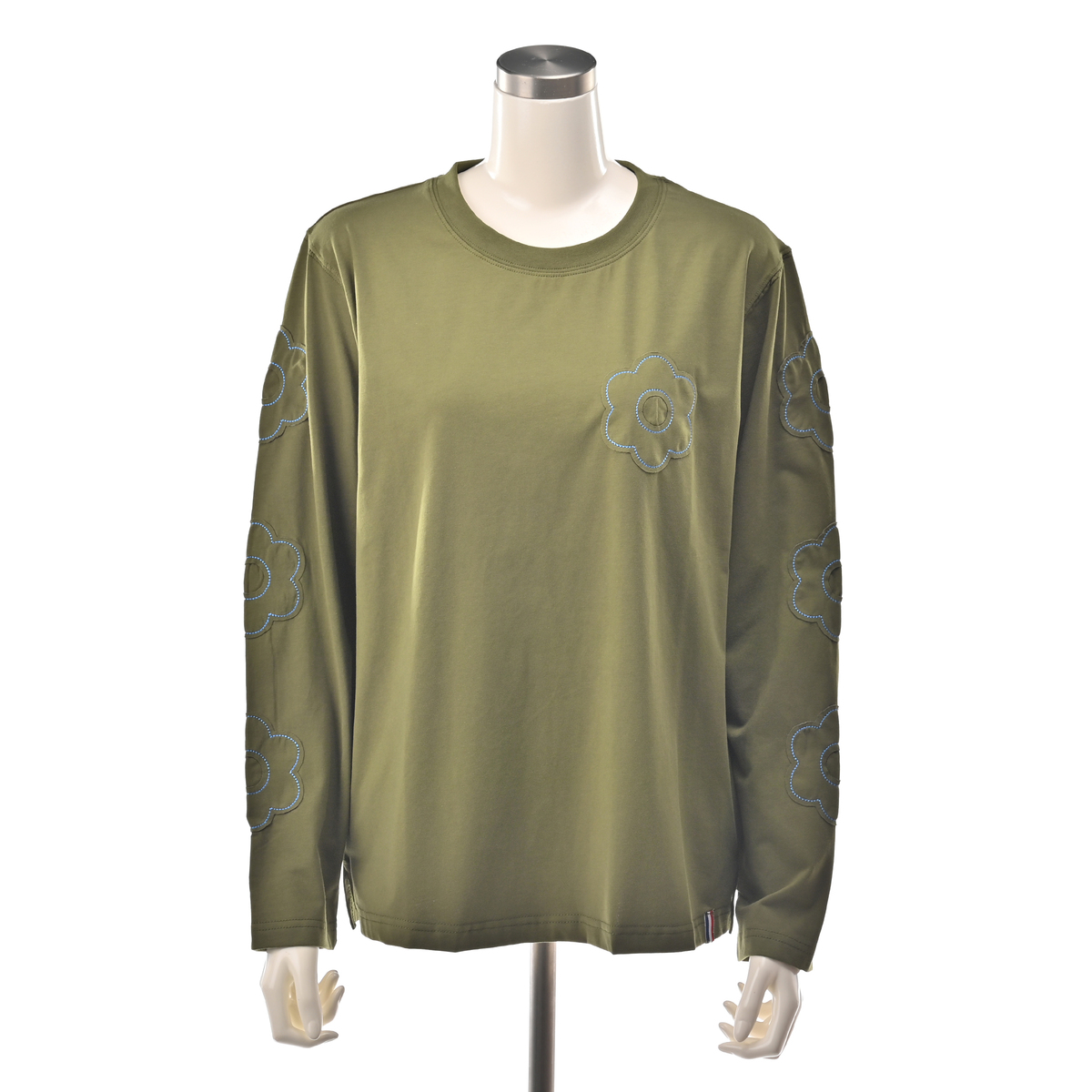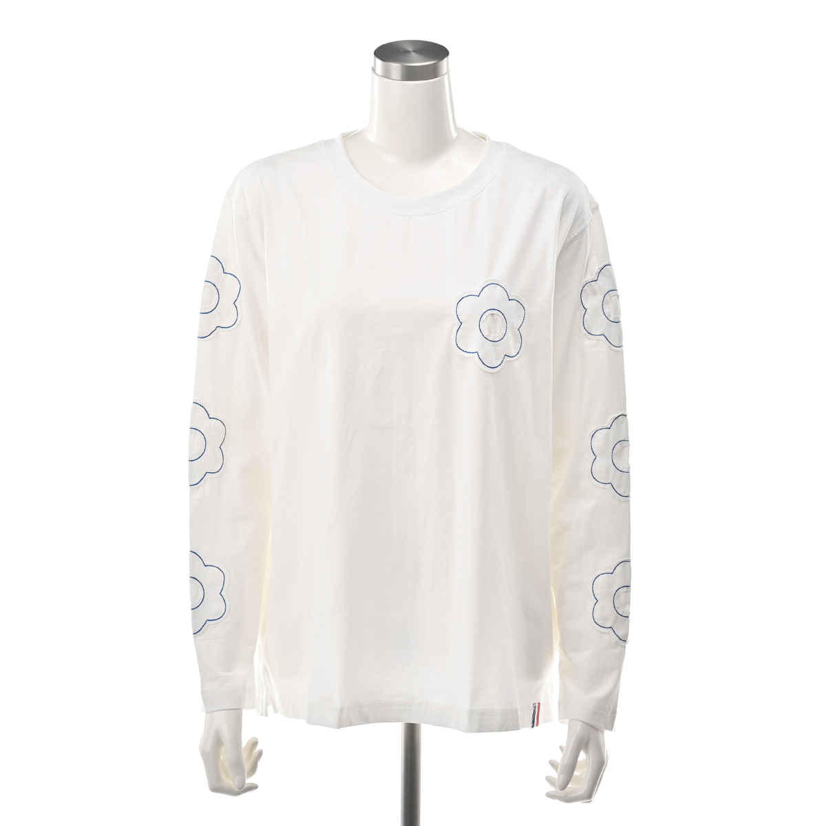 両袖と胸に共生地の花型アップリケをあしらった長袖Tシャツです。配色ステッチがアクセントになり、シンプルな装いにも個性をプラス。さらりとしたストレッチ性カットソー素材を使い、ゆったりとした着心地を楽しめます