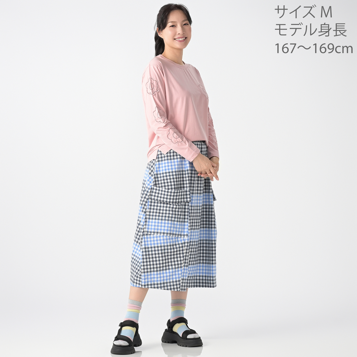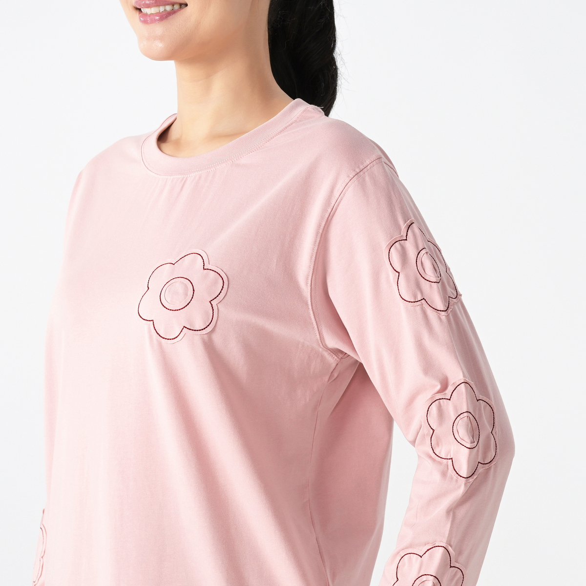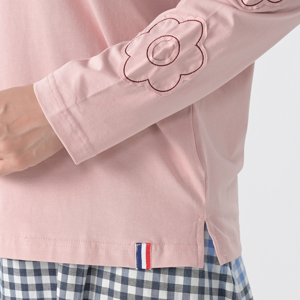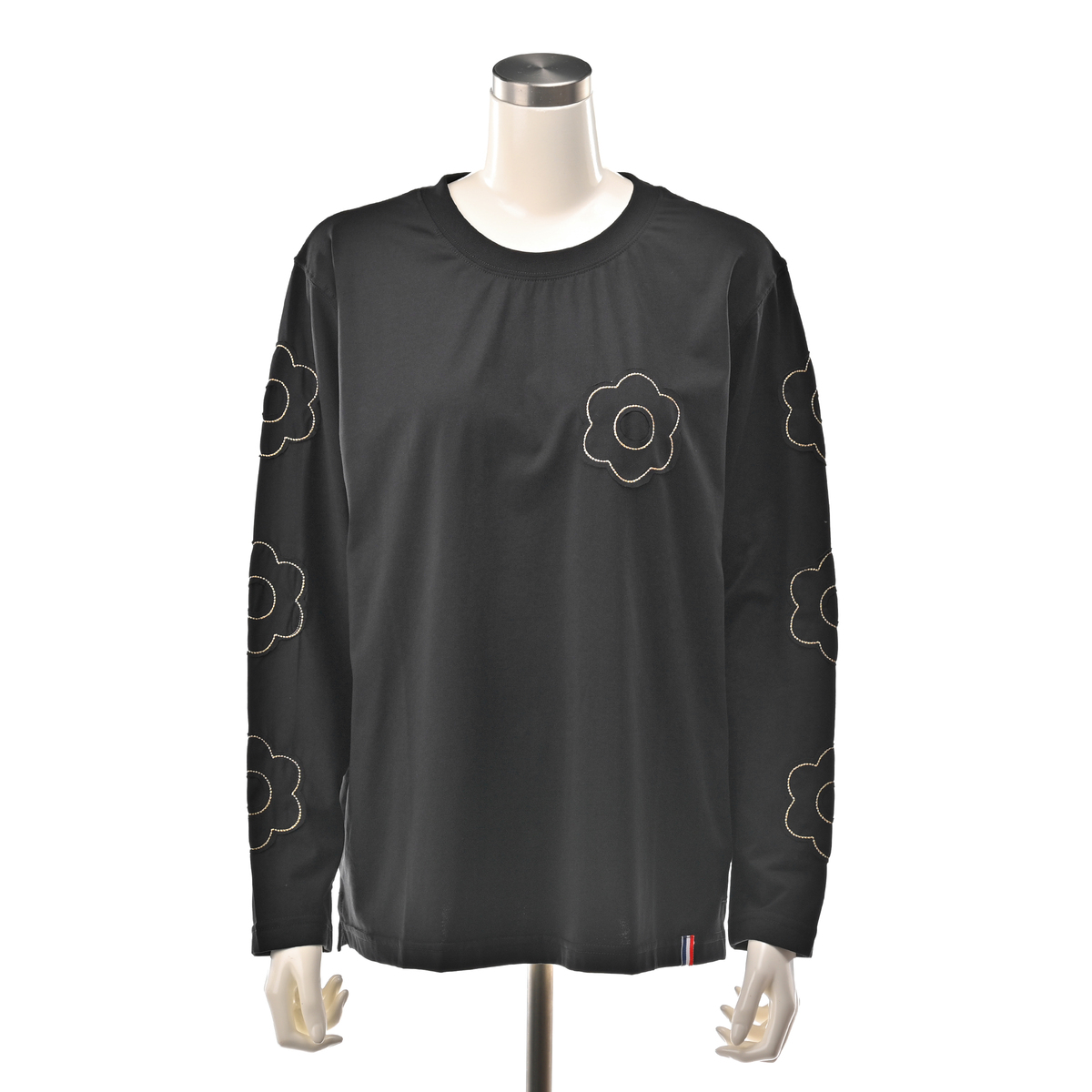 両袖と胸に共生地の花型アップリケをあしらった長袖Tシャツです。配色ステッチがアクセントになり、シンプルな装いにも個性をプラス。さらりとしたストレッチ性カットソー素材を使い、ゆったりとした着心地を楽しめます