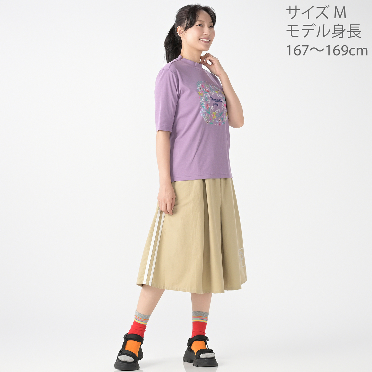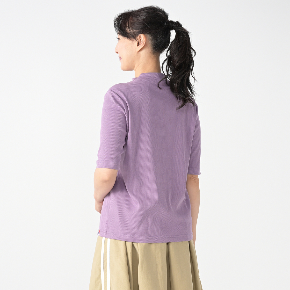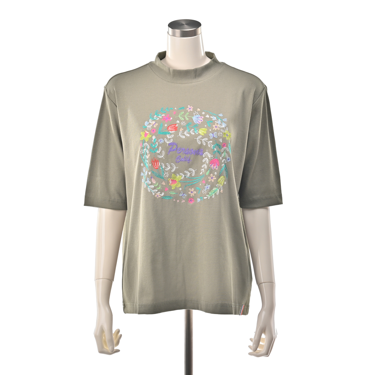 胸元に多色使いの大きめ花リース刺繍をあしらったTシャツです。五分袖とモックネックの組合せで、すっきりとした印象に仕上げています
