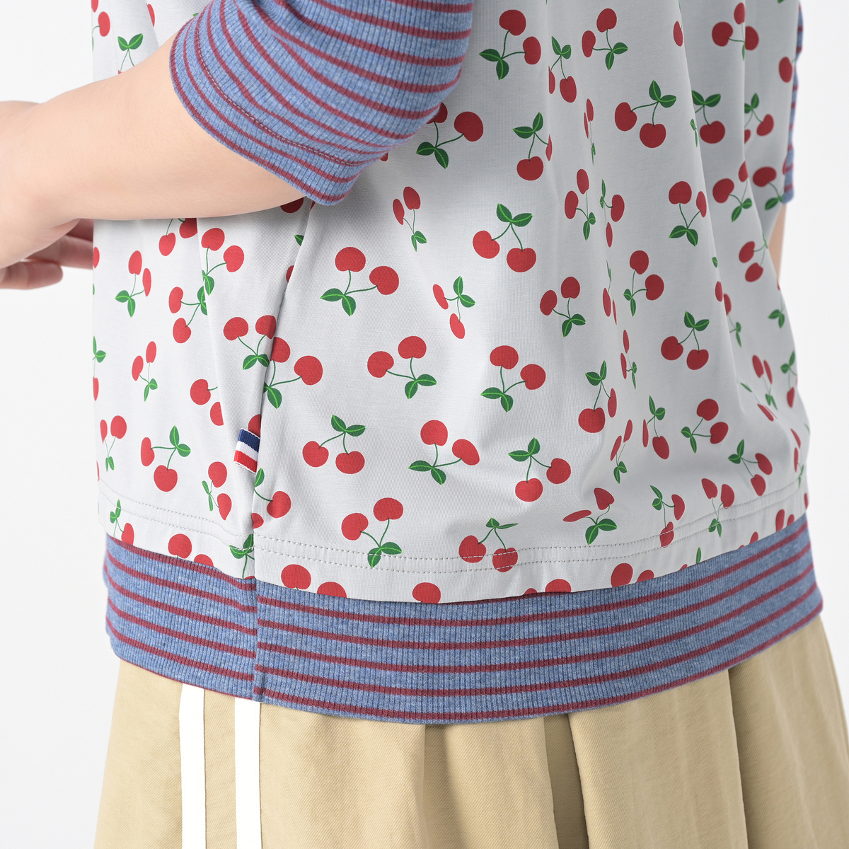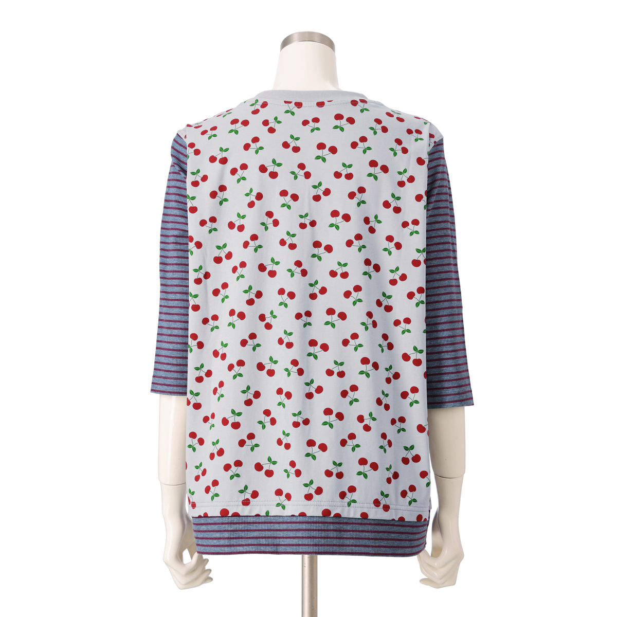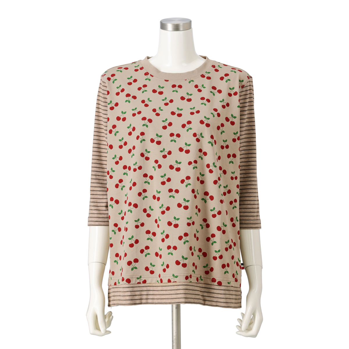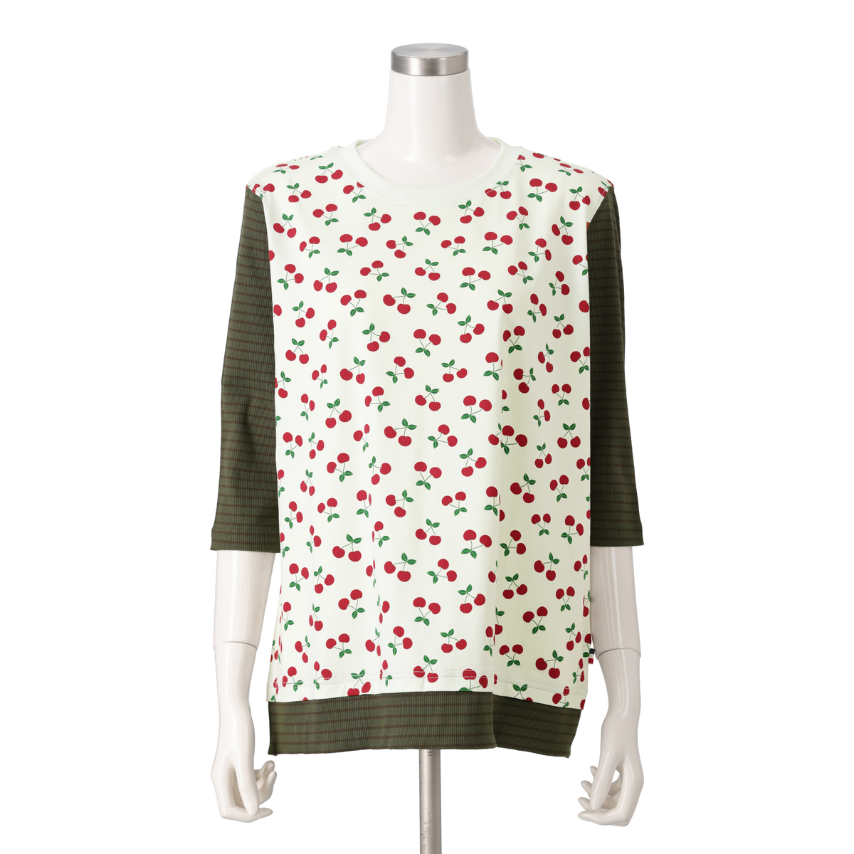 さくらんぼの総柄プリントを前後身頃にあしらったTシャツ。袖と裾にはテレコボーダー素材を組合せた、レイヤード風の仕上がりです。前後身頃はストレッチ性のあるカットソー素材で、7分袖が気になる肘周りをカバーします