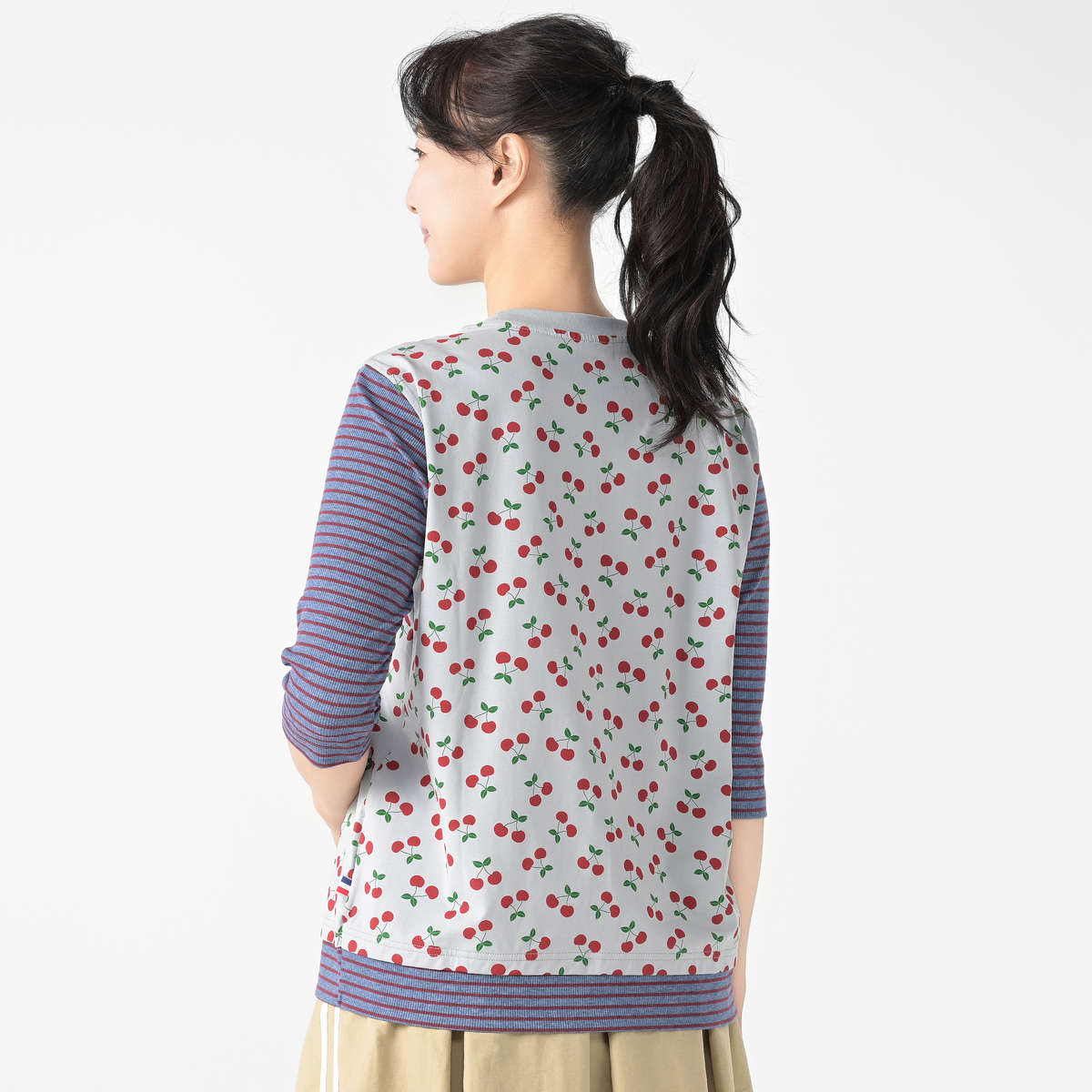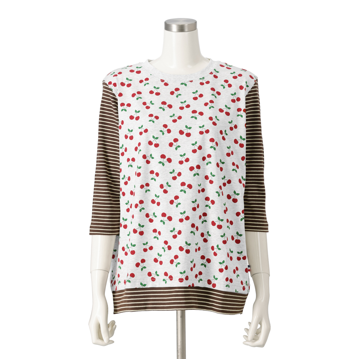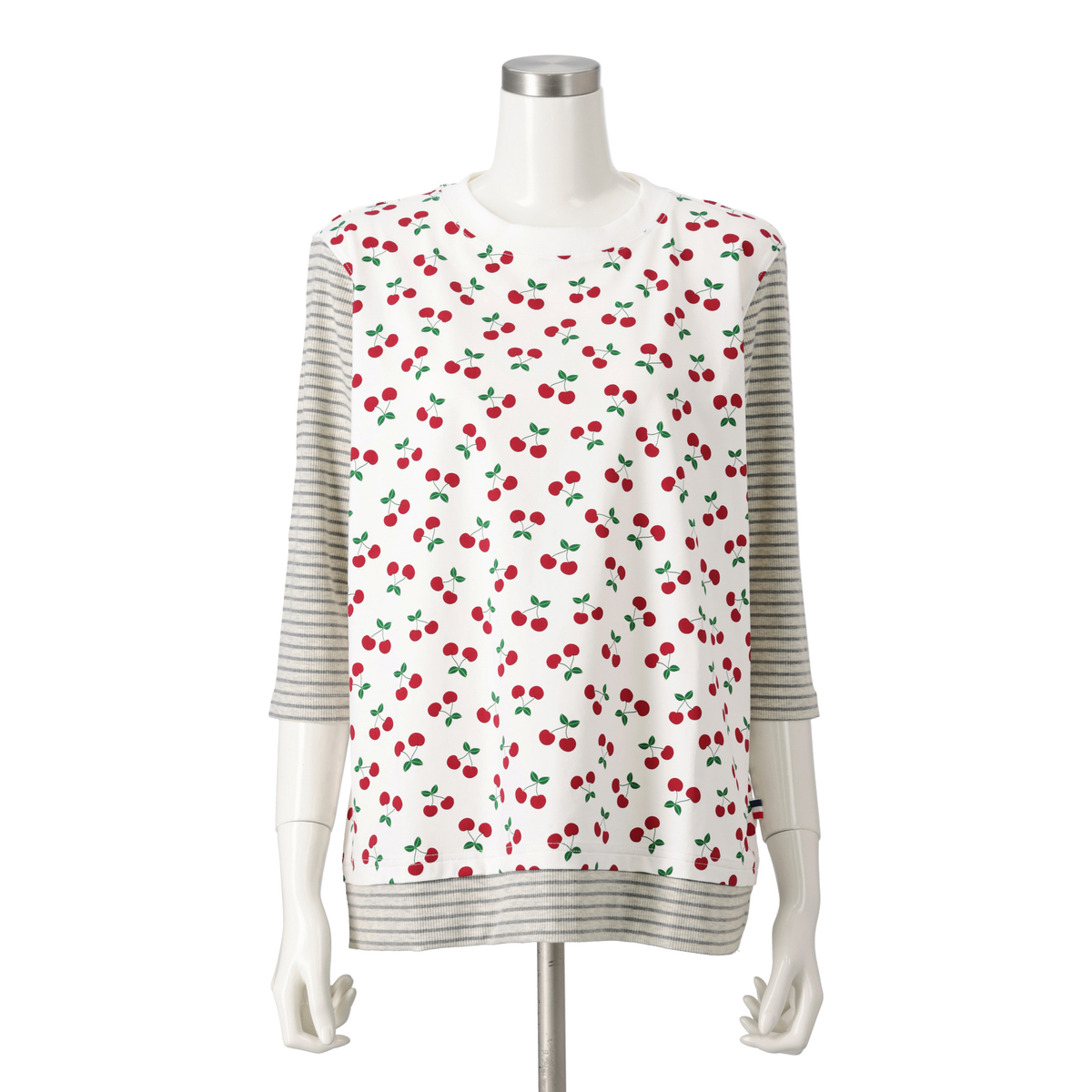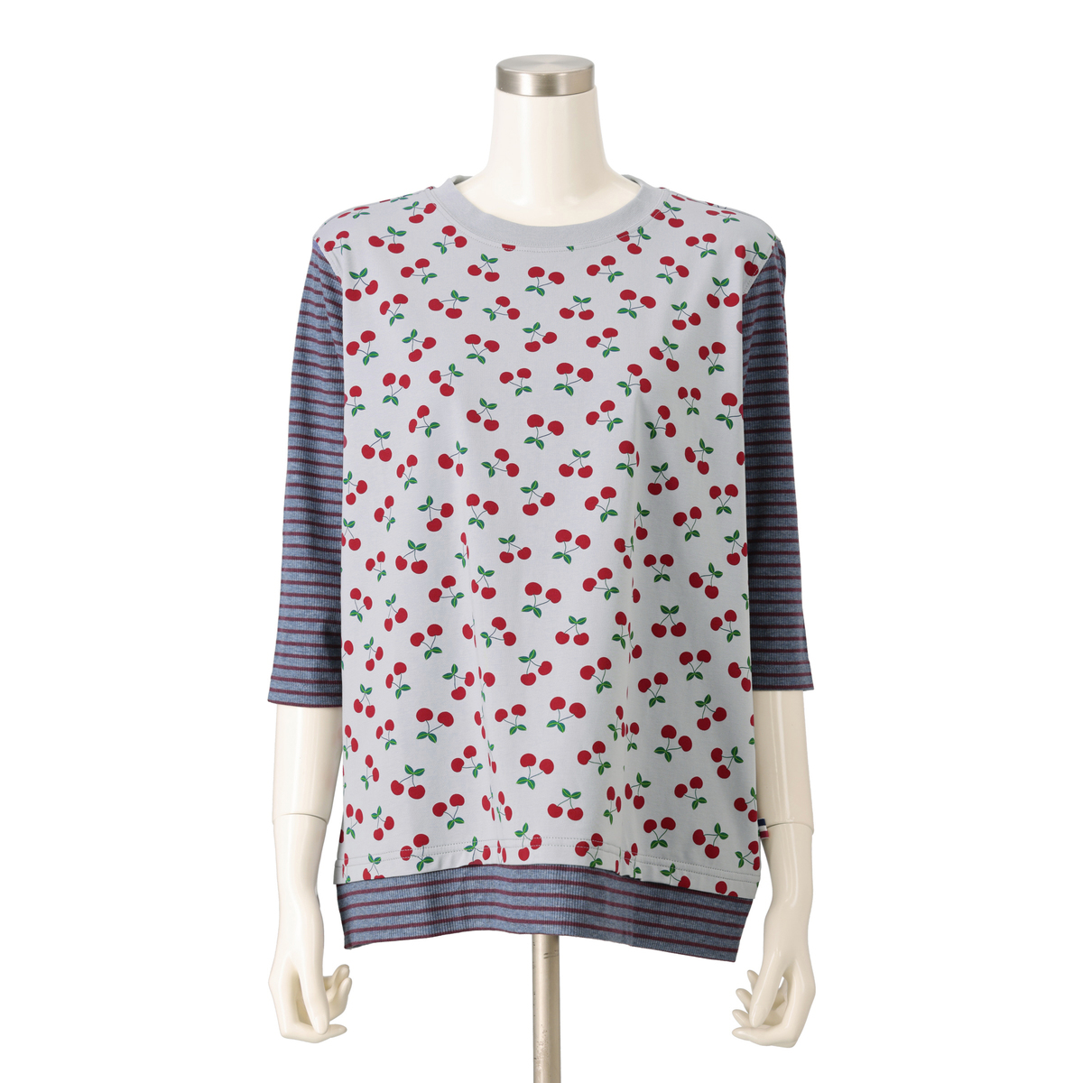 さくらんぼの総柄プリントを前後身頃にあしらったTシャツ。袖と裾にはテレコボーダー素材を組合せた、レイヤード風の仕上がりです。前後身頃はストレッチ性のあるカットソー素材で、7分袖が気になる肘周りをカバーします
