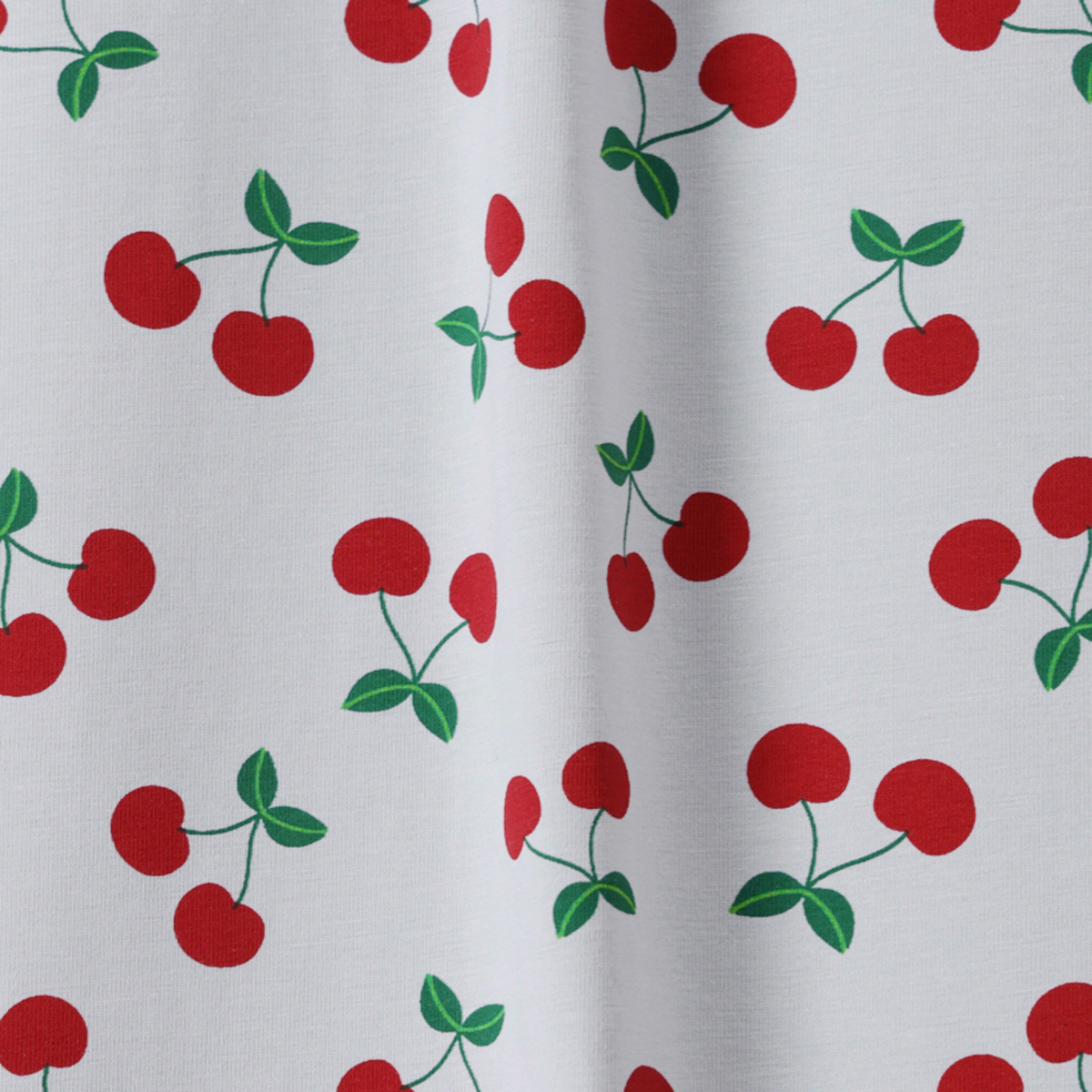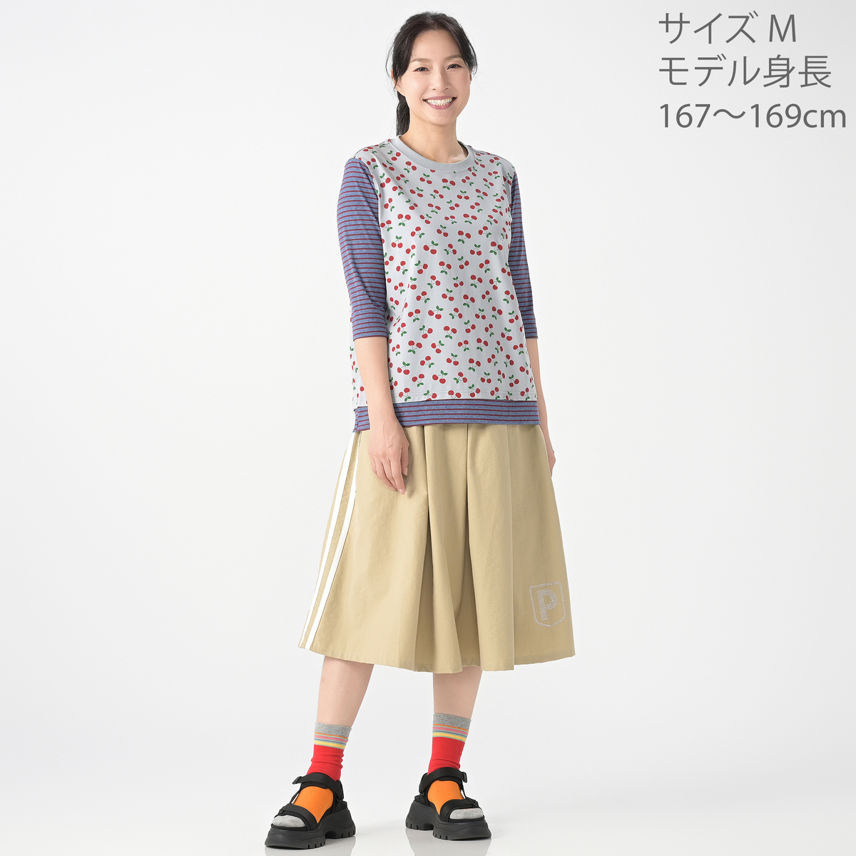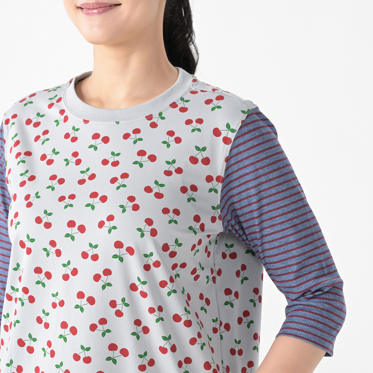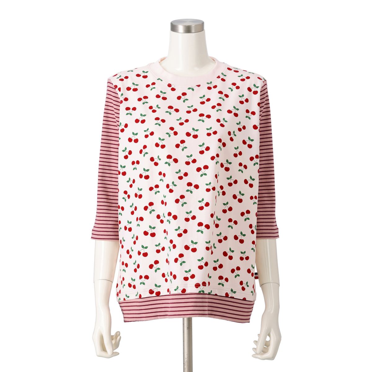 さくらんぼの総柄プリントを前後身頃にあしらったTシャツ。袖と裾にはテレコボーダー素材を組合せた、レイヤード風の仕上がりです。前後身頃はストレッチ性のあるカットソー素材で、7分袖が気になる肘周りをカバーします