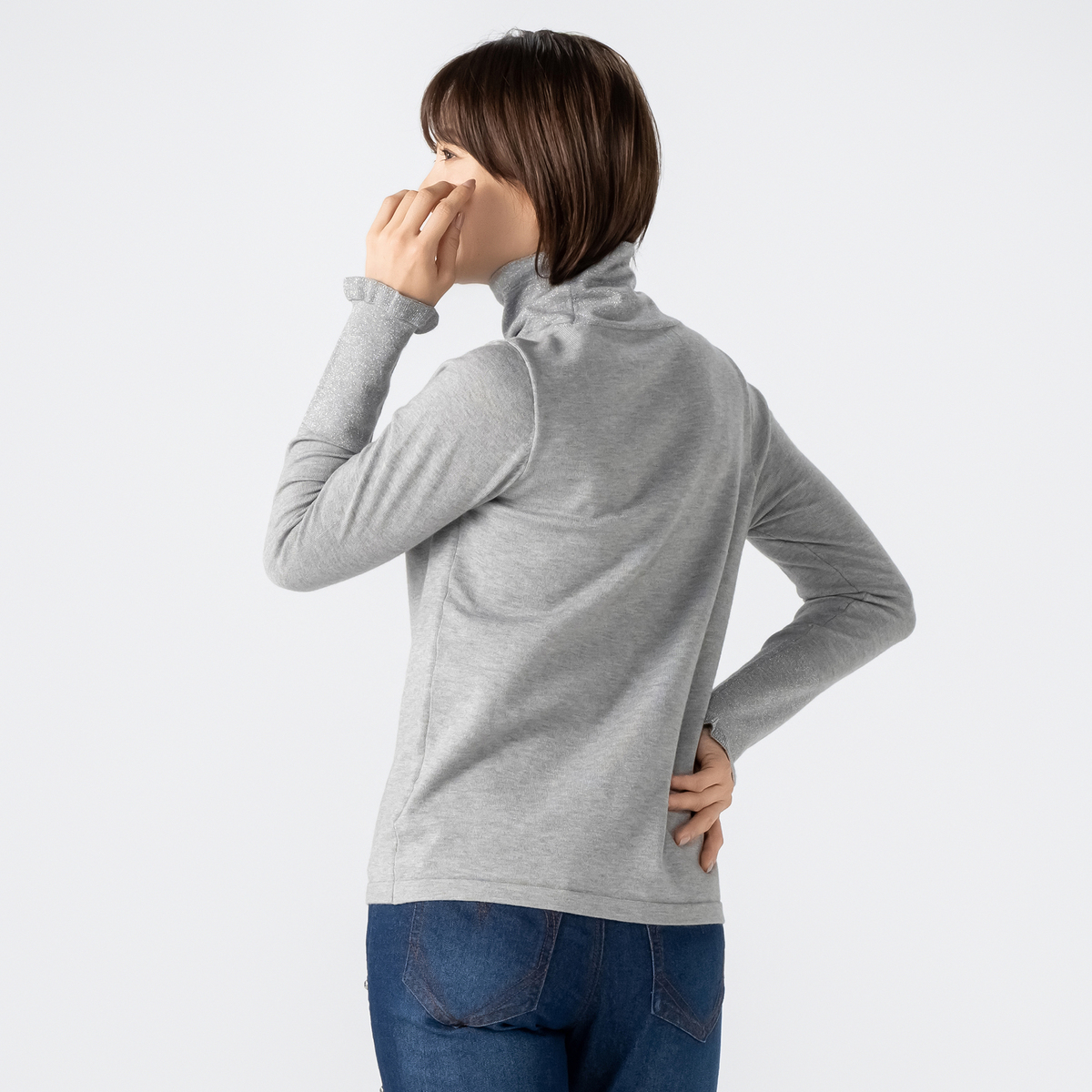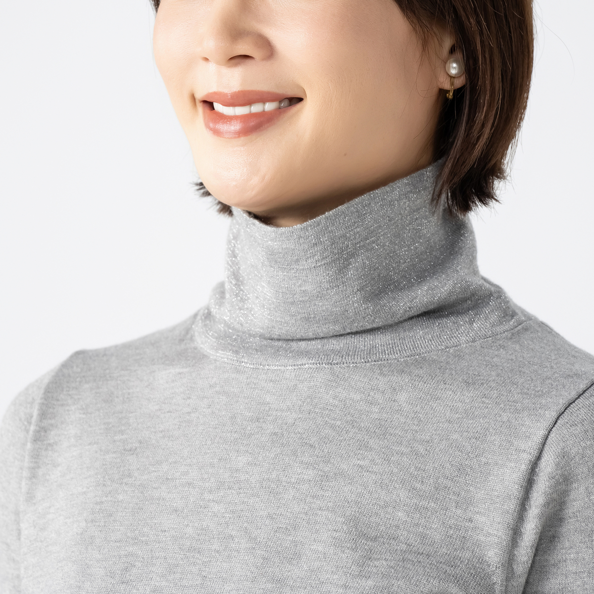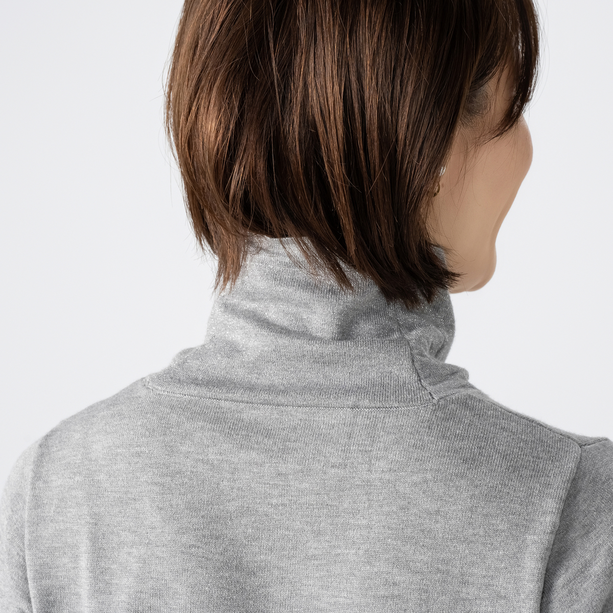衿はW付け仕様で、ラメが直接肌に触れない工夫を施しました。シンプルなタートルネックなので、ジャケットやコートのインナーとしても使いやすく、デイリーからお出かけまで幅広く活躍します