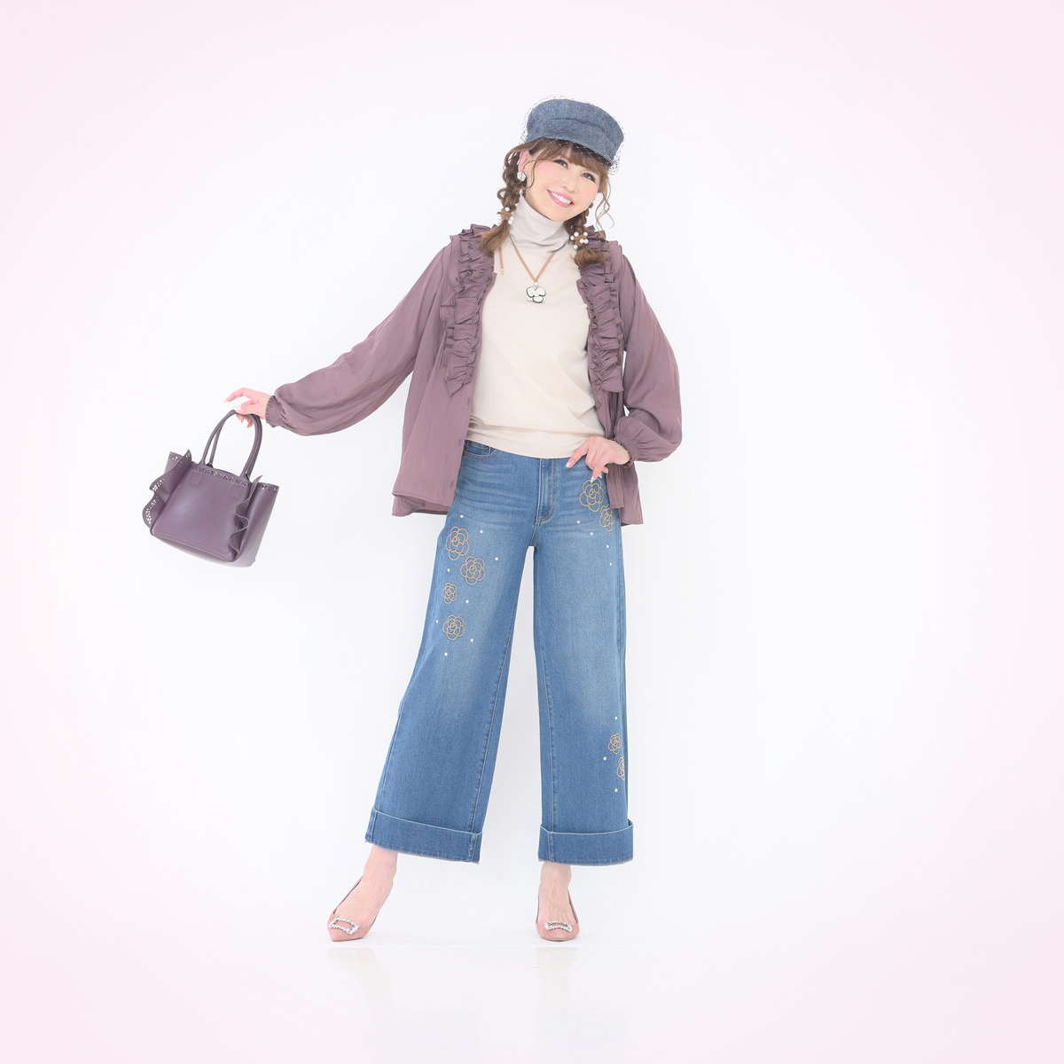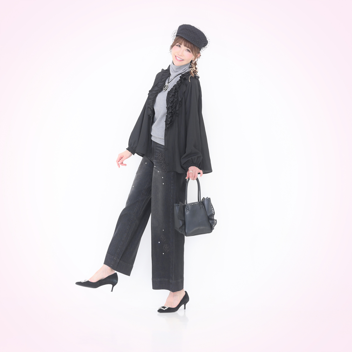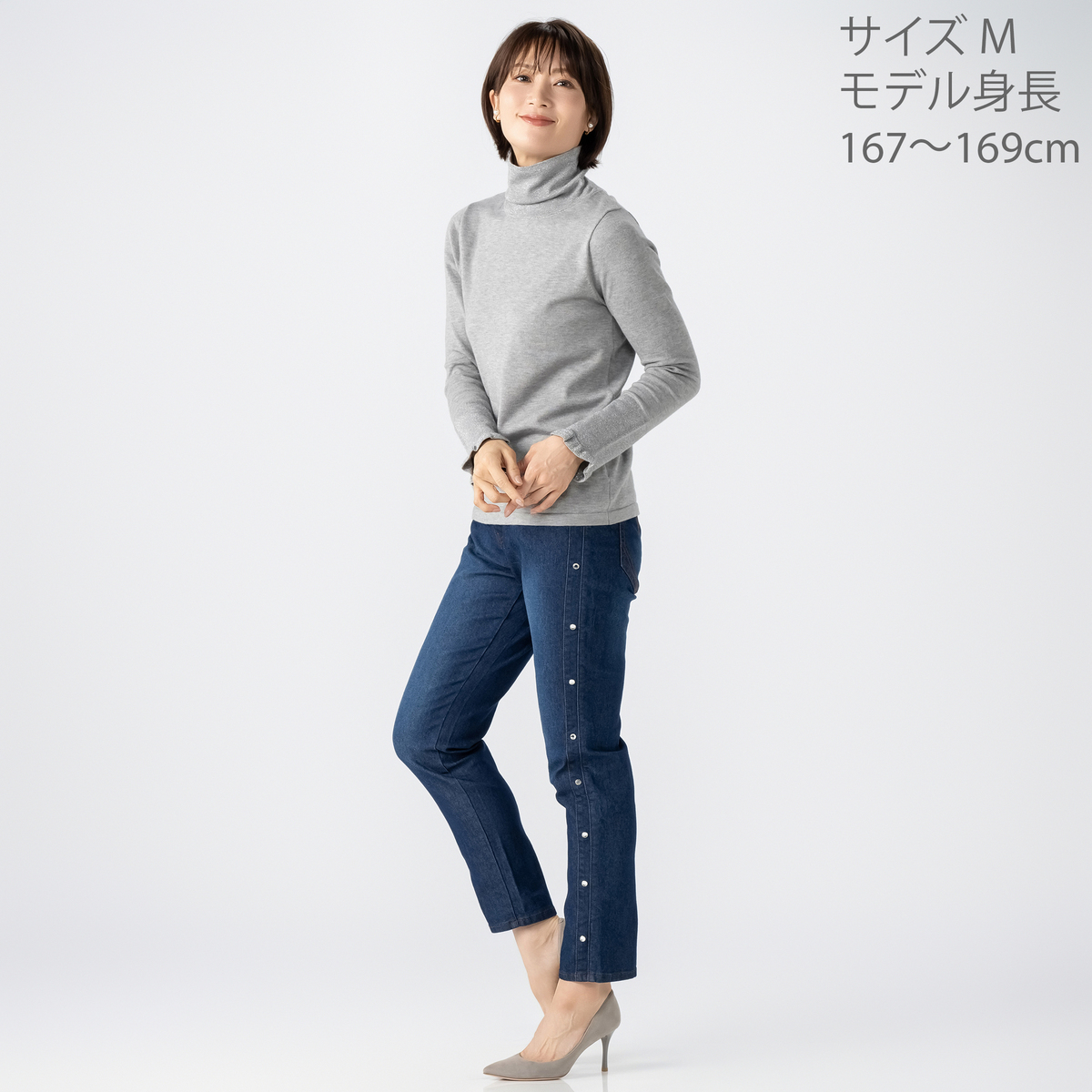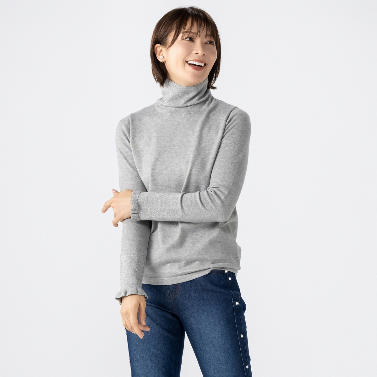 衿はW付け仕様で、ラメが直接肌に触れない工夫を施しました。シンプルなタートルネックなので、ジャケットやコートのインナーとしても使いやすく、デイリーからお出かけまで幅広く活躍します