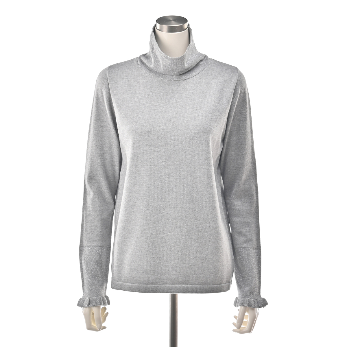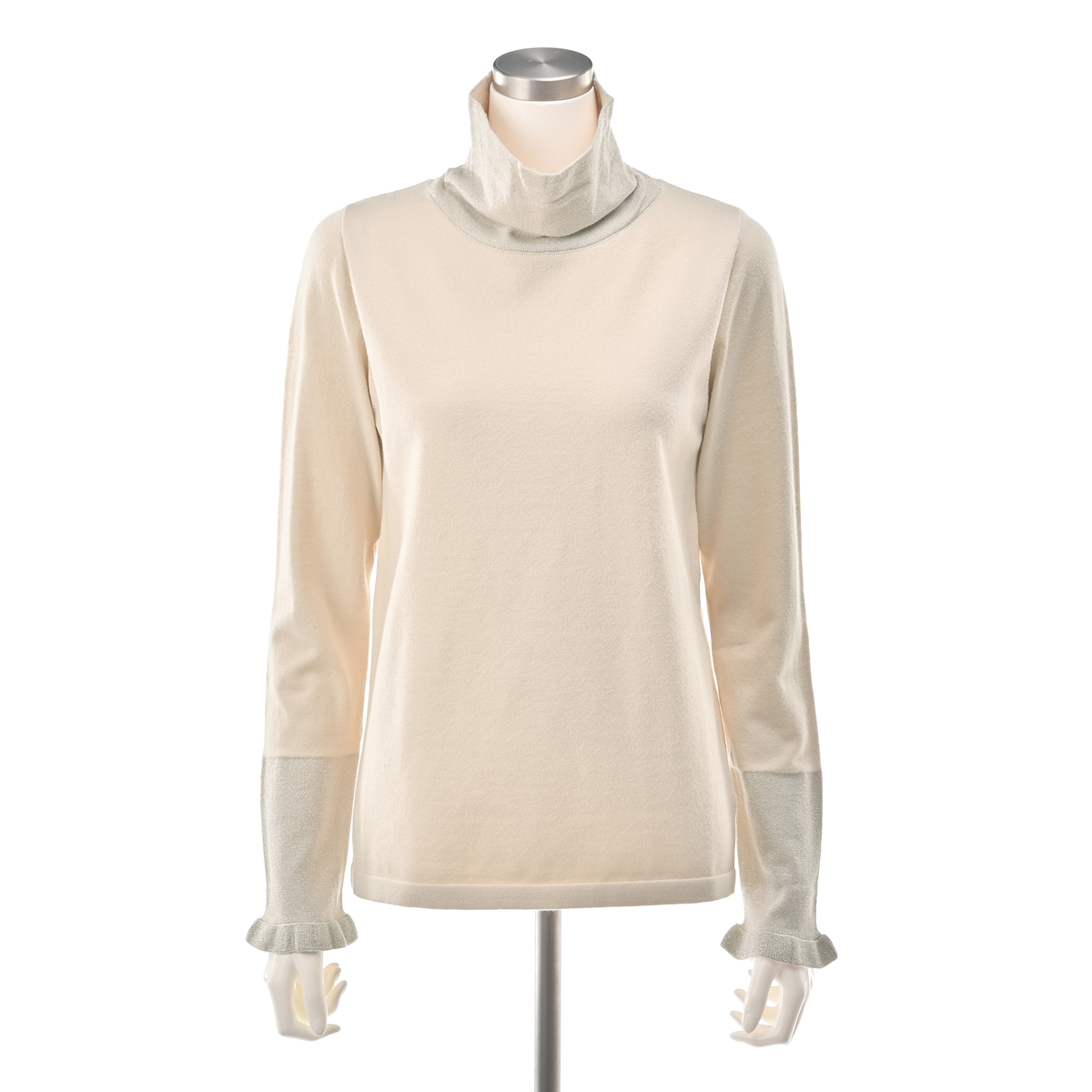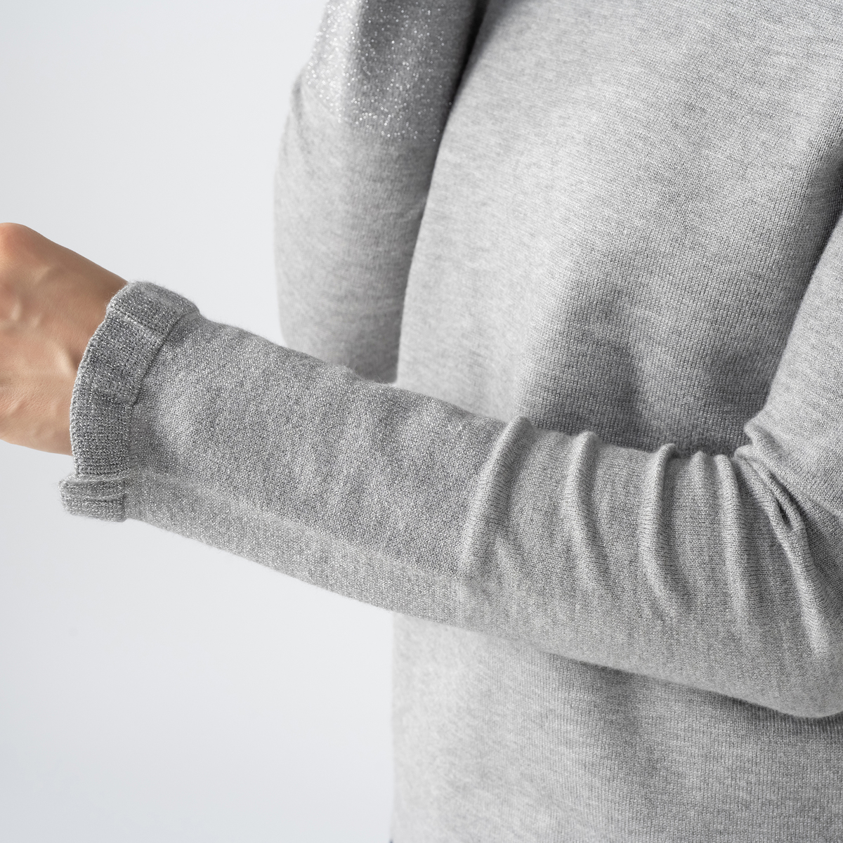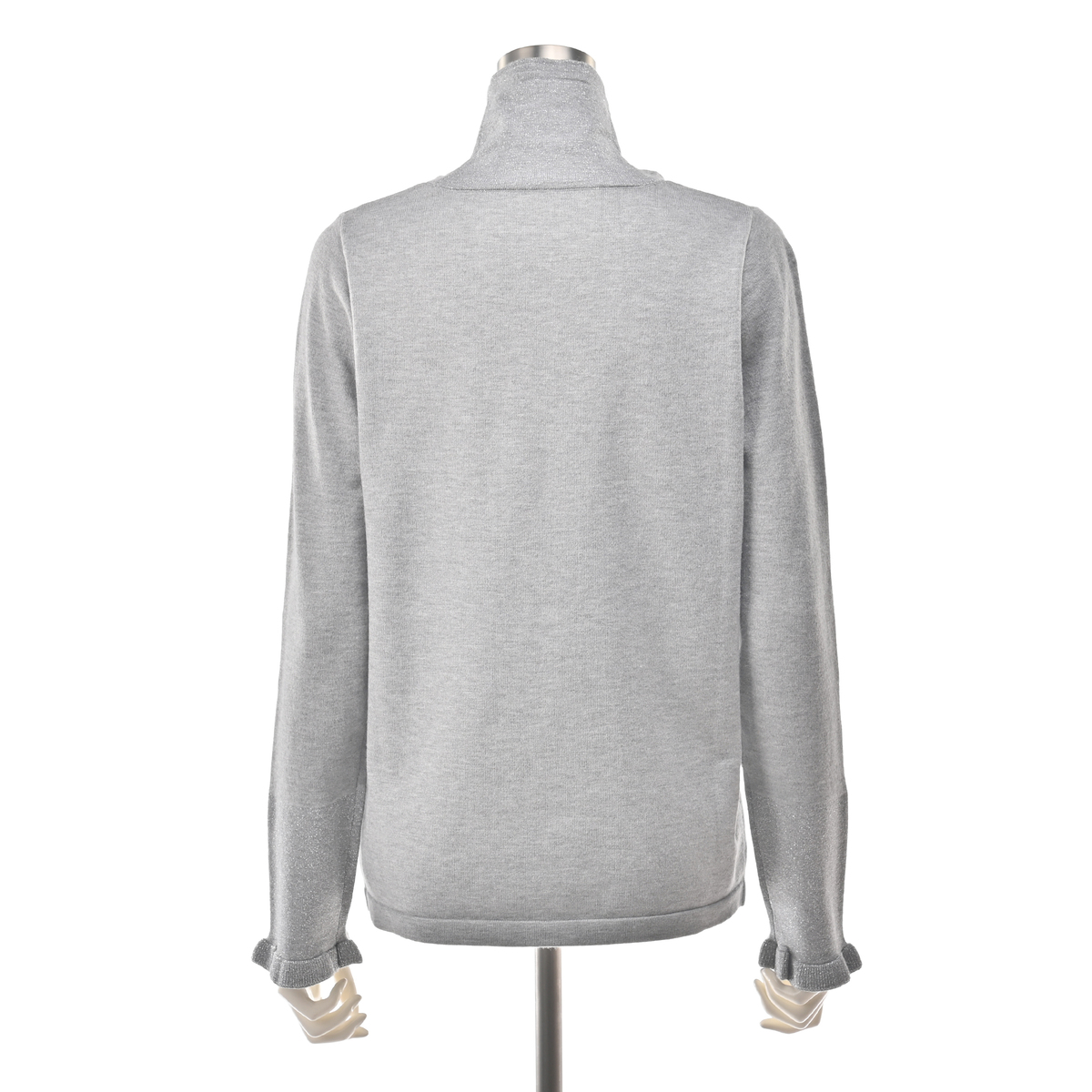 衿と袖口に上品なラメをあしらい、華やかさをプラスしたプルオーバー。柔らかくもちもちとした素材に伸縮糸をプレーティングすることで、12ゲージ天竺でもしっかりとした編地に仕上げました。シンプルな衿は、立体感のあるオフタートルとしても着用できます