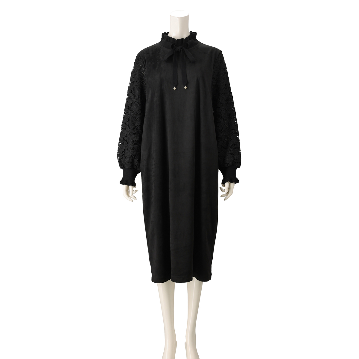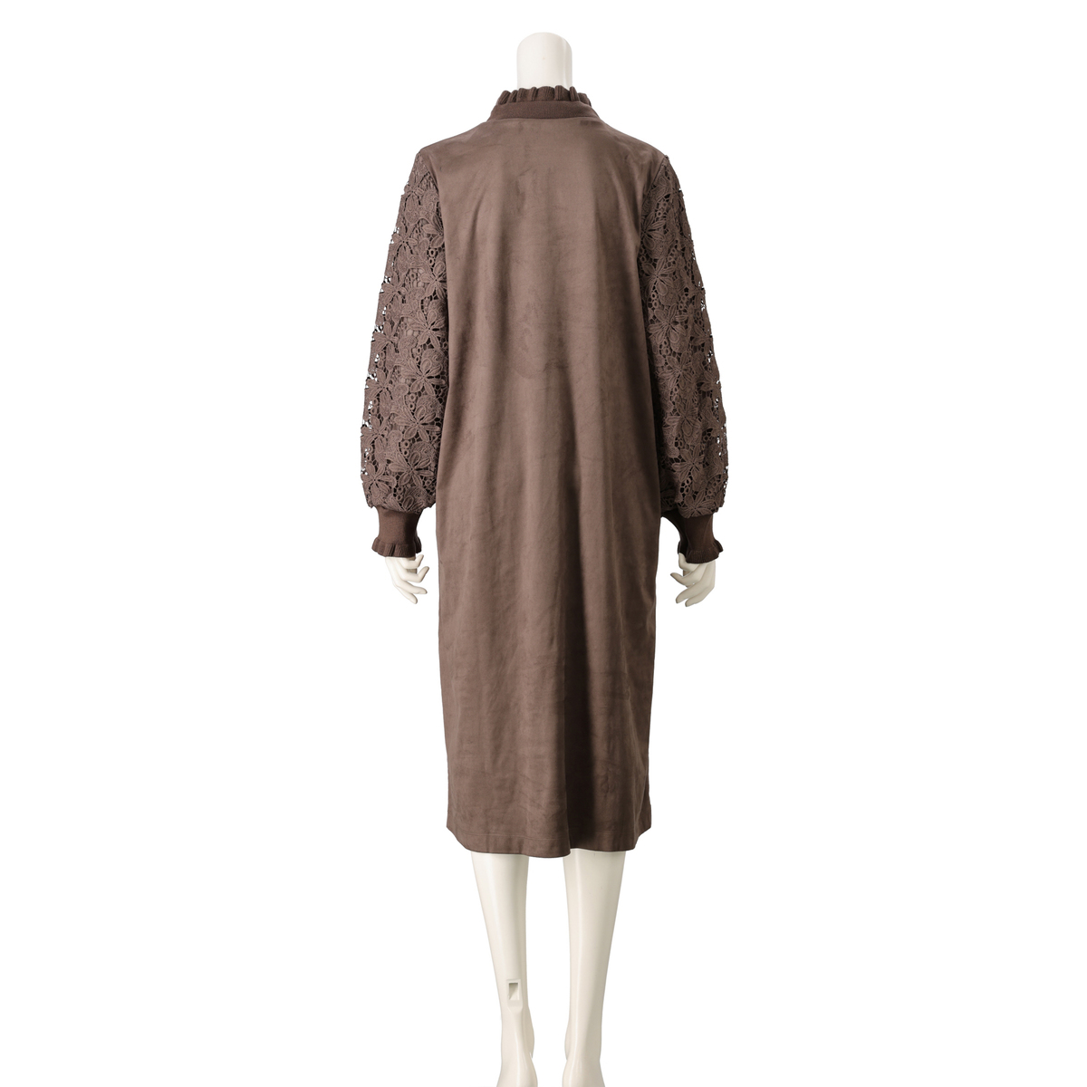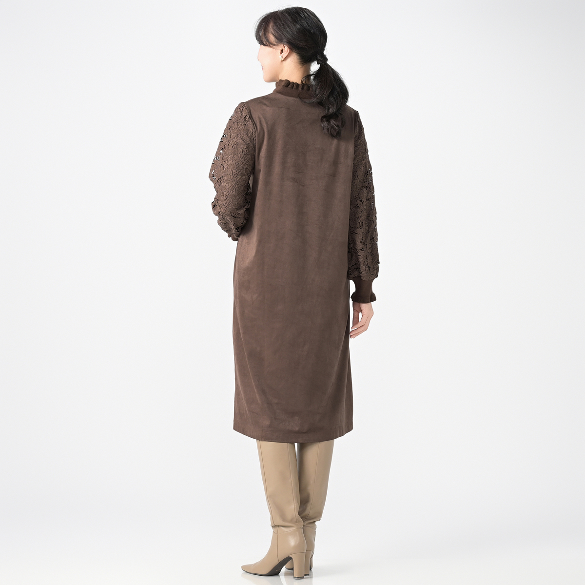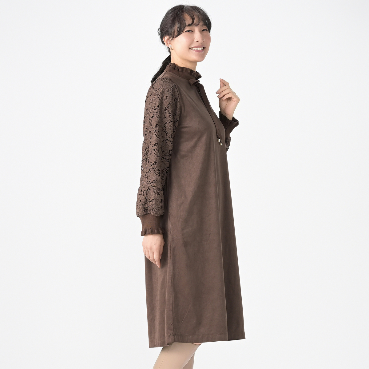 異素材ミックスで仕上げたワンピース。身頃にハリ感とストレッチ性を兼ね備えたフェイクスウェード素材を使用した、あたたかみのある着心地です。袖にはフェミニンなレース、袖口と衿には柔らかなニットをドッキングしました