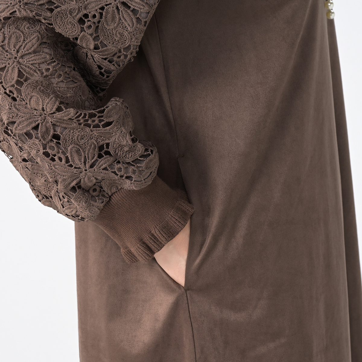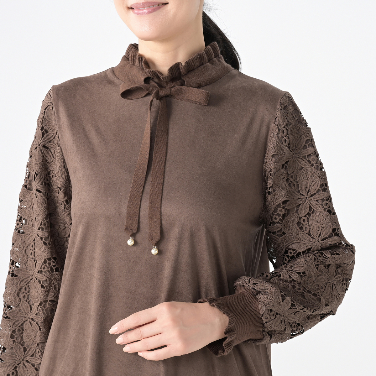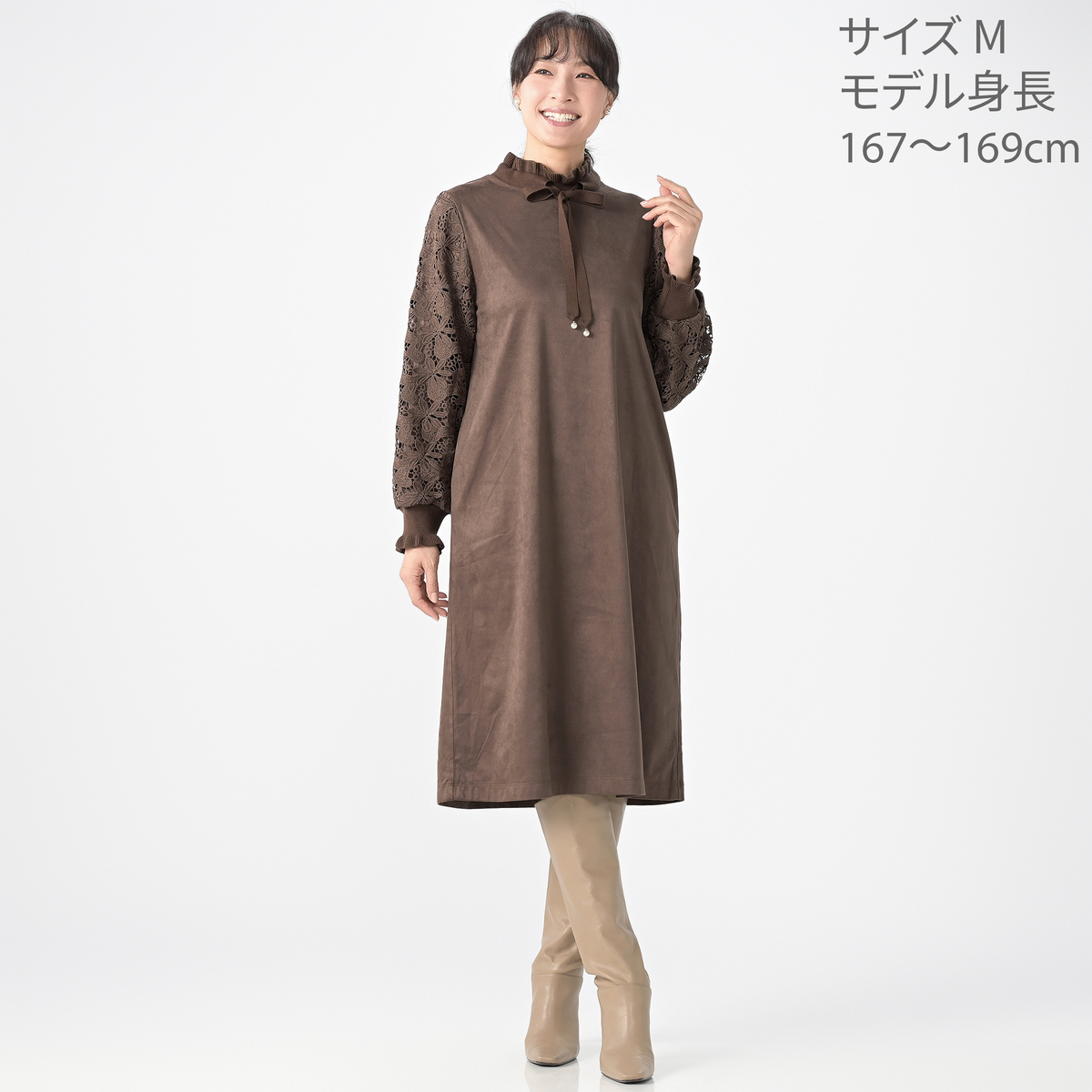 異素材ミックスで仕上げたワンピース。身頃にハリ感とストレッチ性を兼ね備えたフェイクスウェード素材を使用した、あたたかみのある着心地です。袖にはフェミニンなレース、袖口と衿には柔らかなニットをドッキングしました