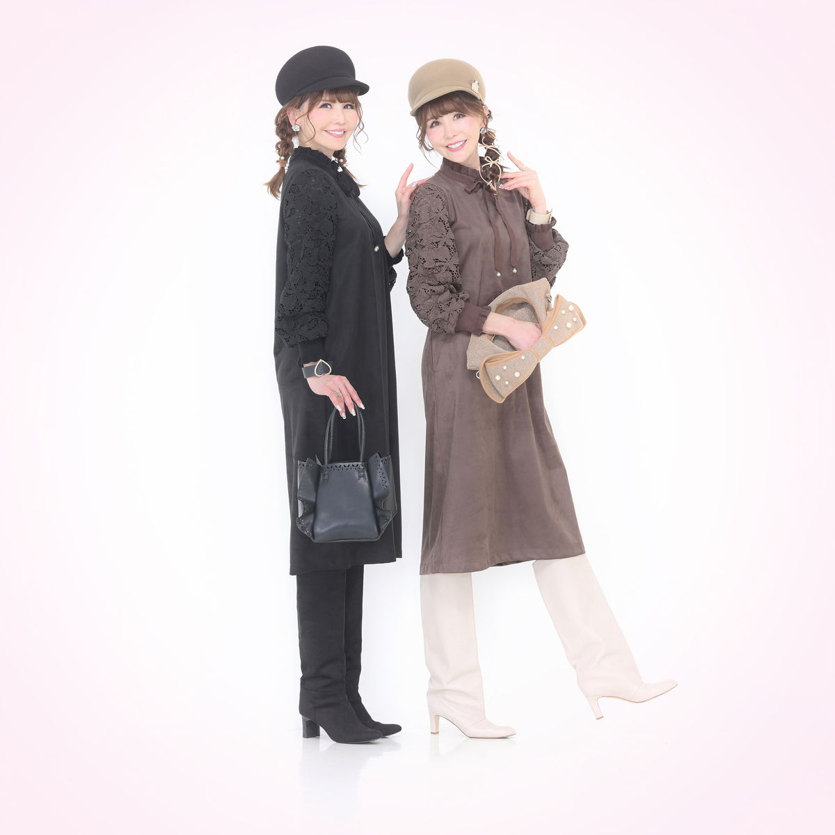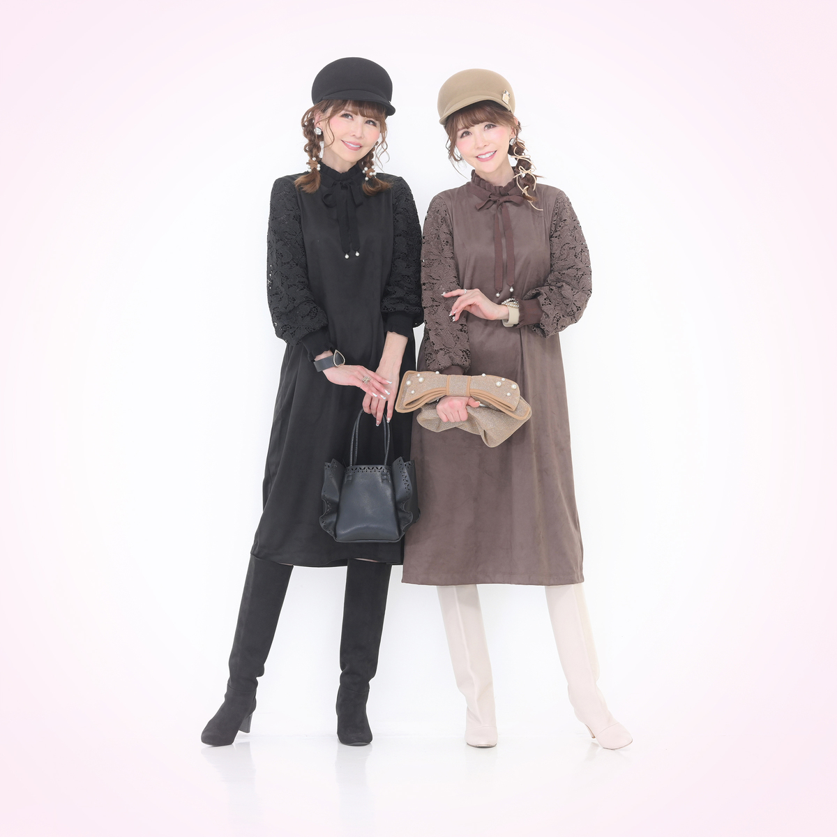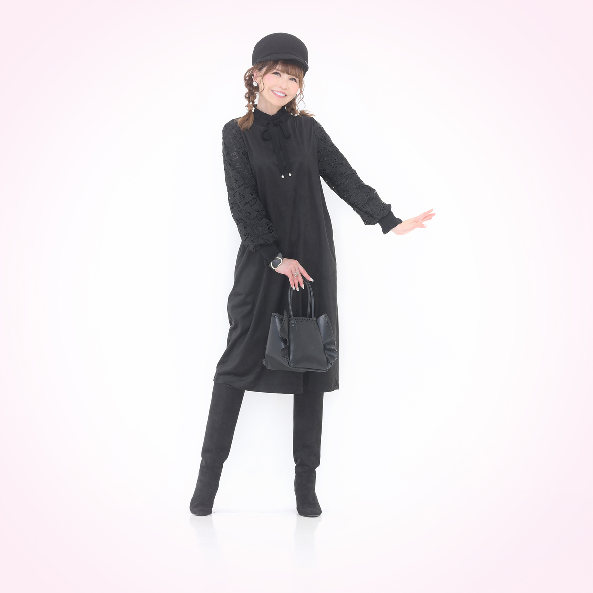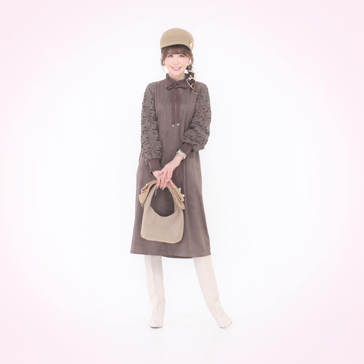 異素材ミックスで仕上げたワンピース。身頃にハリ感とストレッチ性を兼ね備えたフェイクスウェード素材を使用した、あたたかみのある着心地です。袖にはフェミニンなレース、袖口と衿には柔らかなニットをドッキングしました