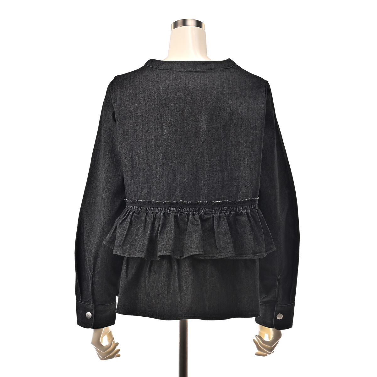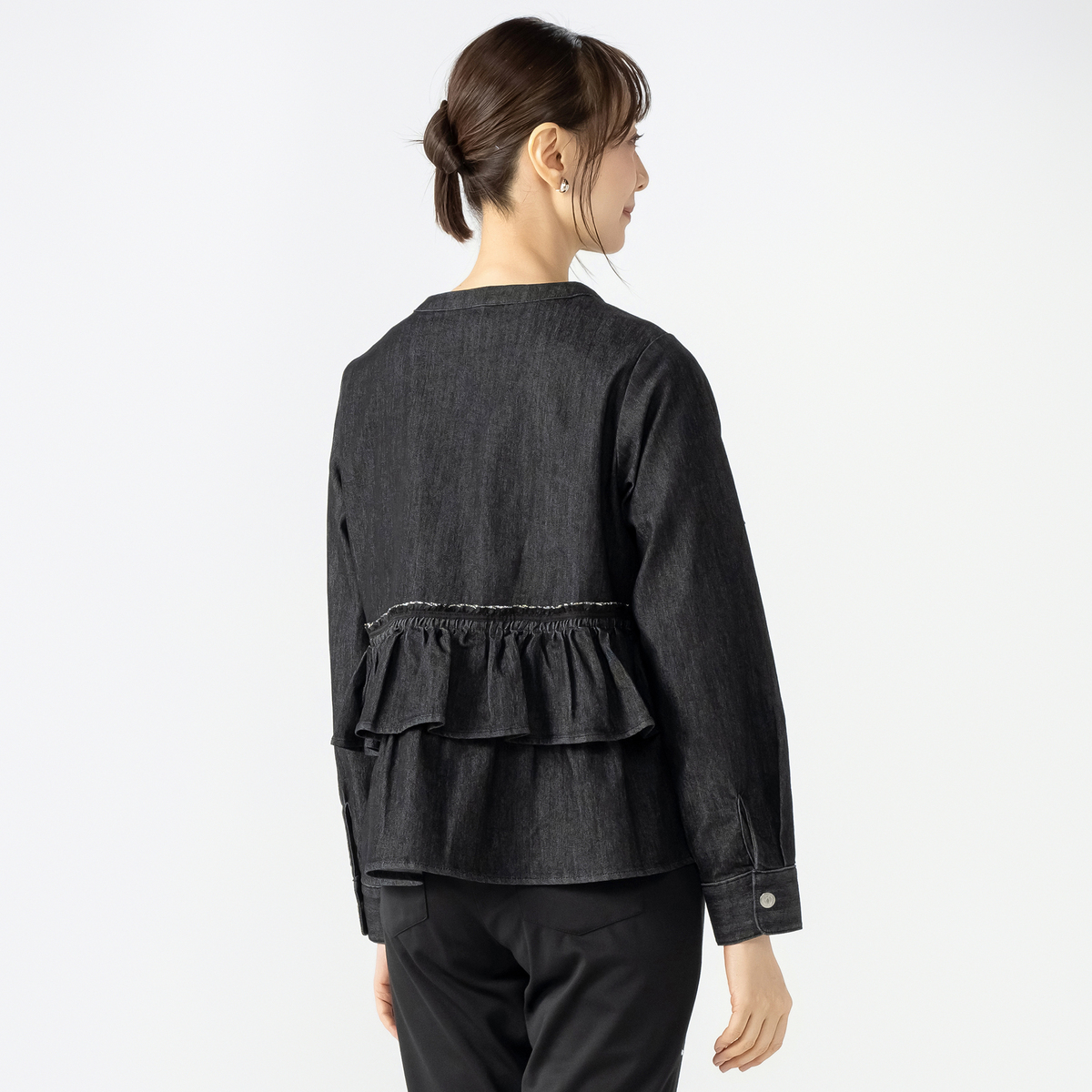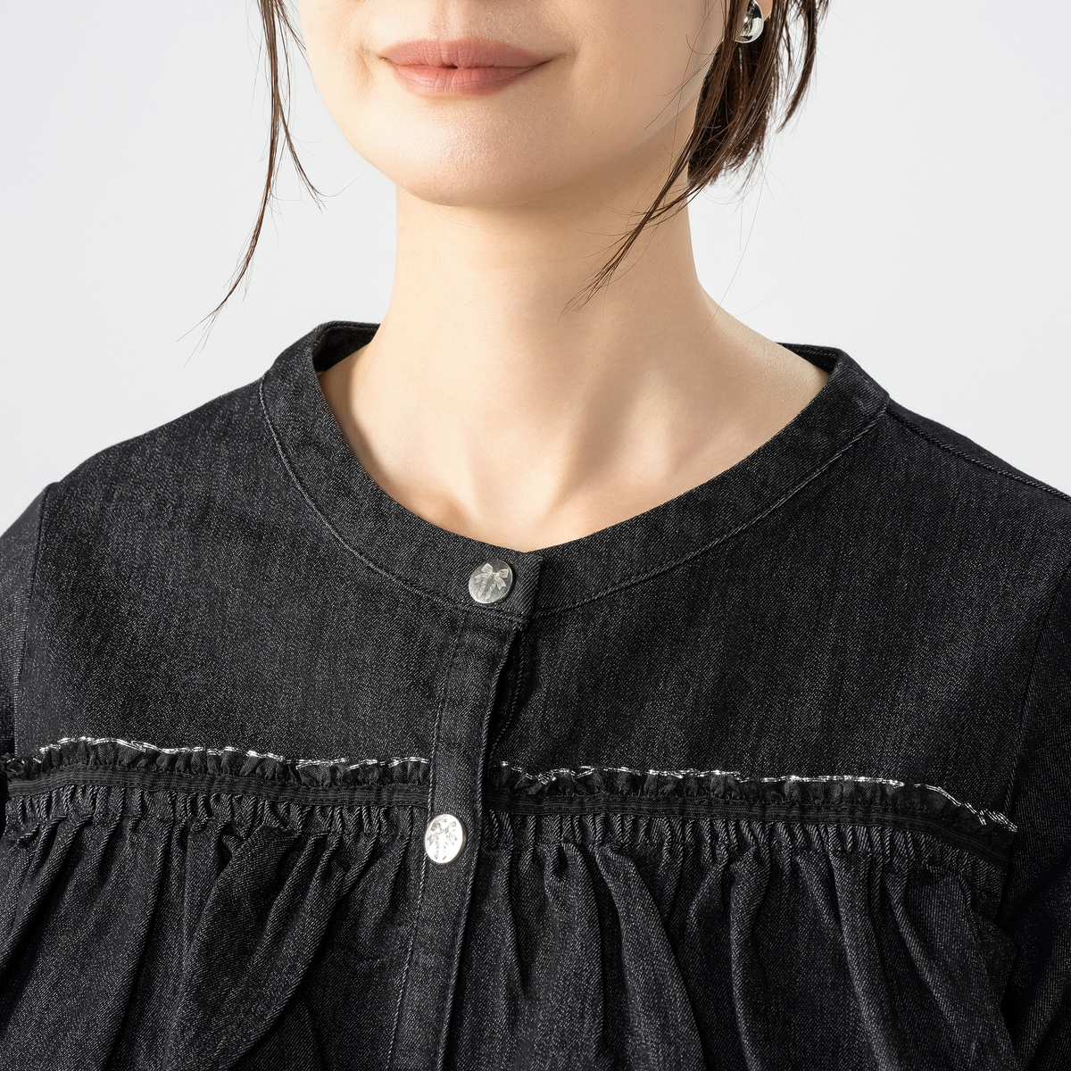 胸元と裾に華やかなティアードギャザー切替を入れたデニムブルゾン。袖に1本タックを入れ、カフス仕様で上品に仕上げています。ラメ入りテープをフリル上部に使用し、さりげないきらめきをプラスしました。適度なハリ感がありながら柔らかく軽い着心地の、7.5オンスデニム生地を使用しています