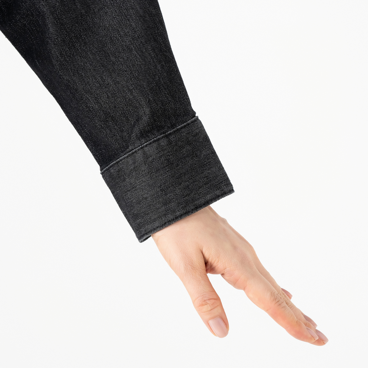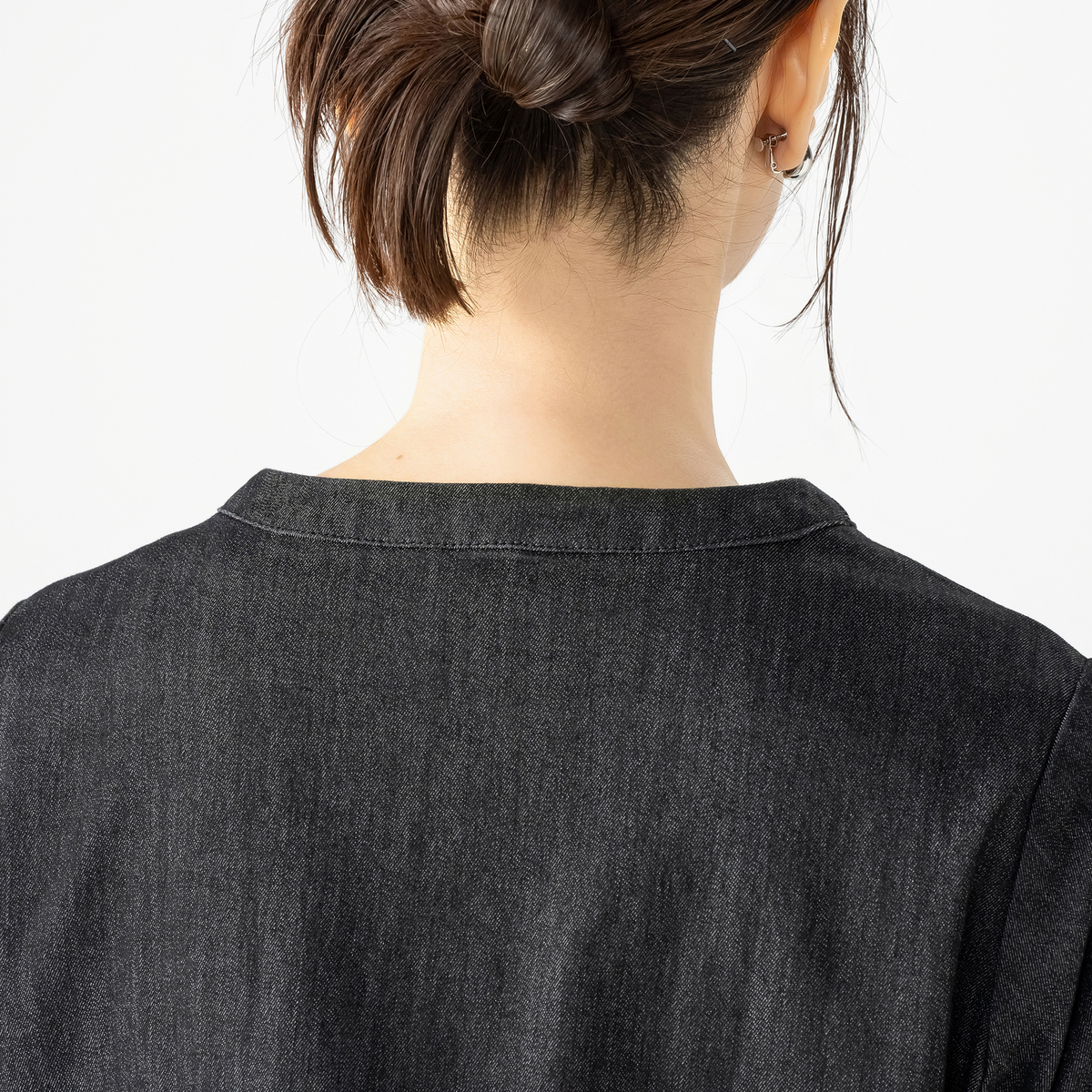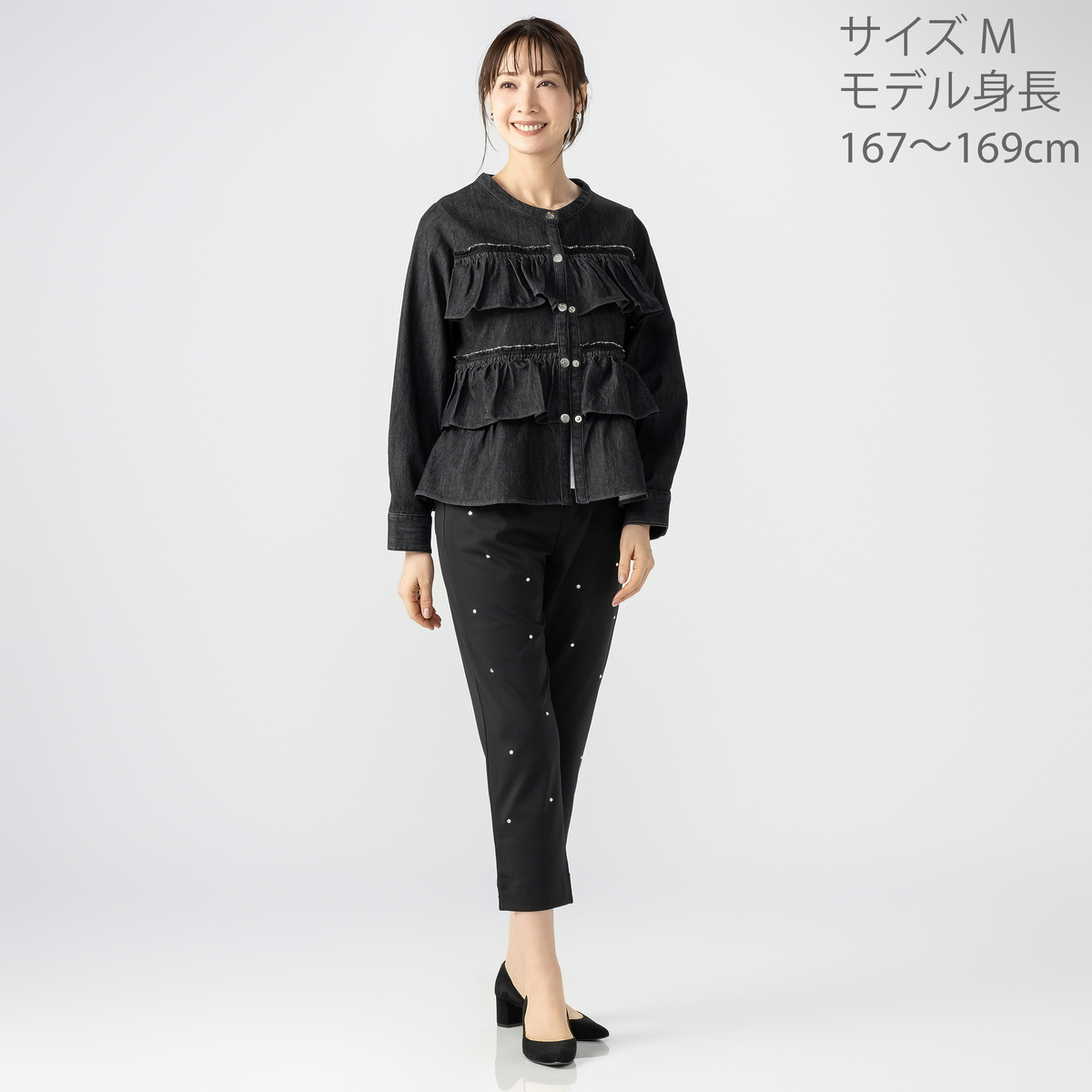 胸元と裾に華やかなティアードギャザー切替を入れたデニムブルゾン。袖に1本タックを入れ、カフス仕様で上品に仕上げています。ラメ入りテープをフリル上部に使用し、さりげないきらめきをプラスしました。適度なハリ感がありながら柔らかく軽い着心地の、7.5オンスデニム生地を使用しています