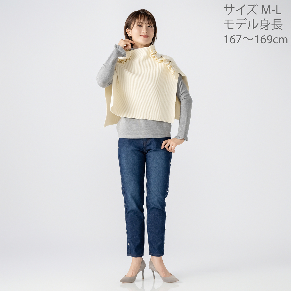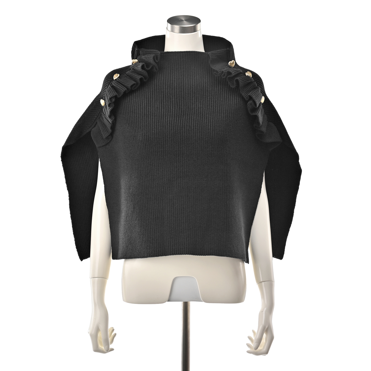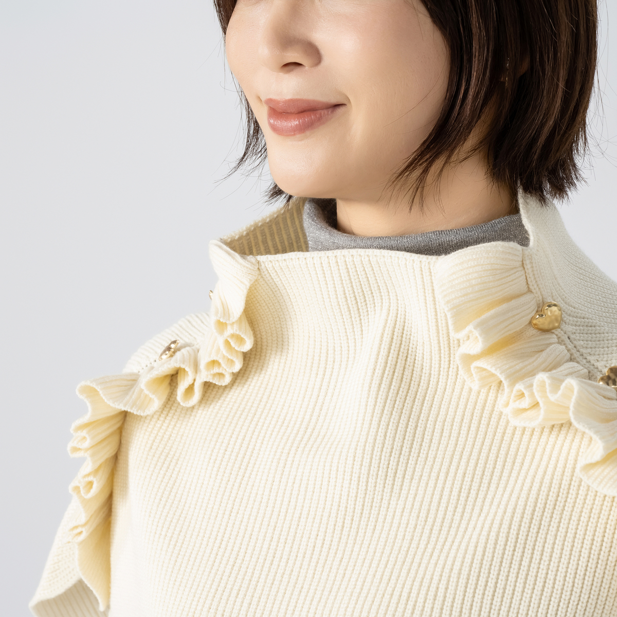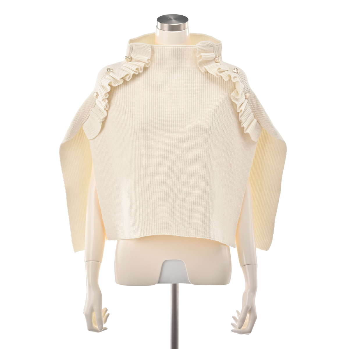 ハートボタンが目を引くニットポンチョ。ハートボタンとフリルデザインが大人可愛く、被るだけで首から肩までをすっぽりと包み込み、冷たい風や寒さからしっかりガードしてくれます。長すぎず短すぎず、衿元が少しくしゅっとする絶妙なシルエットです