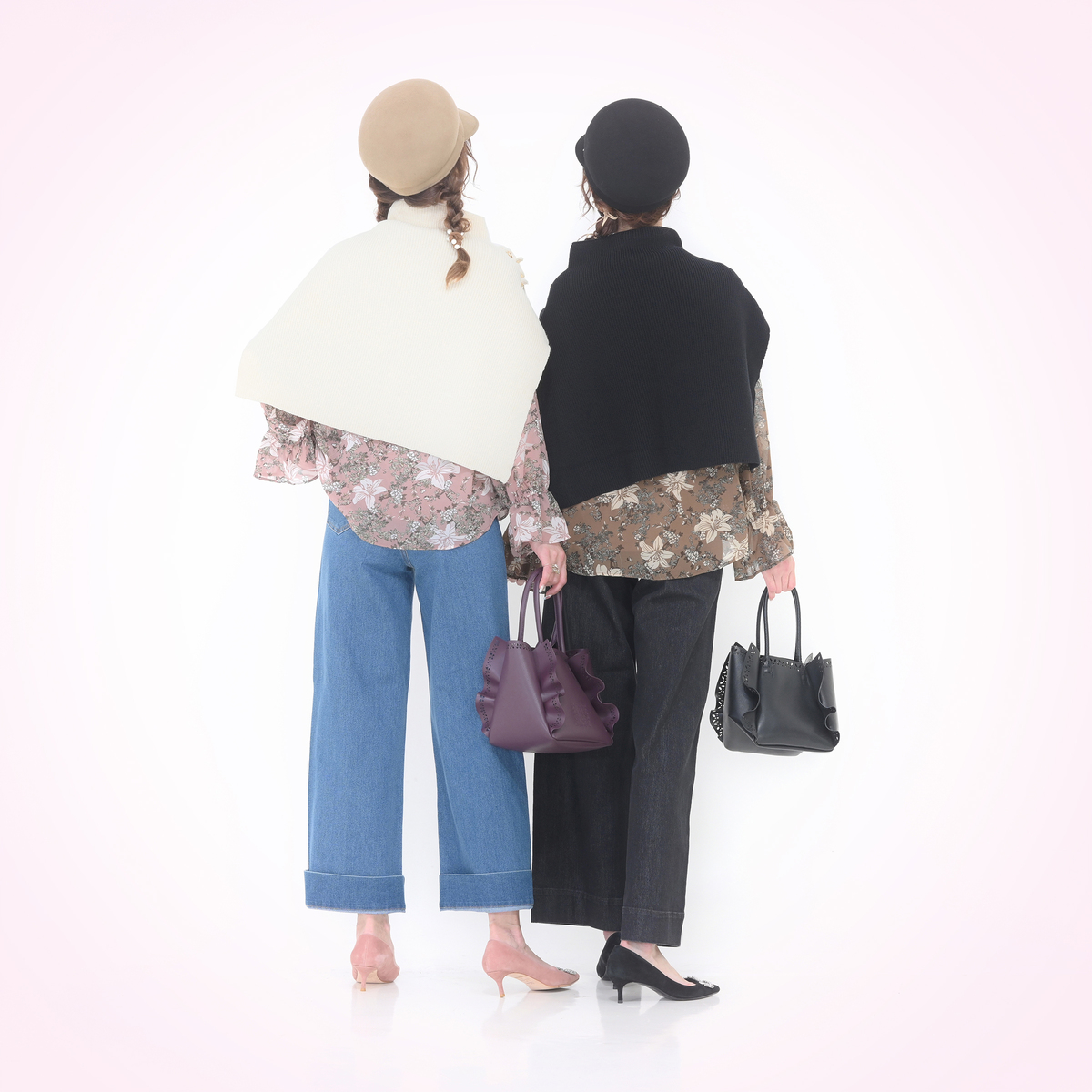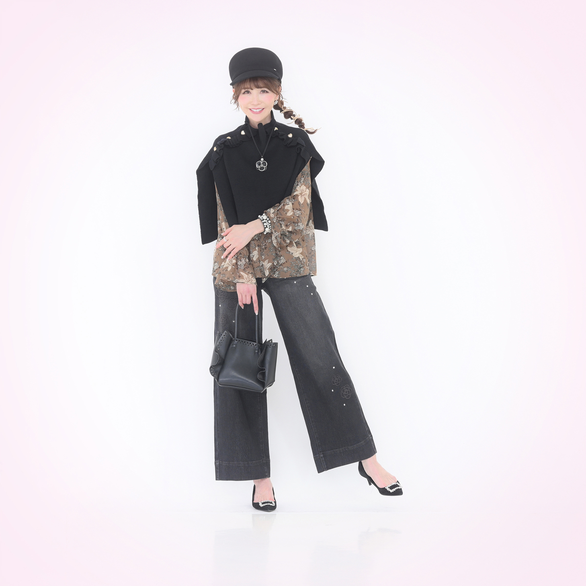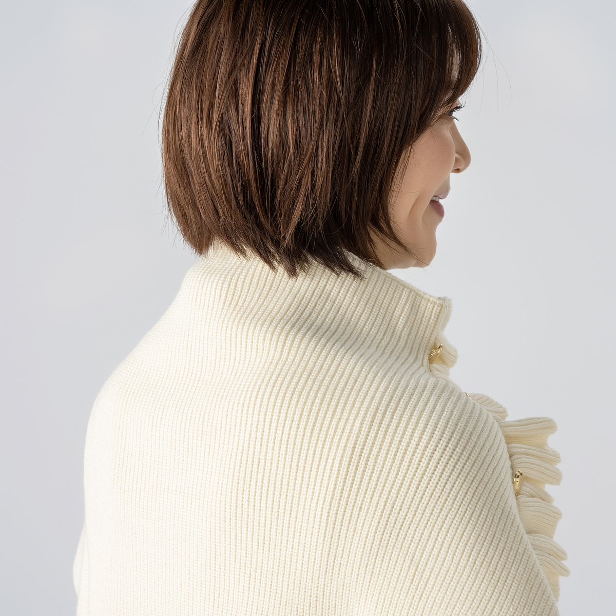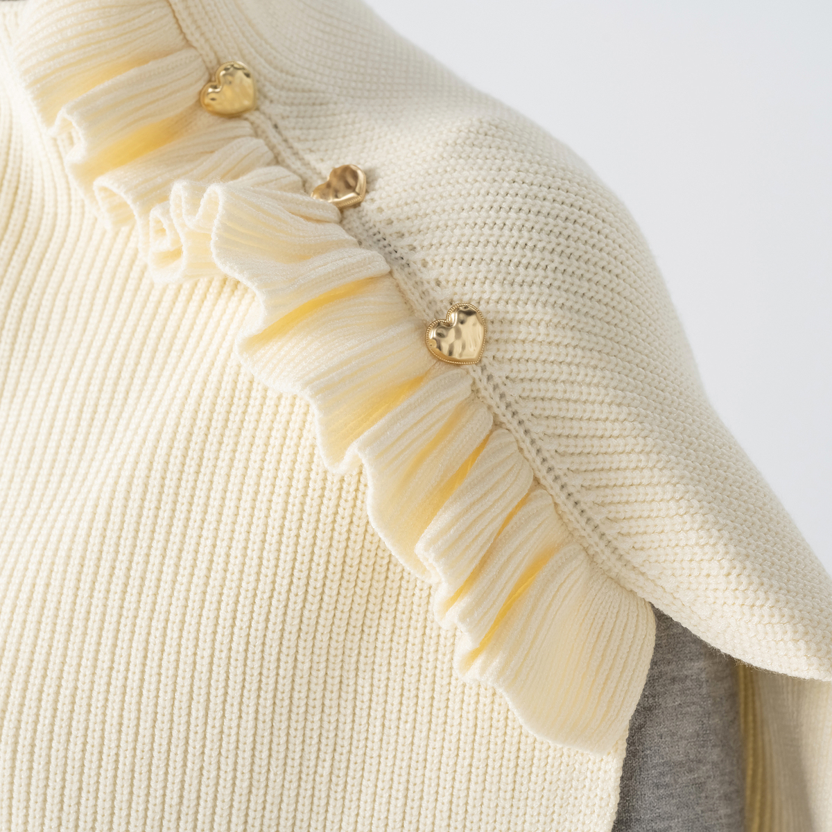 ハートボタンが目を引くニットポンチョ。ハートボタンとフリルデザインが大人可愛く、被るだけで首から肩までをすっぽりと包み込み、冷たい風や寒さからしっかりガードしてくれます。長すぎず短すぎず、衿元が少しくしゅっとする絶妙なシルエットです