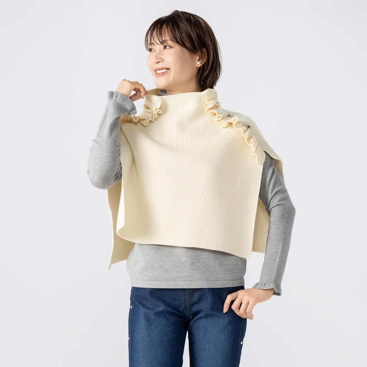 ハートボタンが目を引くニットポンチョ。ハートボタンとフリルデザインが大人可愛く、被るだけで首から肩までをすっぽりと包み込み、冷たい風や寒さからしっかりガードしてくれます。長すぎず短すぎず、衿元が少しくしゅっとする絶妙なシルエットです