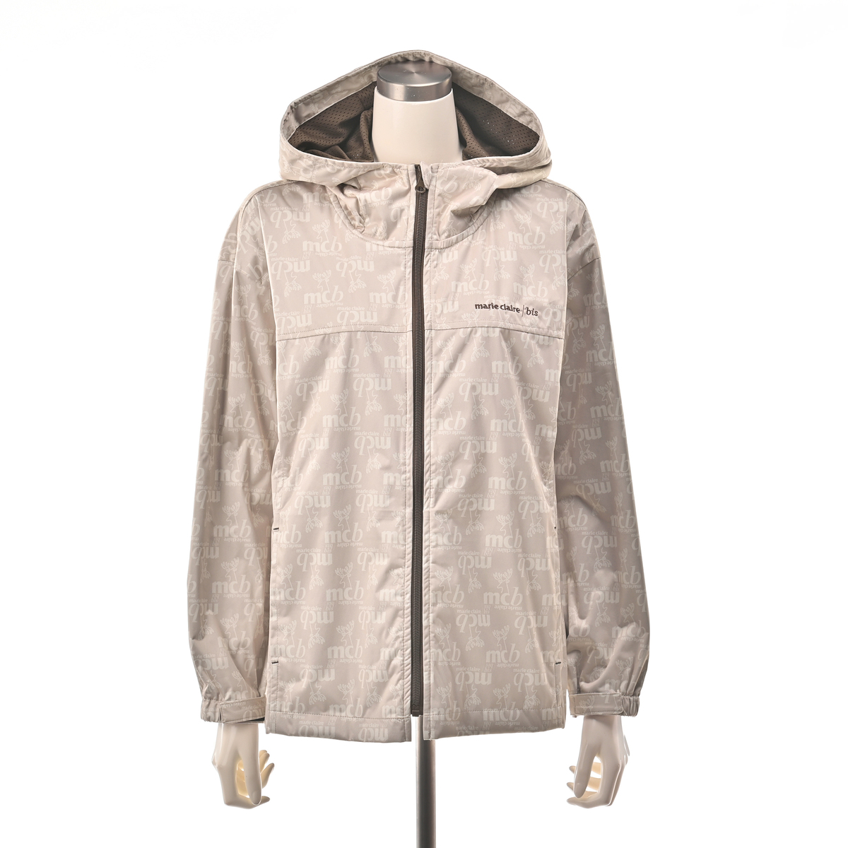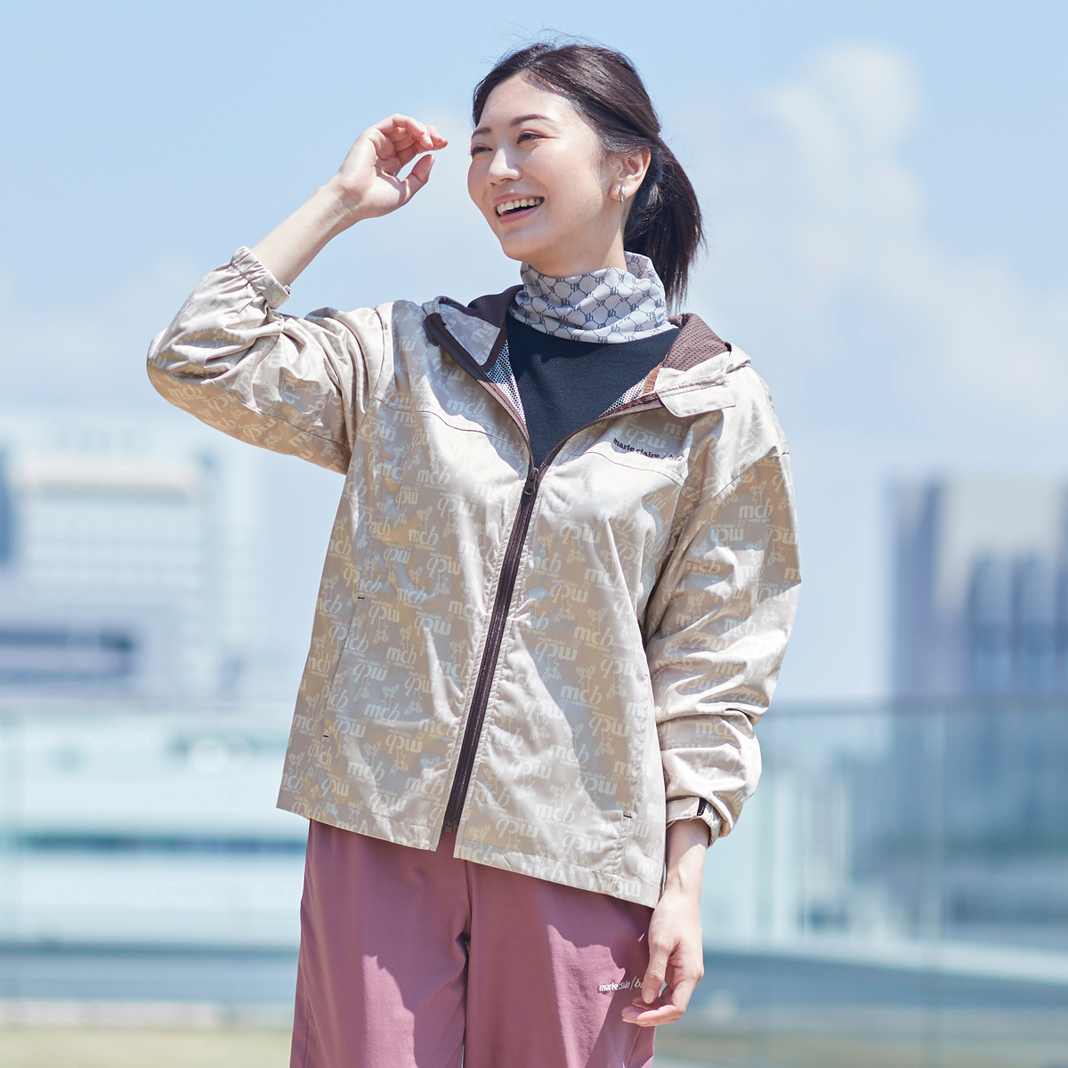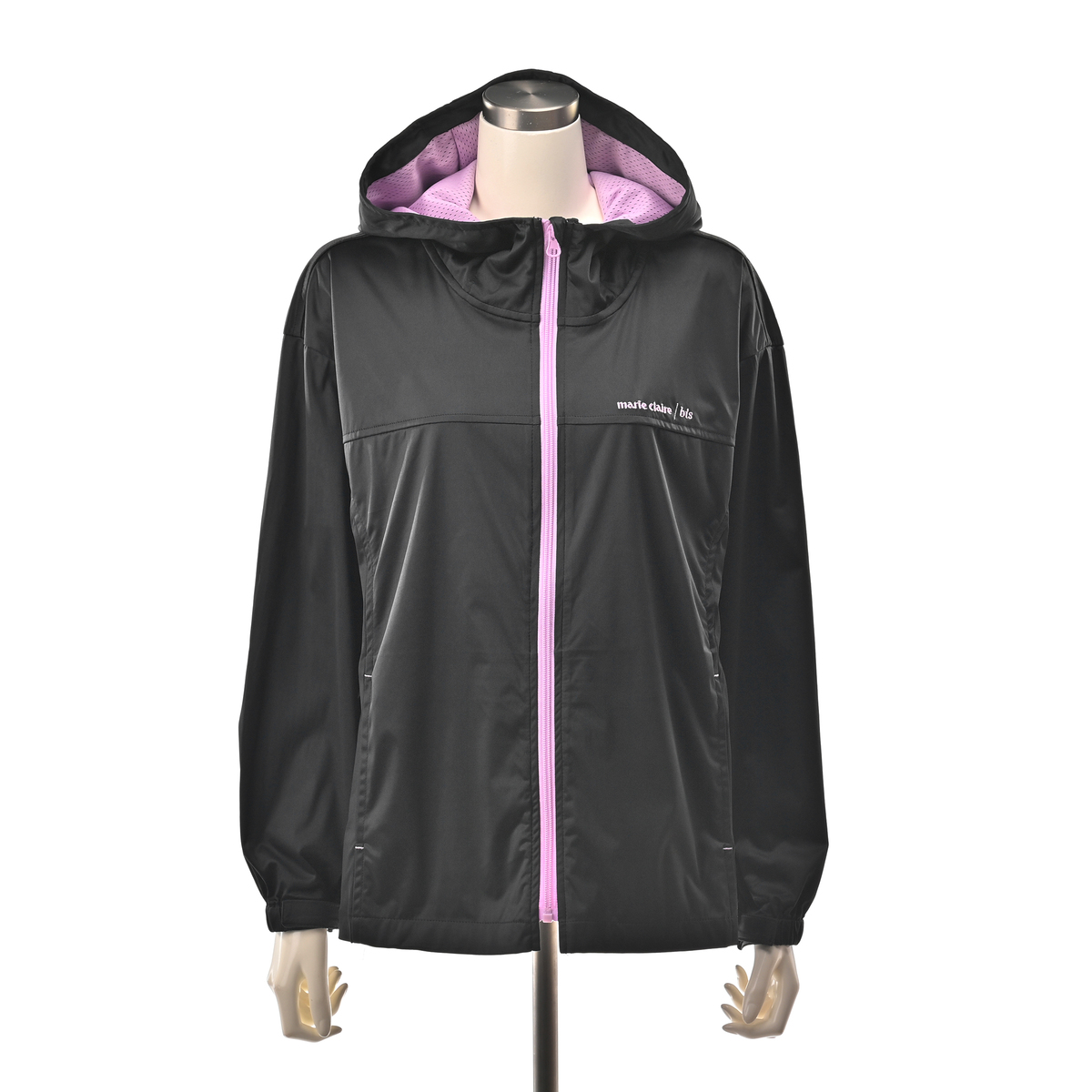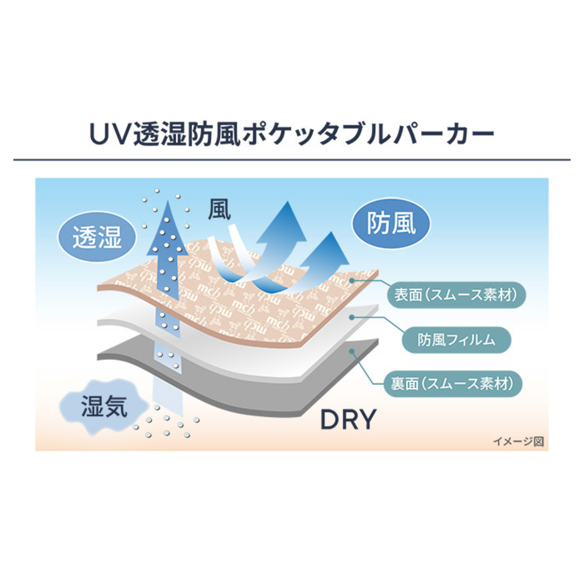 marie claire/bisの透湿防風パーカー。防風フィルムを挟んだ三層構造のボンディング生地で風を通さず、蒸気や湿気を外へ逃がします