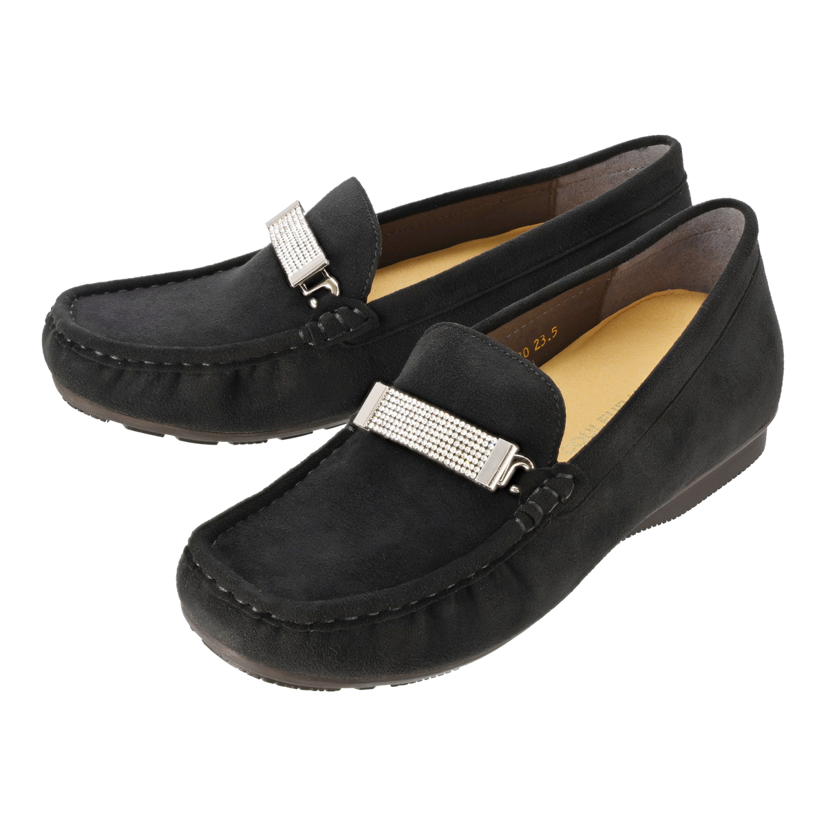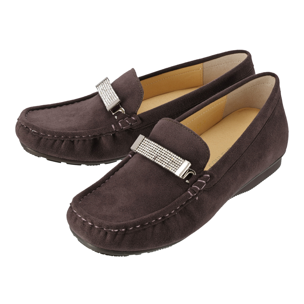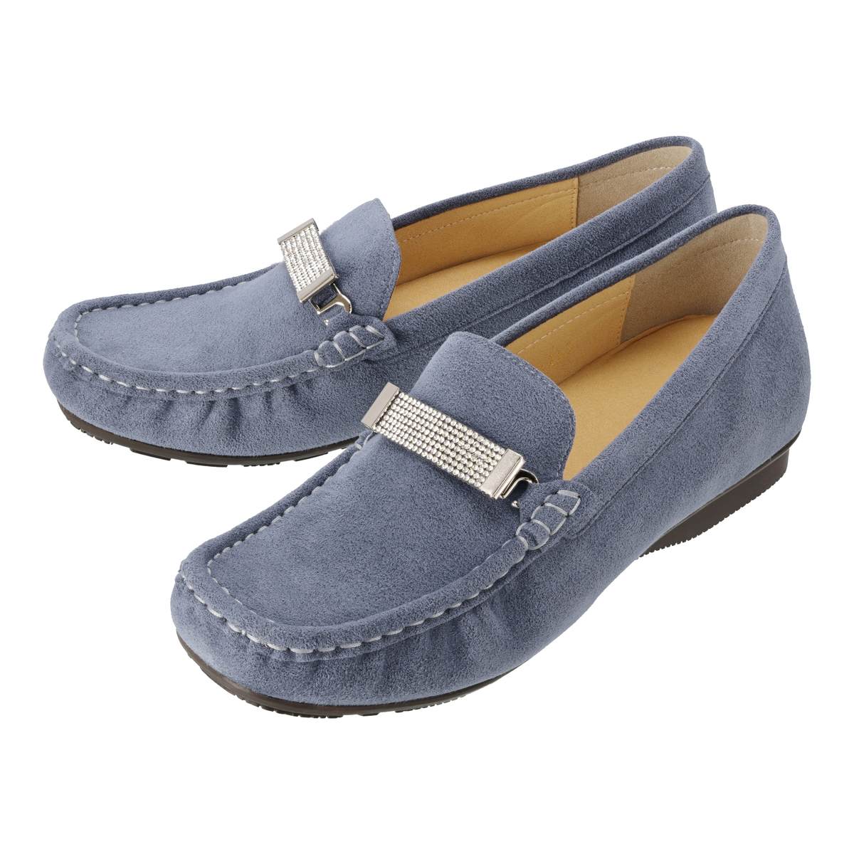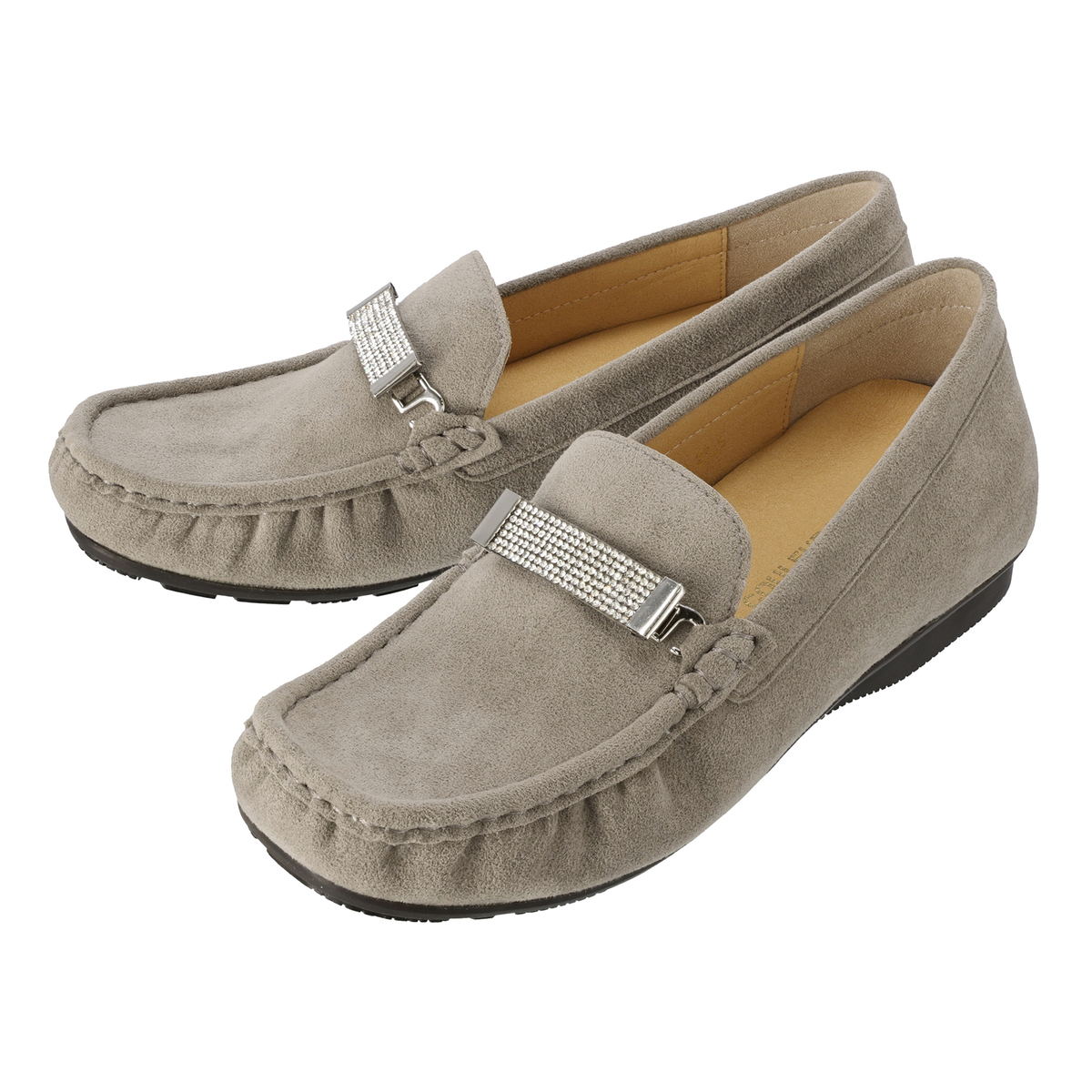 ストーンの飾りを付けて華やかに、飾りを外してシンプルに、2WAYで楽しめるモカシンシューズです。軽くて通気性に優れ、しかもウォッシャブルという靴にこそ欲しい機能を持つ、東レ人工スエード(日本製)をメイン資材として使用しています