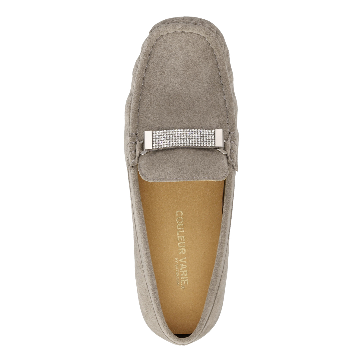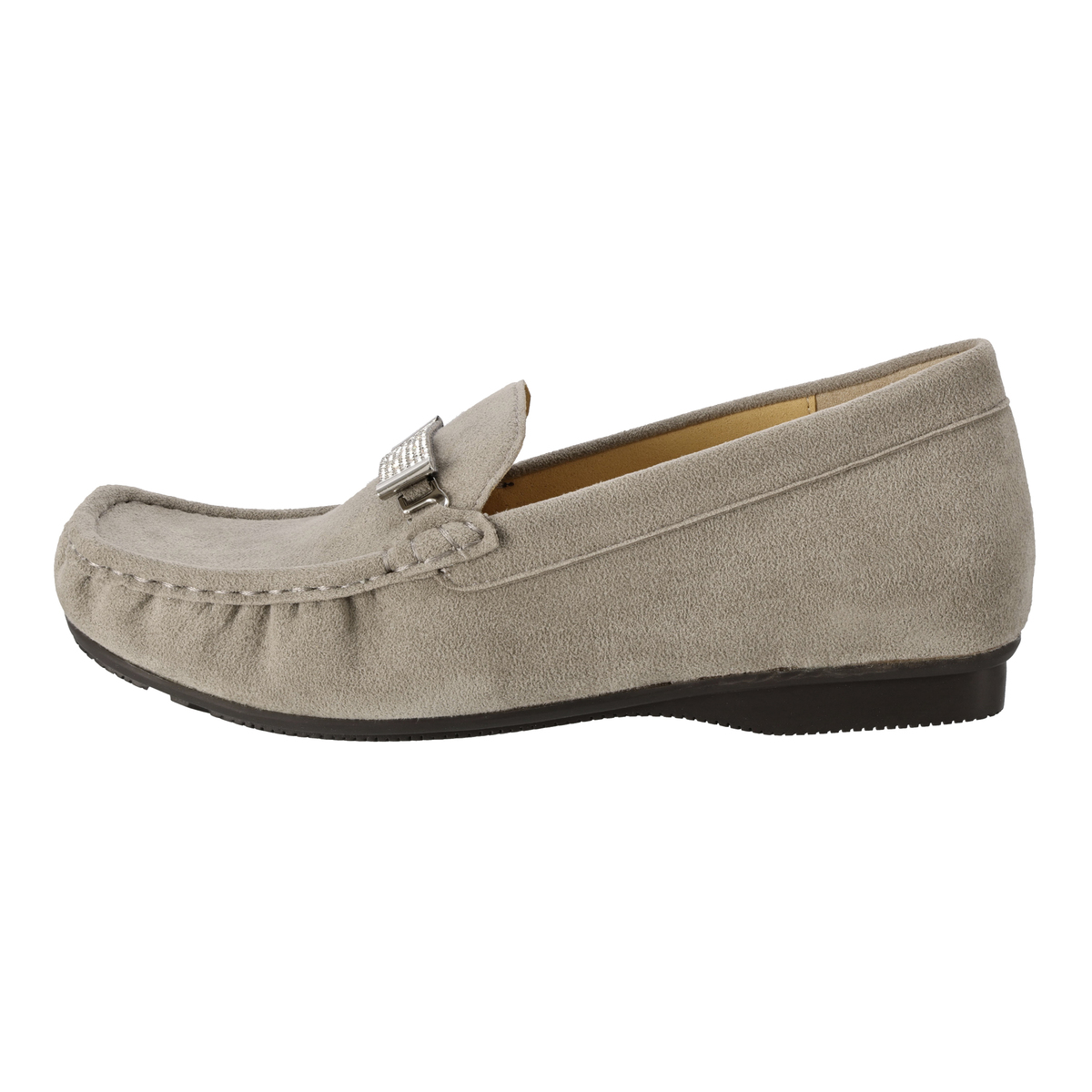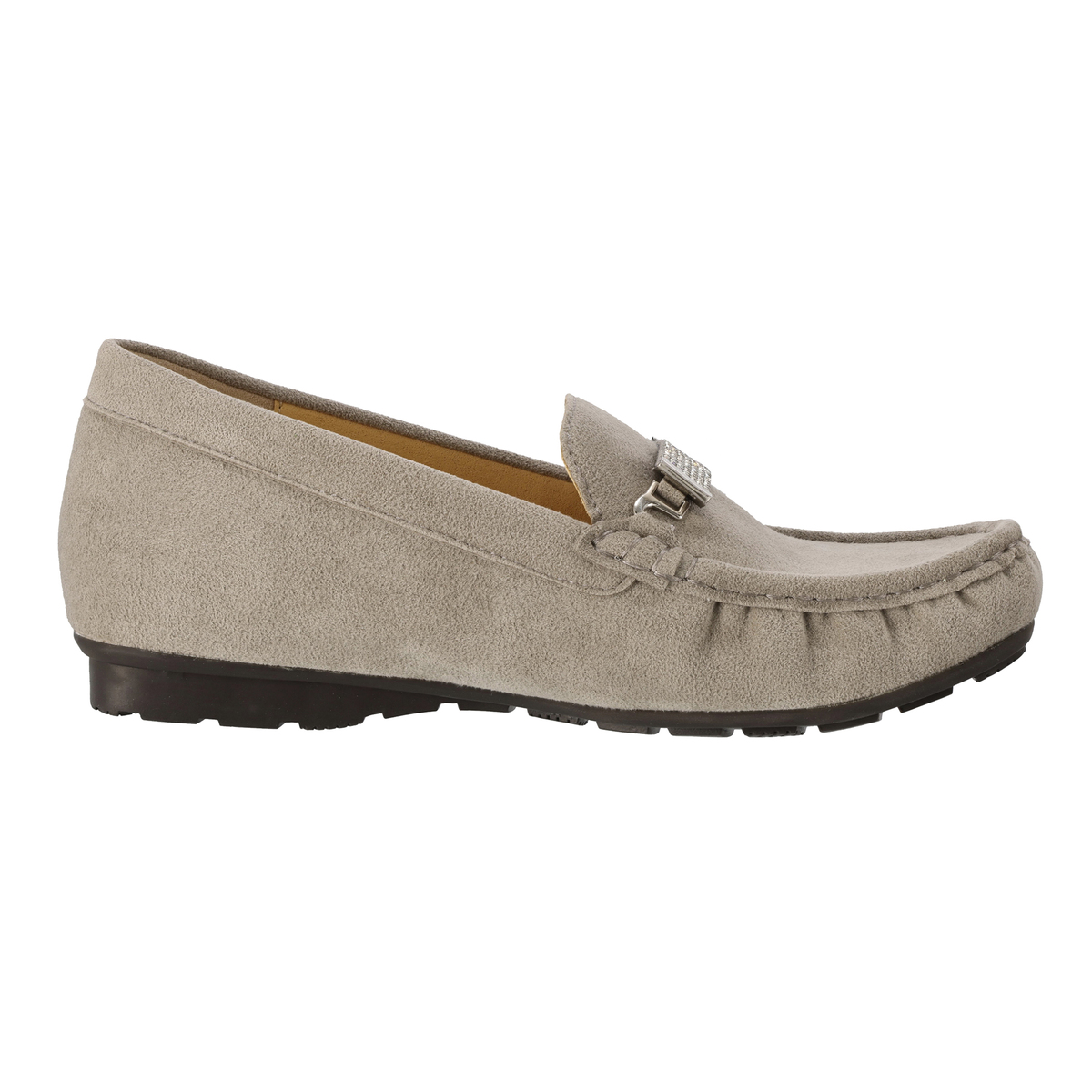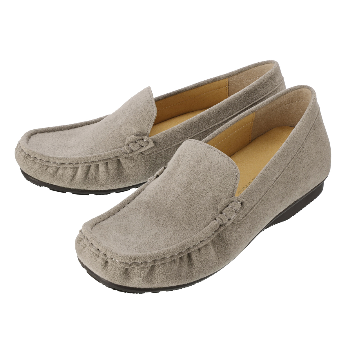 ストーンの飾りを付けて華やかに、飾りを外してシンプルに、2WAYで楽しめるモカシンシューズです。軽くて通気性に優れ、しかもウォッシャブルという靴にこそ欲しい機能を持つ、東レ人工スエード(日本製)をメイン資材として使用しています