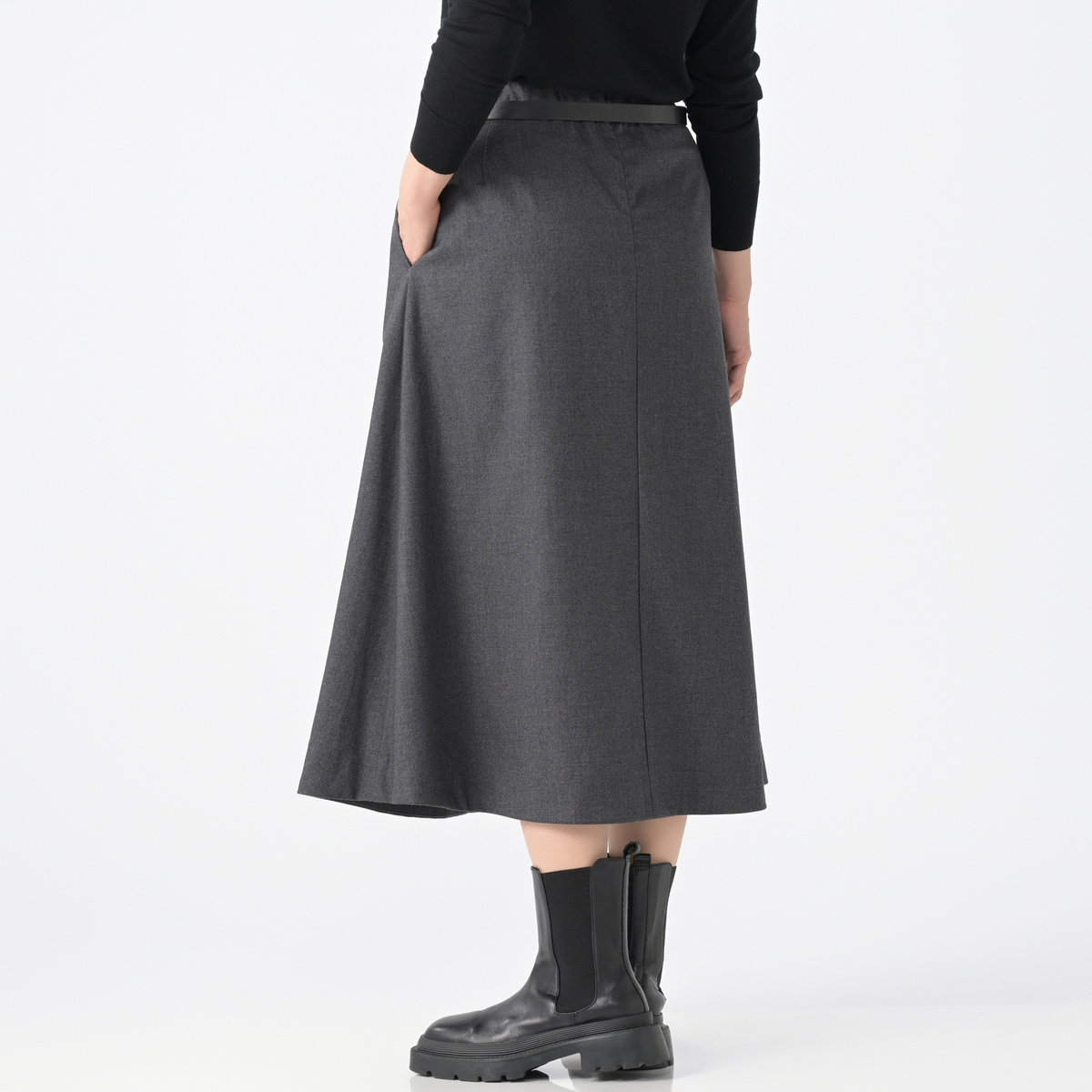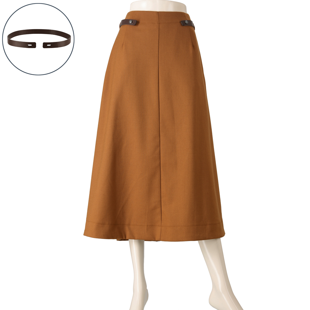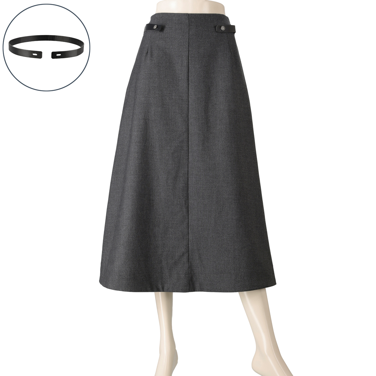 フェイクレザーのベルトがアクセントになったフレアスカート。暖かみのある布帛素材に、自然なストレッチ性を備え、快適な穿き心地を叶えます。計算されたフレア分量が、美しいシルエットを演出します