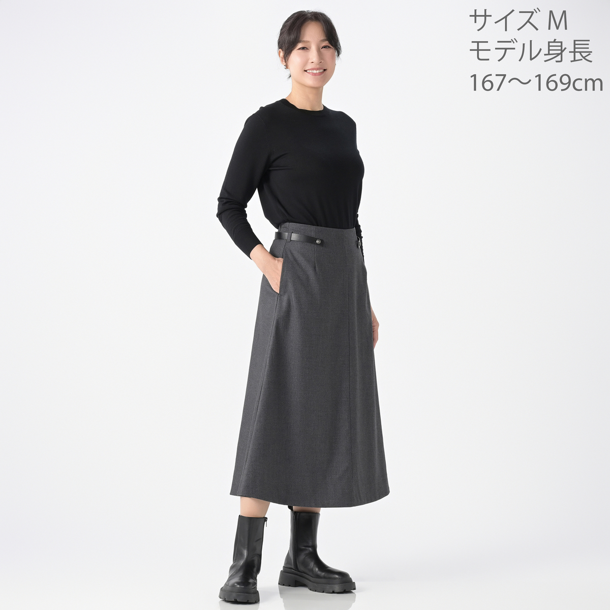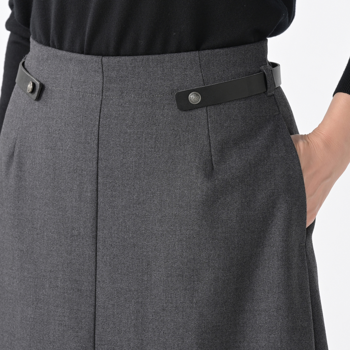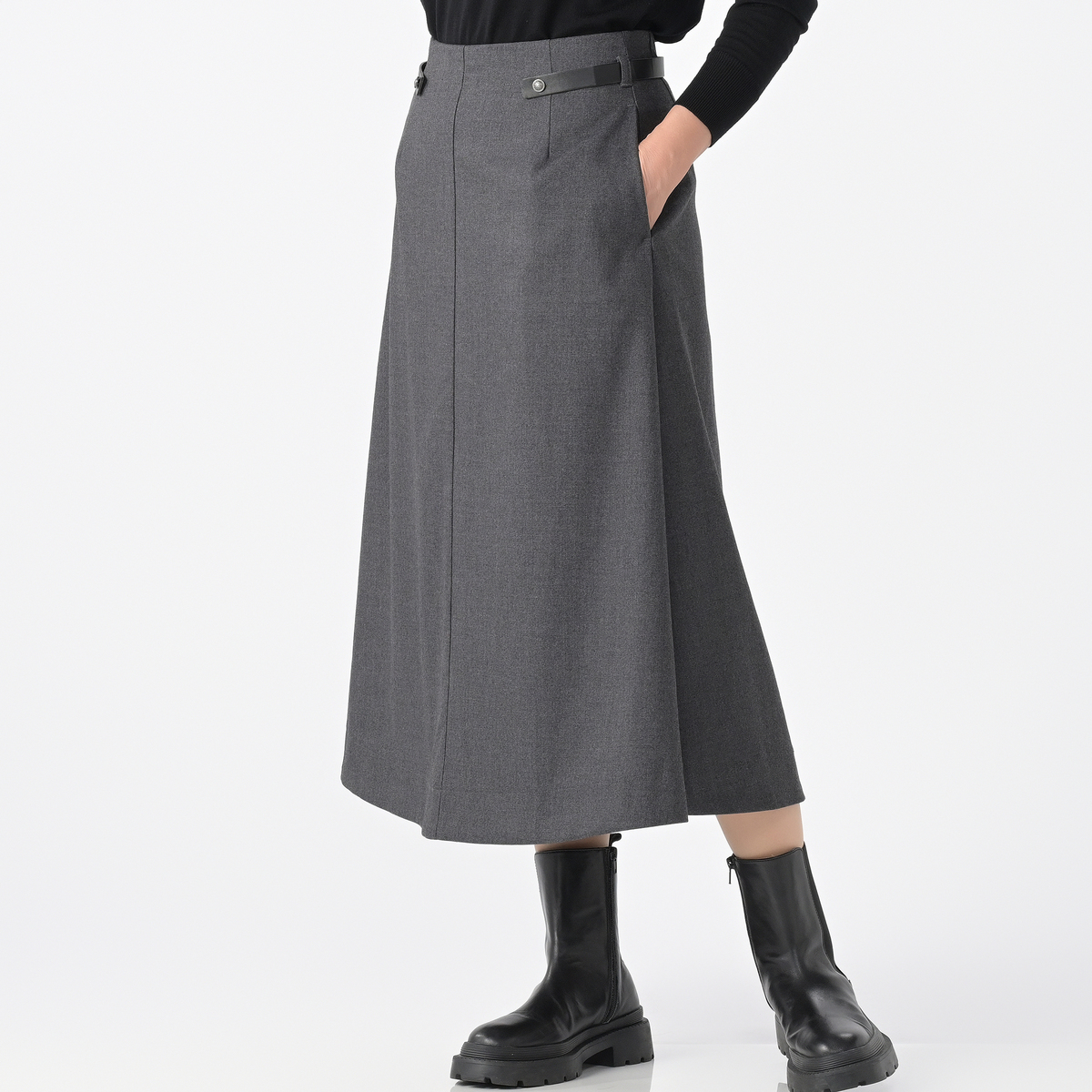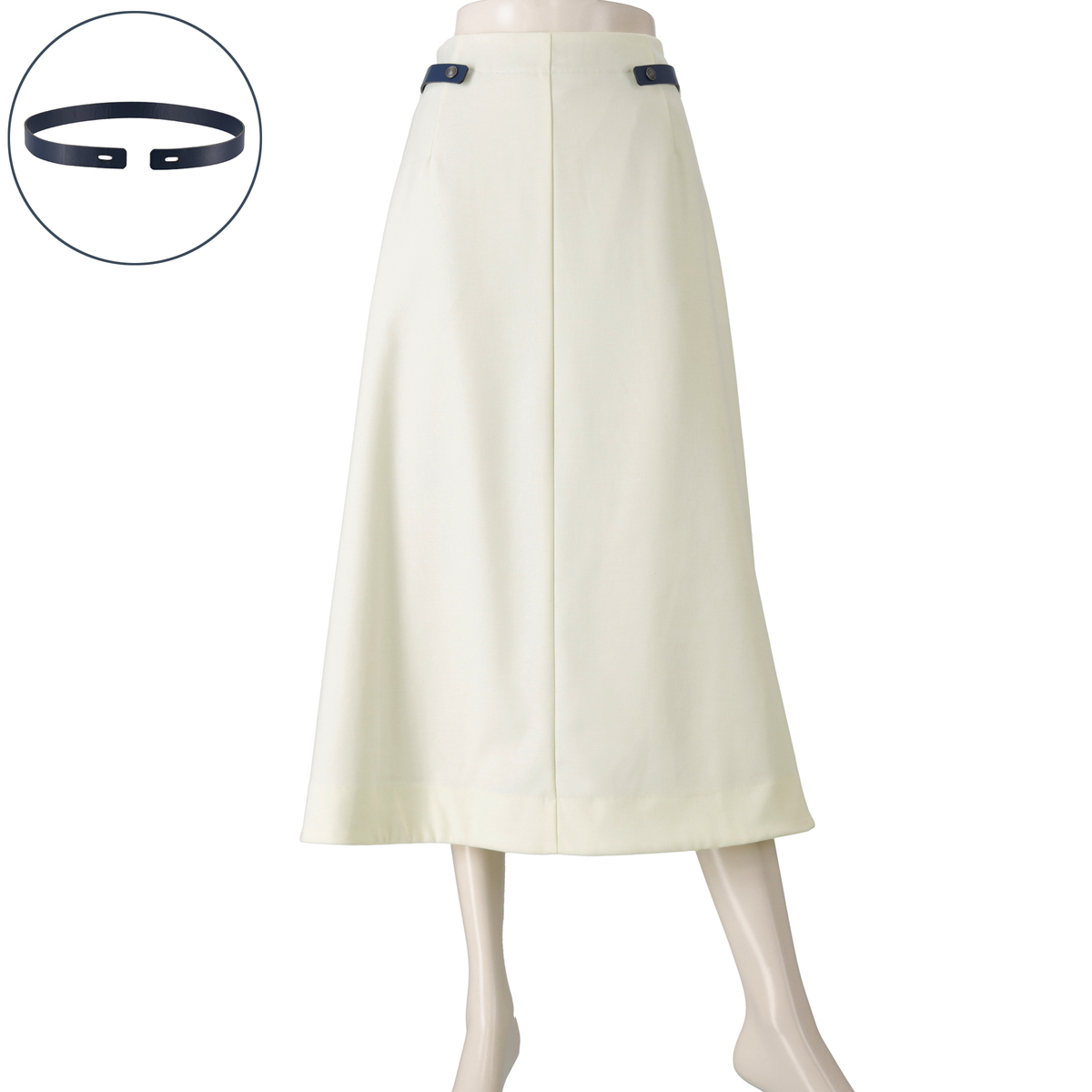 フェイクレザーのベルトがアクセントになったフレアスカート。暖かみのある布帛素材に、自然なストレッチ性を備え、快適な穿き心地を叶えます。計算されたフレア分量が、美しいシルエットを演出します