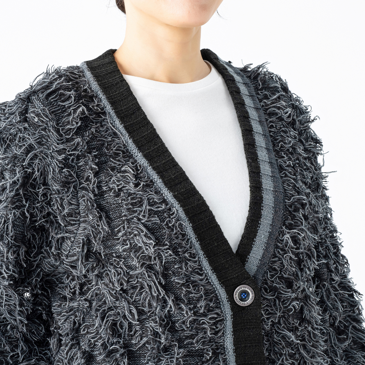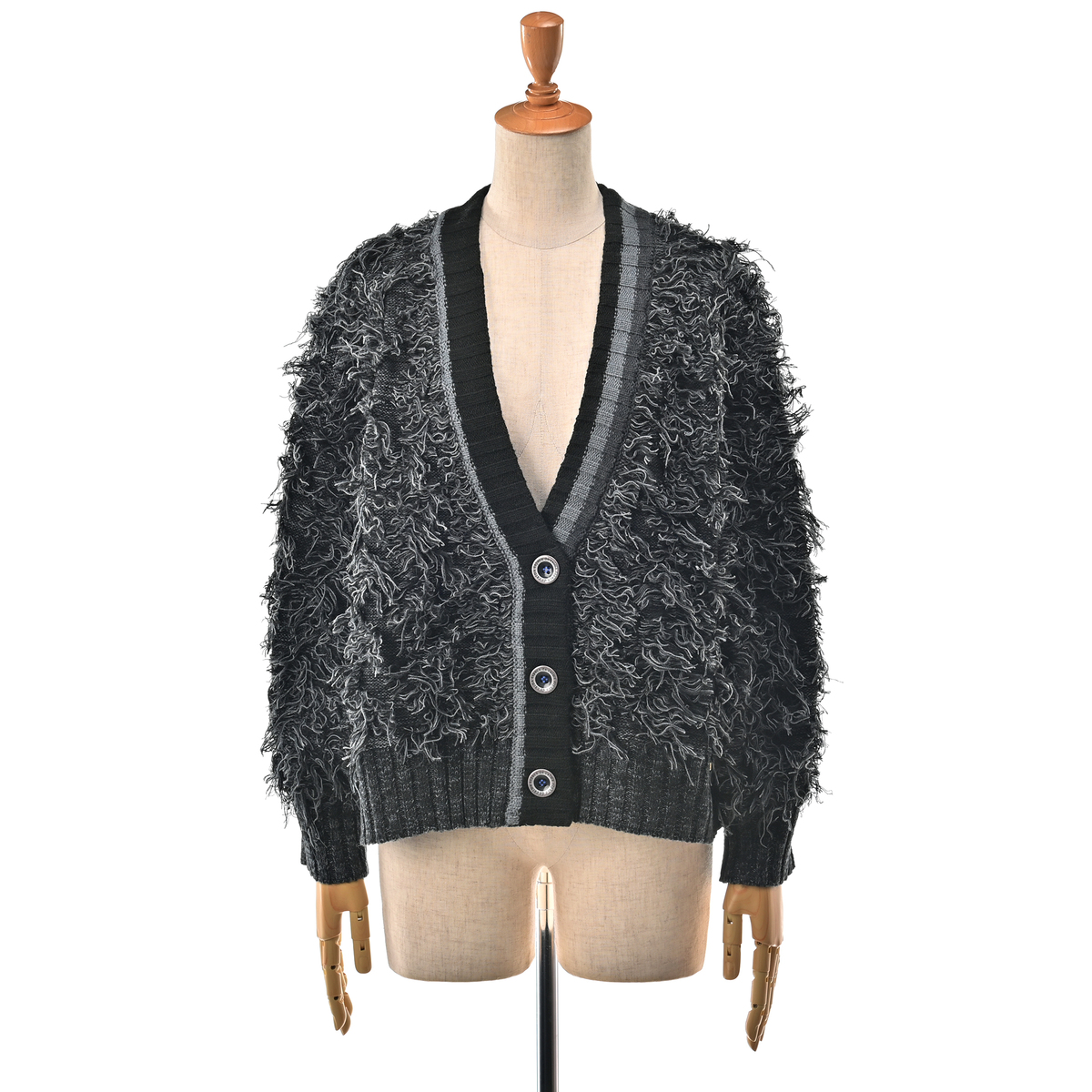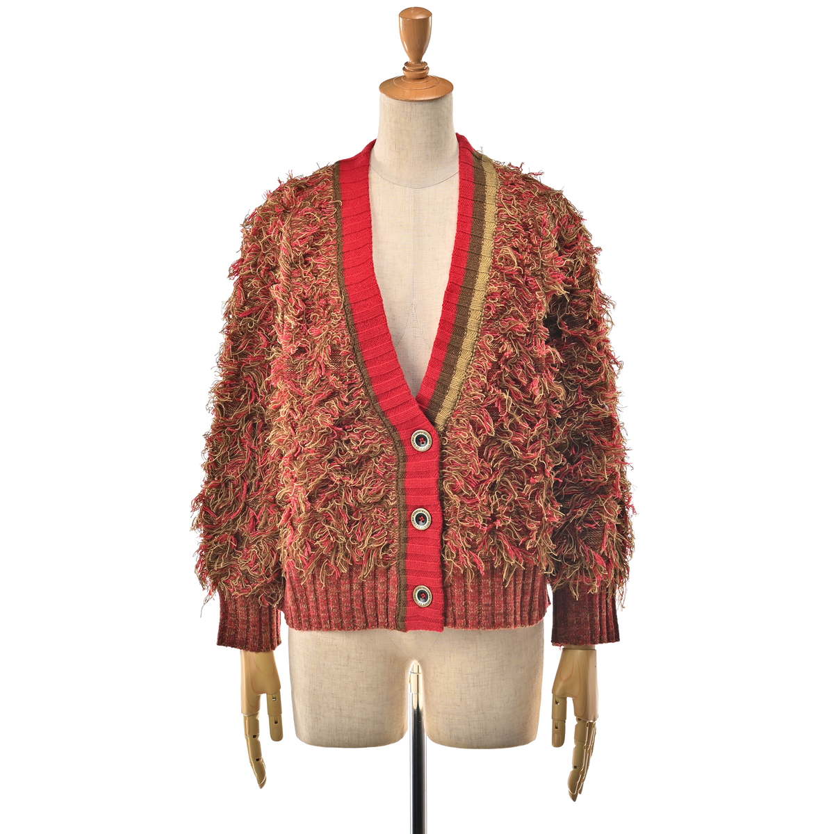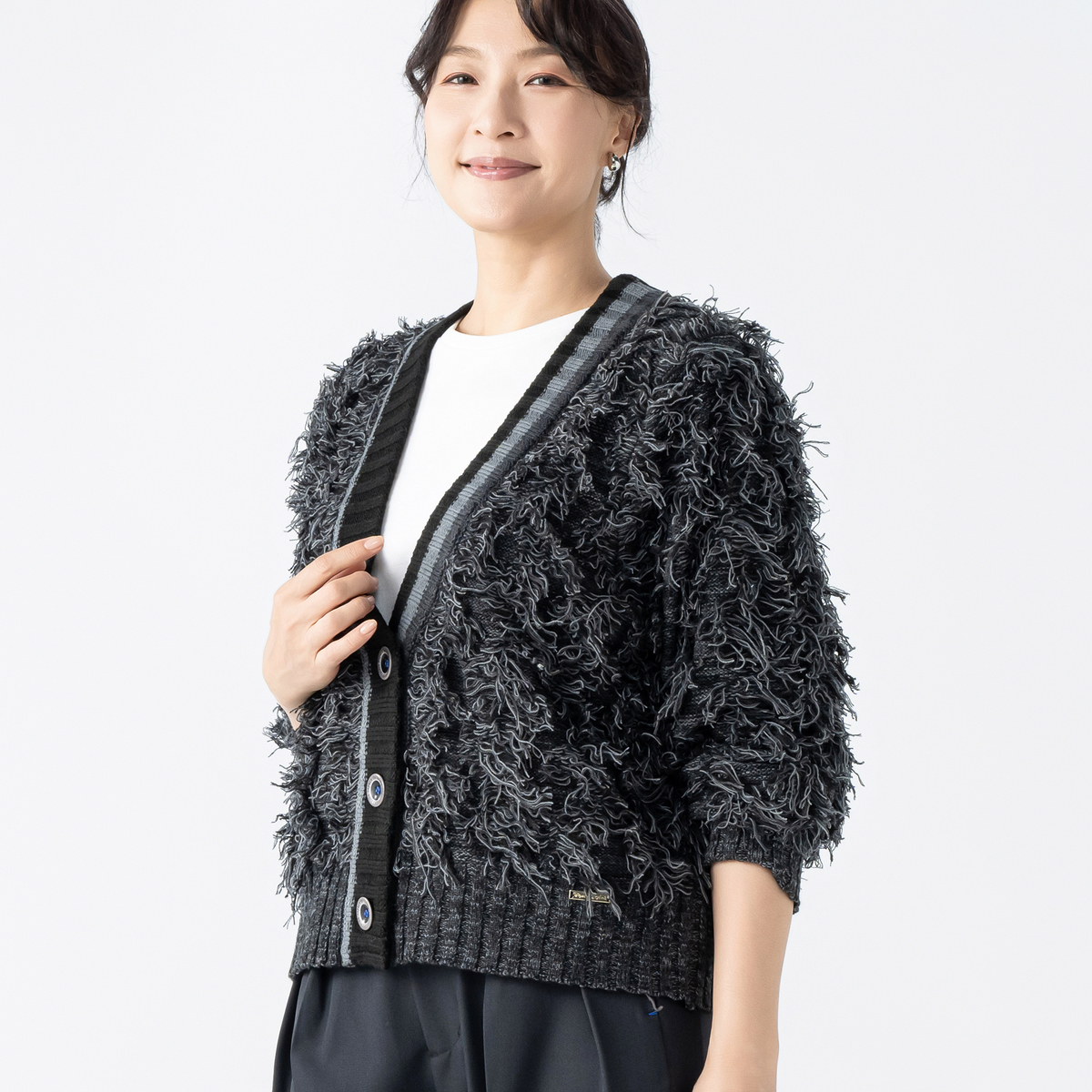 3色使いのMIXカラーフリンジが目を惹くニットカーディガン。起毛ヤーンを入れる事でふんわり仕上げています