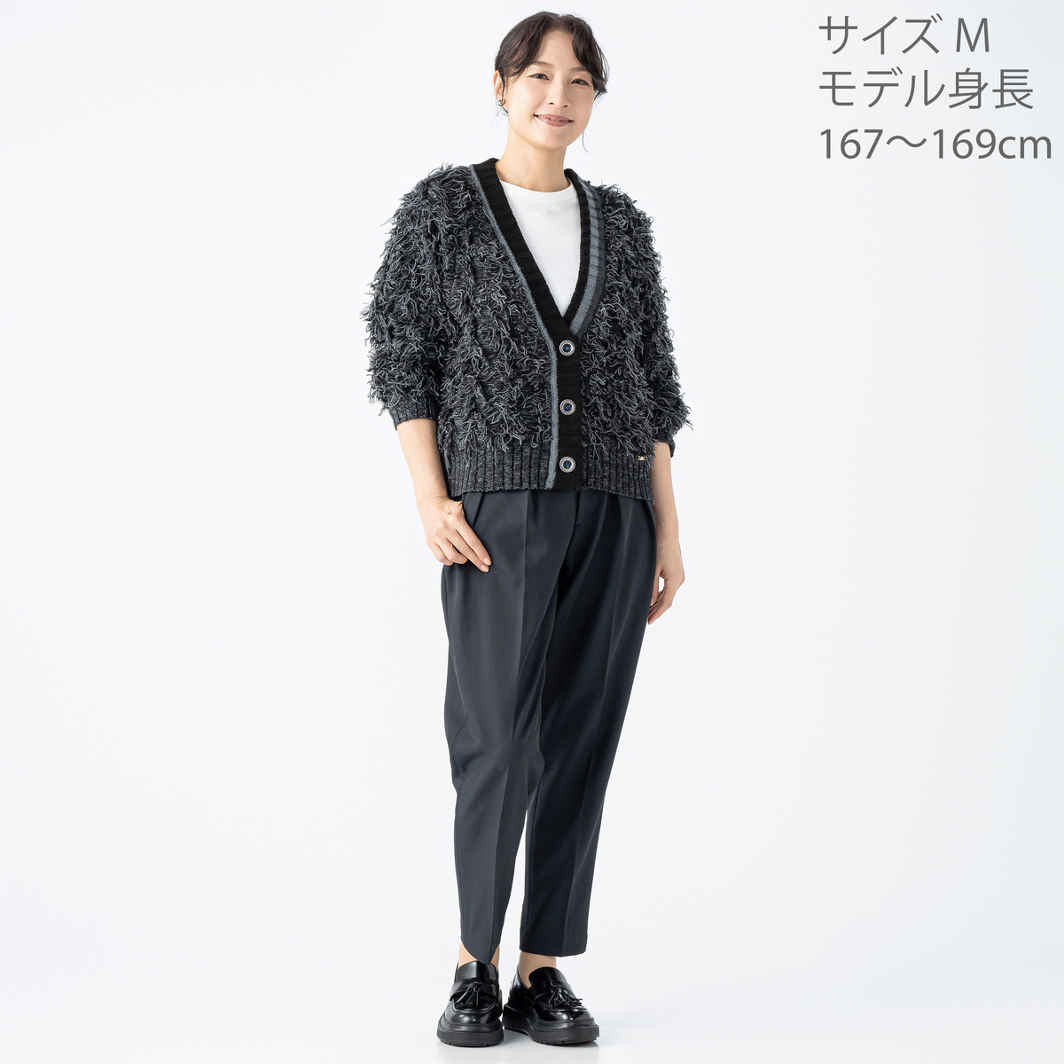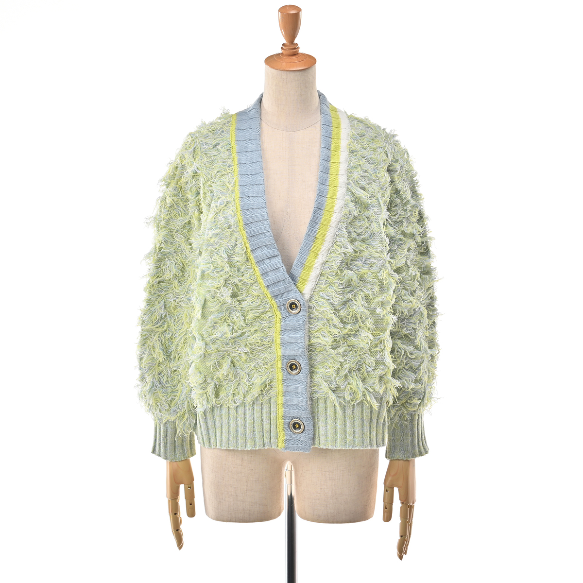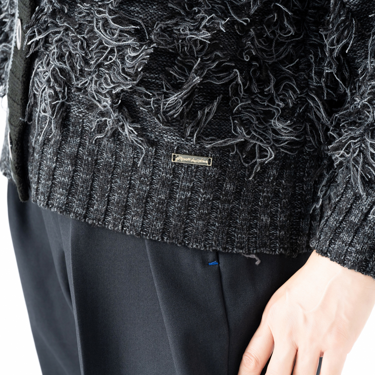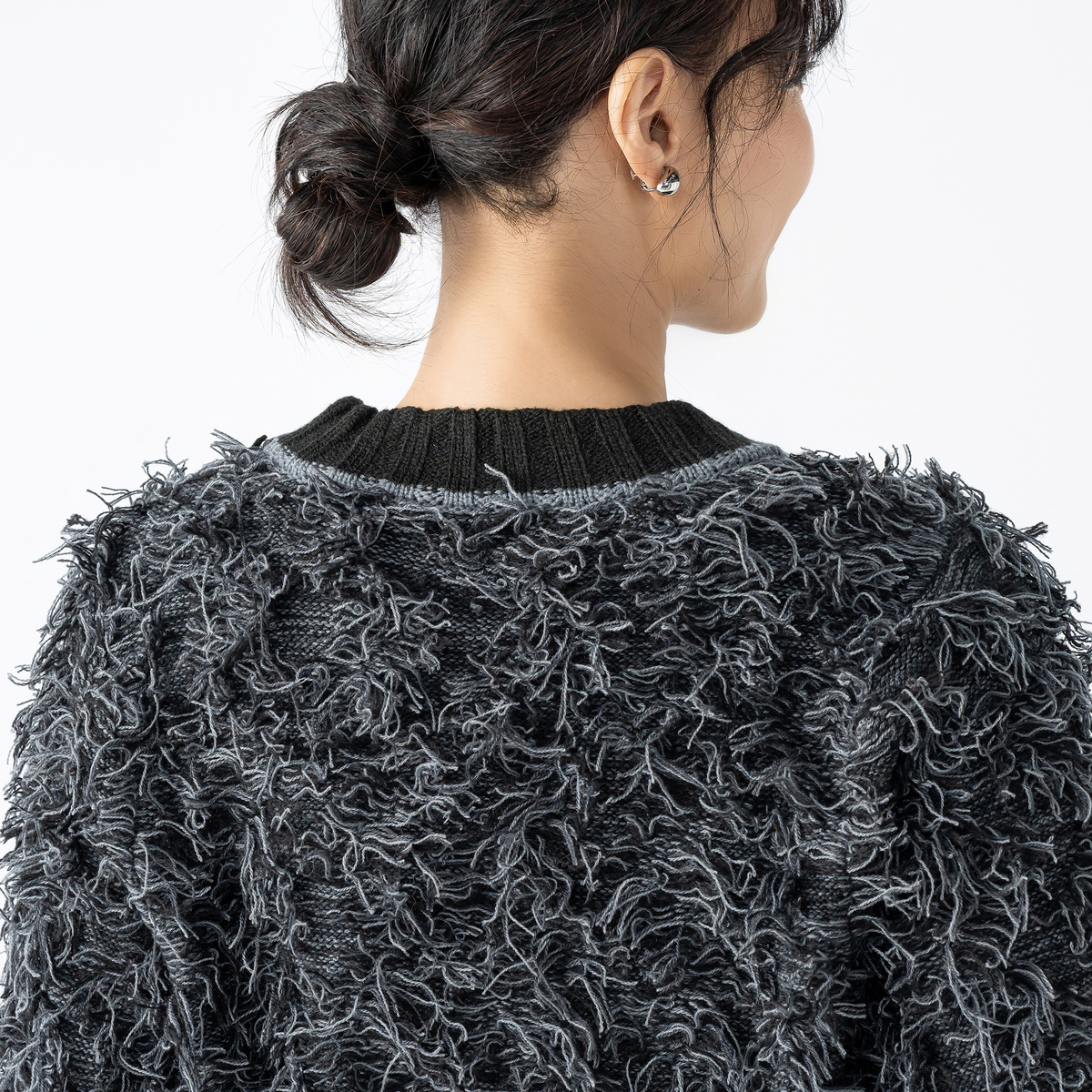 3色使いのMIXカラーフリンジが目を惹くニットカーディガン。起毛ヤーンを入れる事でふんわり仕上げています