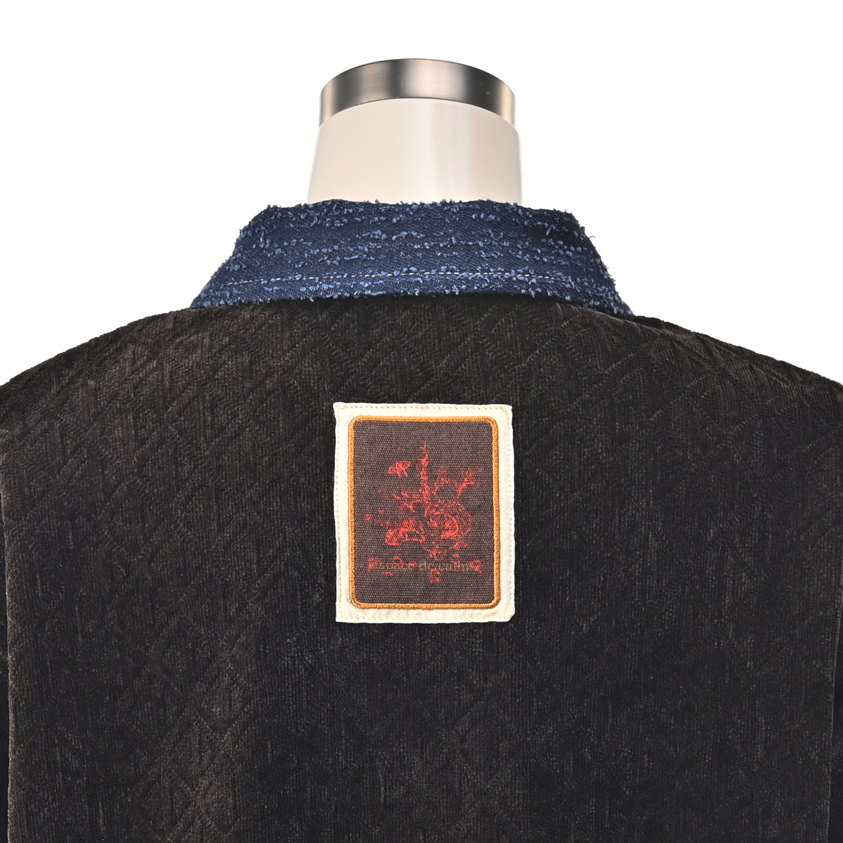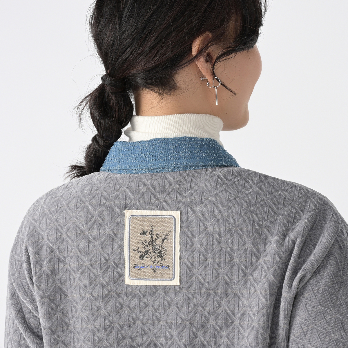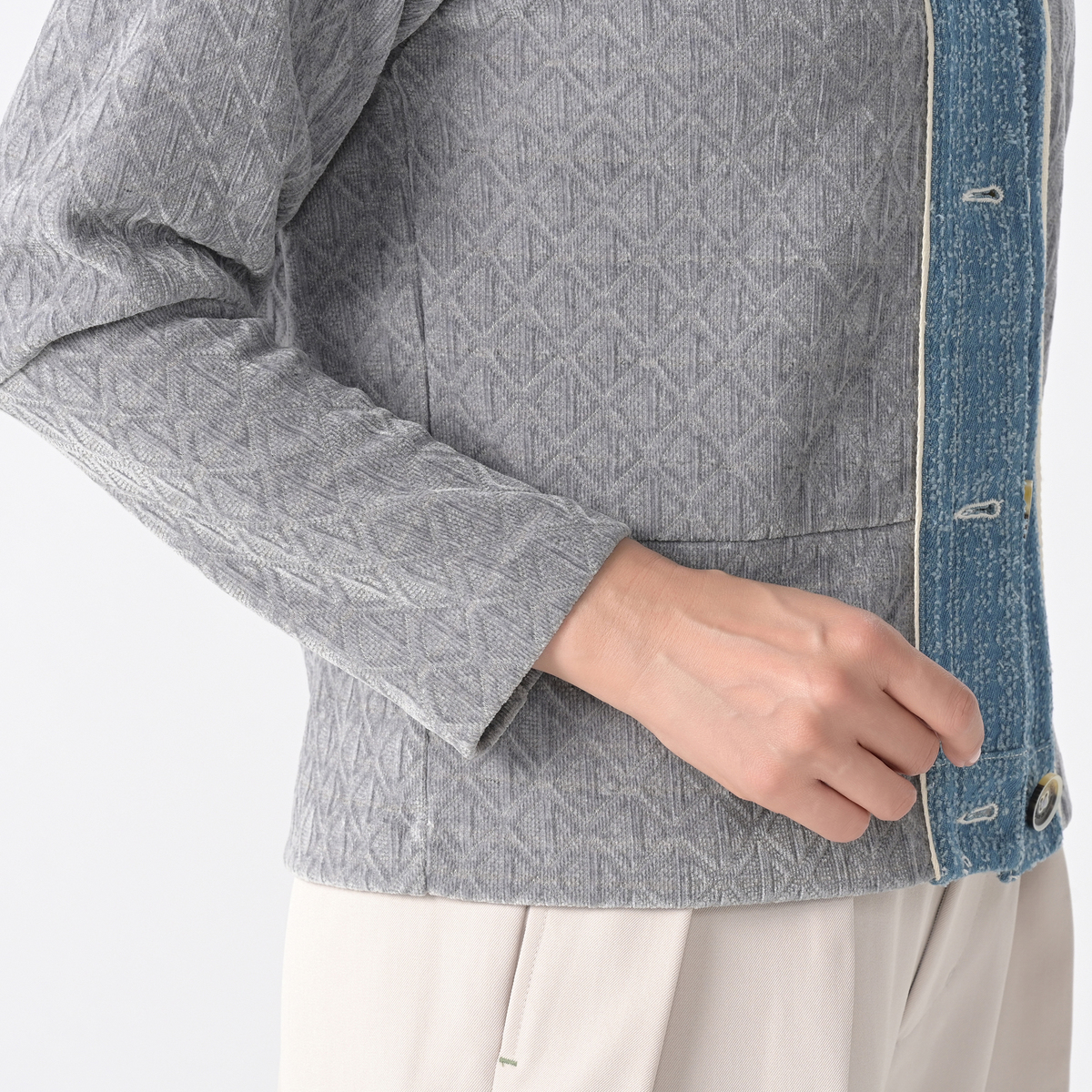 ジオメトリック柄のジャガード生地にクラッシュデニムをドッキングしたカーディガン。衿と前立てのデニム部分はGジャンをイメージしたディテールになっています