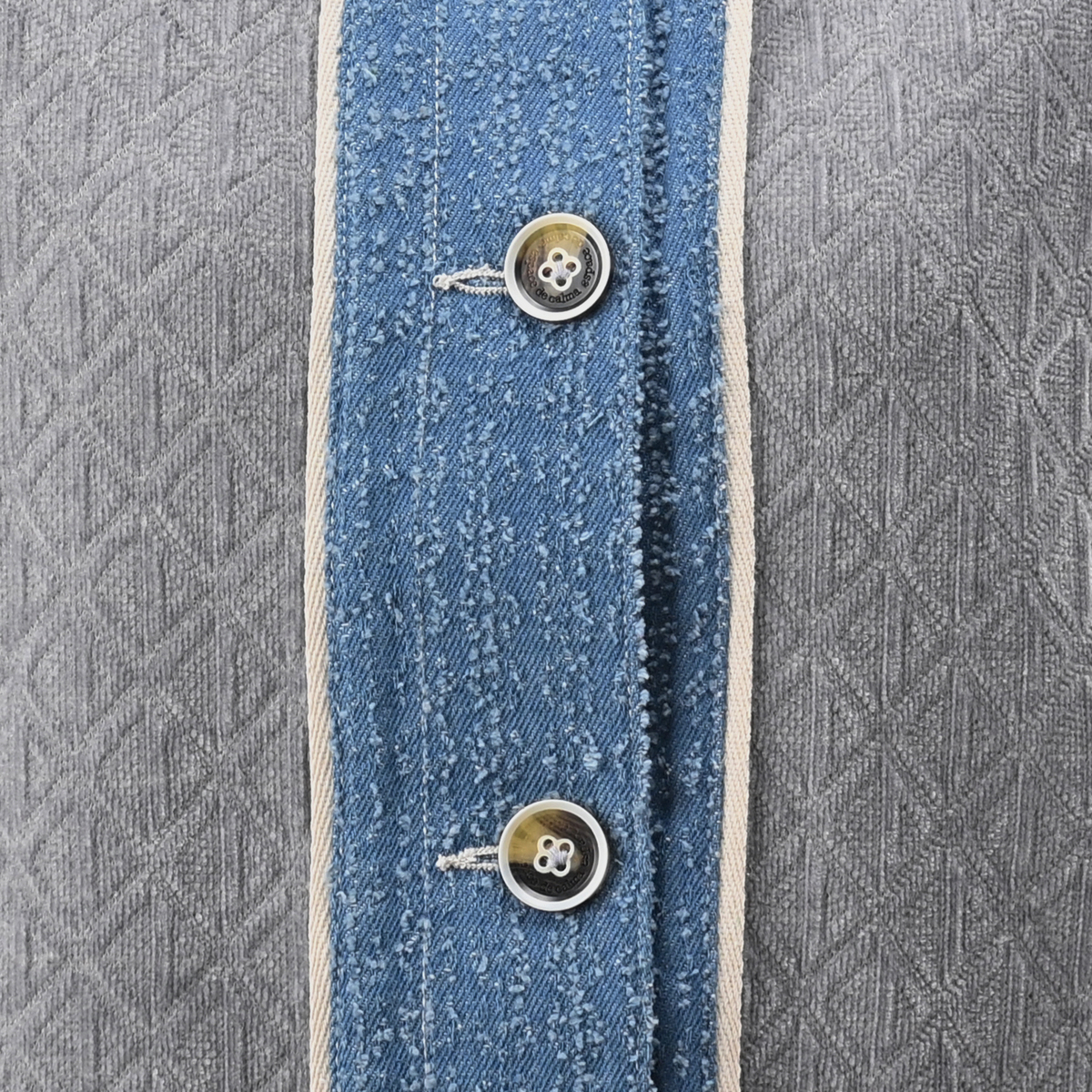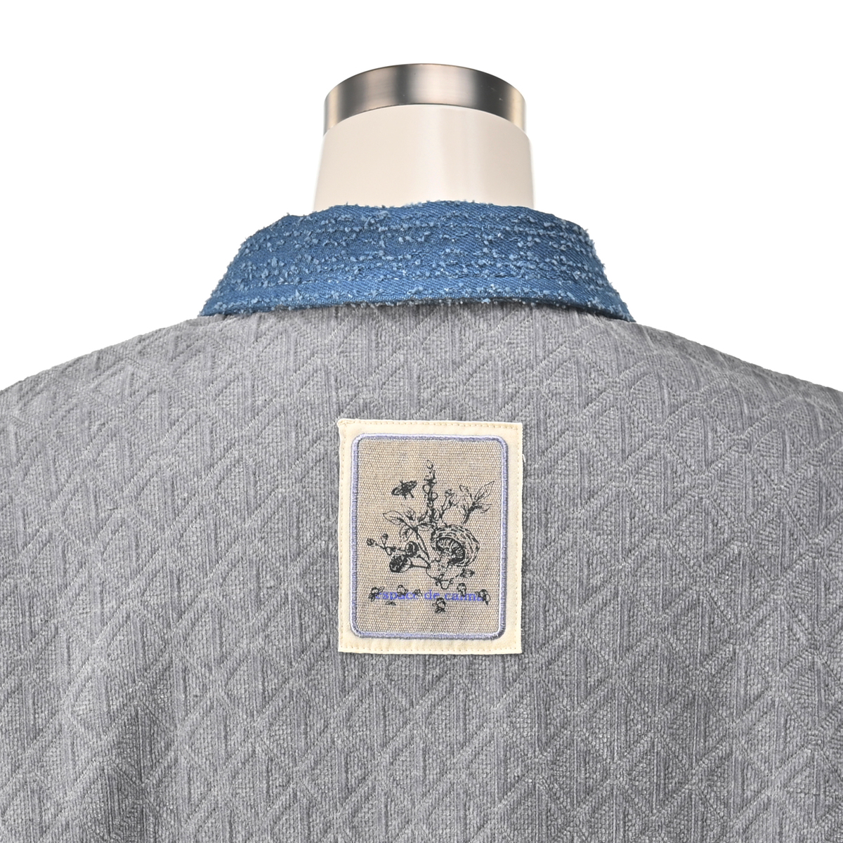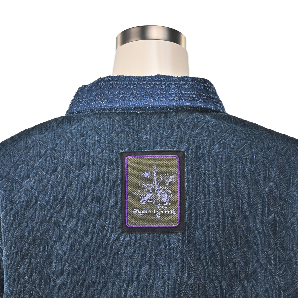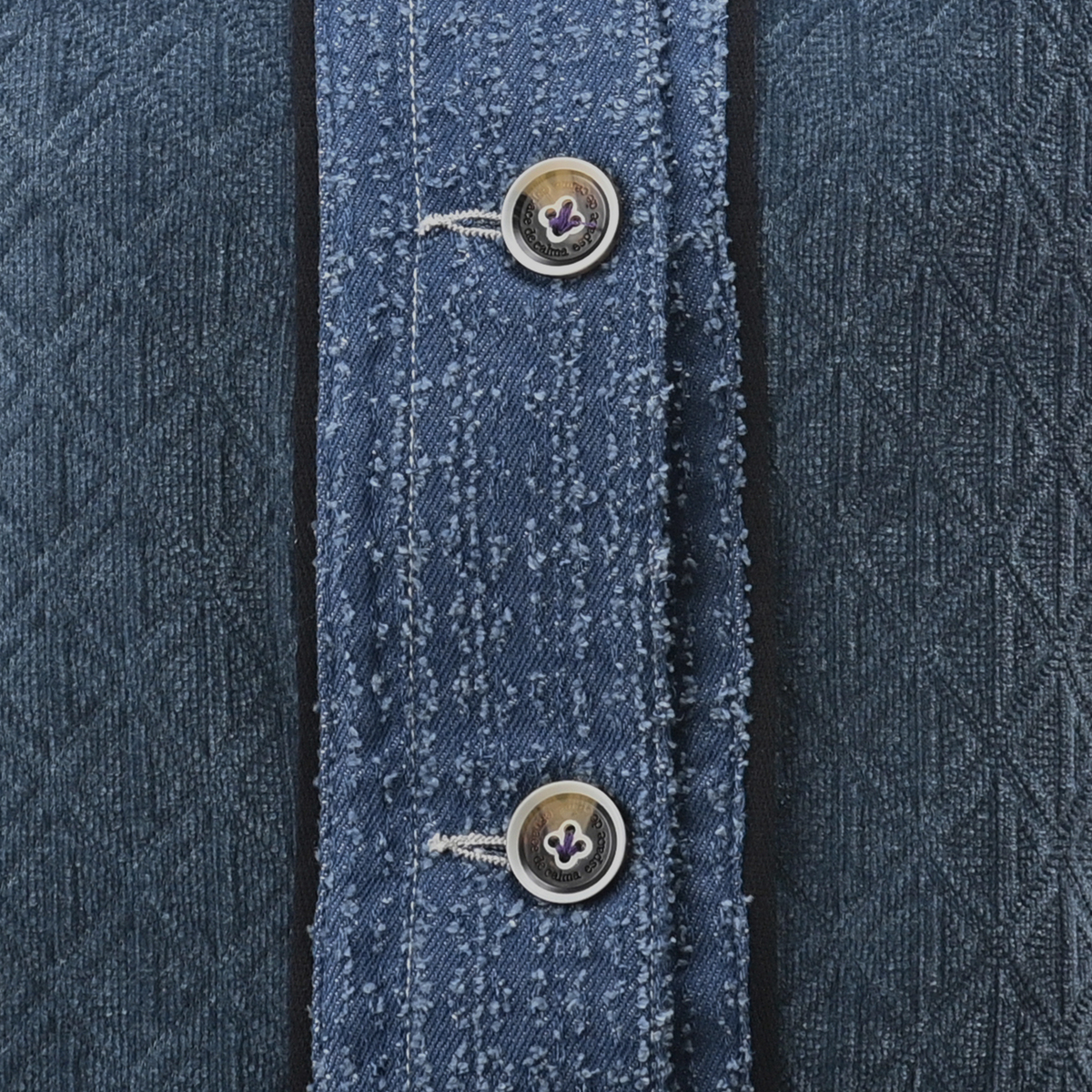 ジオメトリック柄のジャガード生地にクラッシュデニムをドッキングしたカーディガン。衿と前立てのデニム部分はGジャンをイメージしたディテールになっています
