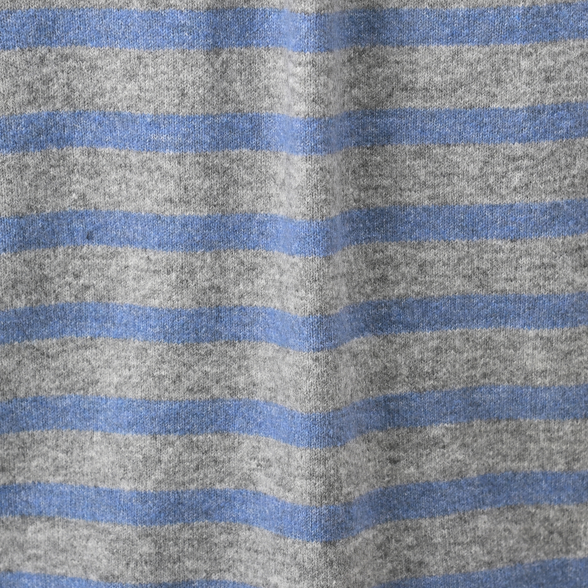 後身頃と袖に天竺編みのボーダー柄をデザイン。脇線が裾に掛けて前に斜めに傾斜することで前裾にもボーダー柄が見えてシャープな印象に。袖後ろ半分は無地になり、細見え効果を演出します