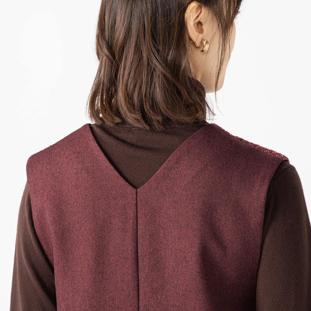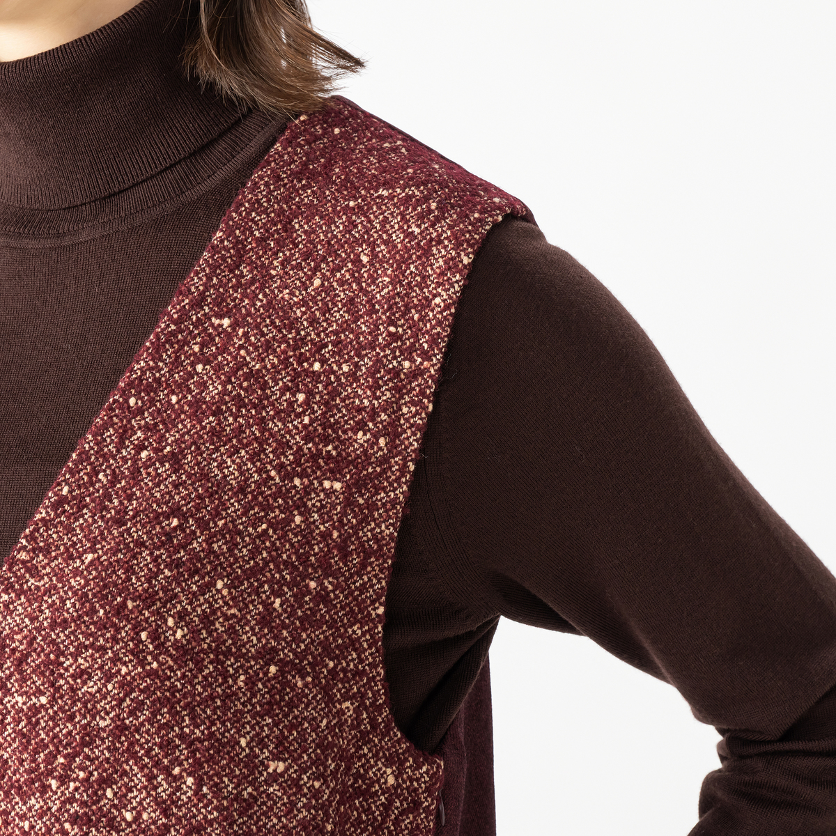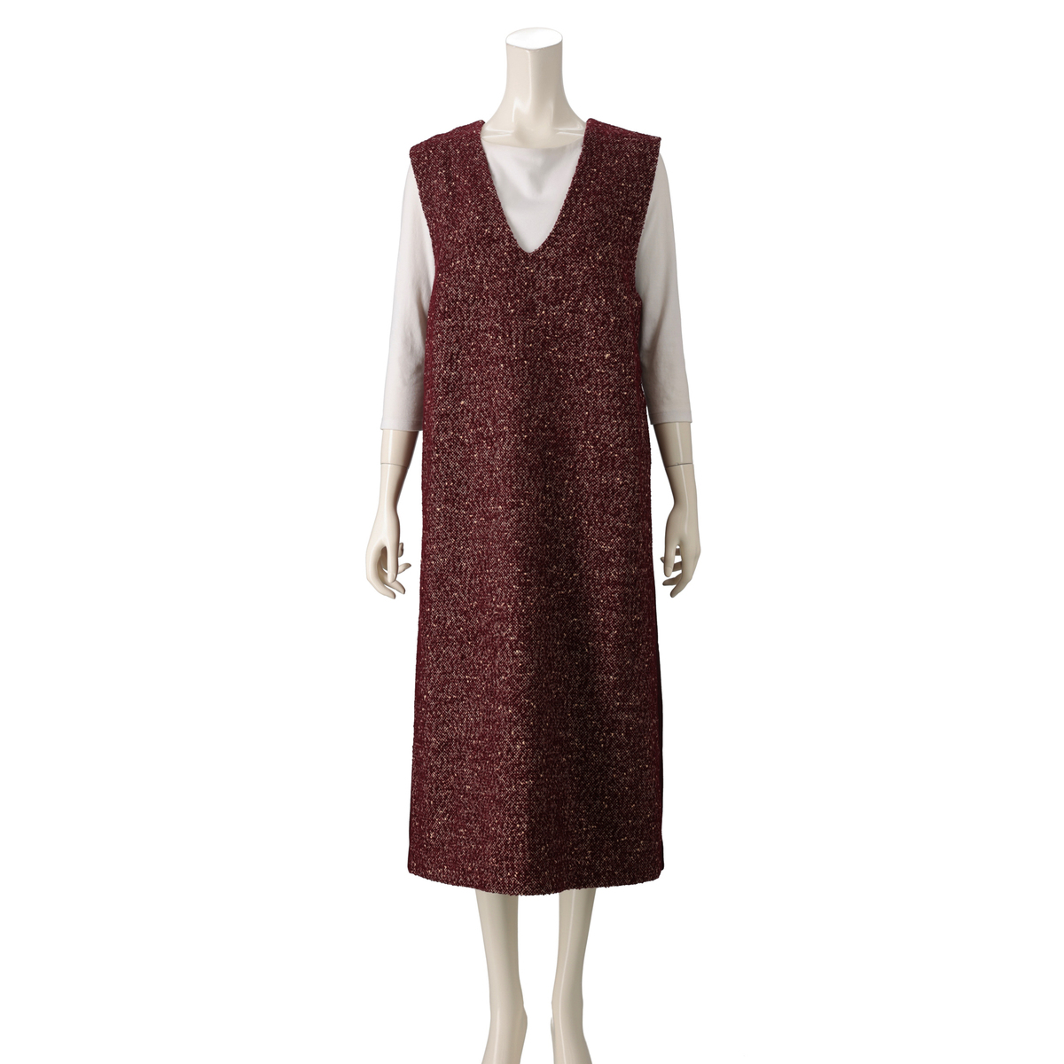 前身頃にラメ感のあるツイード調素材を使用したジャンパースカート。華やかさがありながら、後ろは無地で切り替えているので、派手すぎず上品な印象に。さらりとした肌触りで透けにくく、タフタの裏地が一枚重なることで風を通しにくく、肌寒い季節も安心です