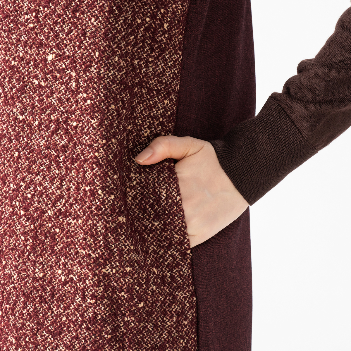 両サイドの無地部分が縦ラインを強調し、すっきりとした細見えシルエットを演出。着脱しやすい脇ファスナー付きで、後ろ裾のスリットが足さばきにも配慮されています。スマホやハンカチが入る便利なポケット付きで、ちょっとした外出ならバッグいらずです