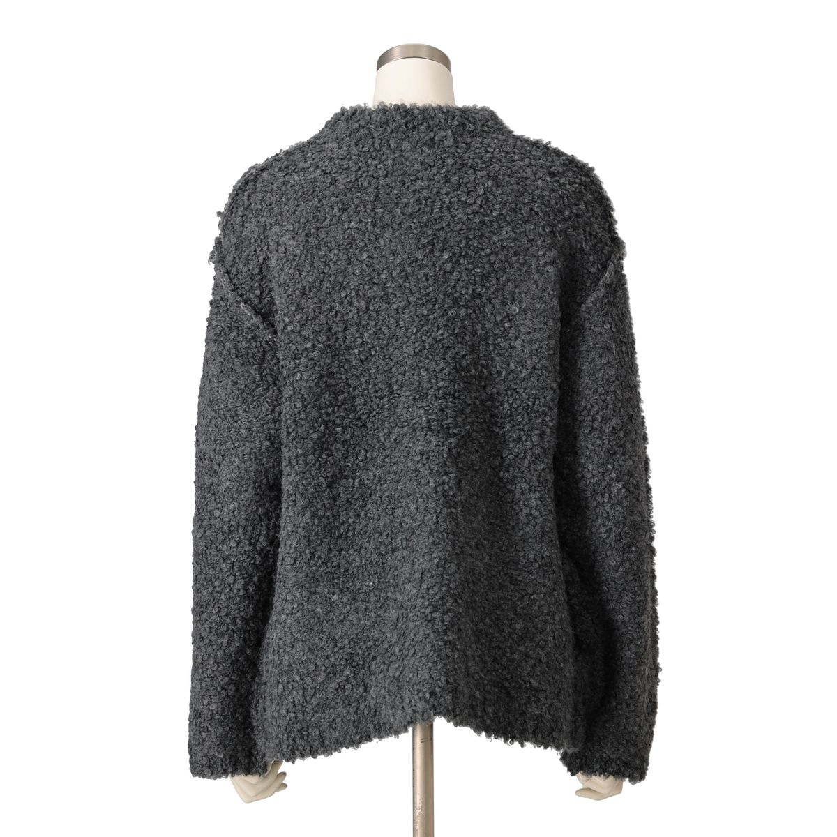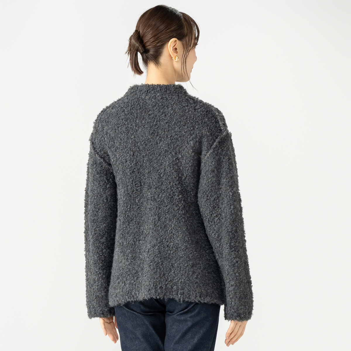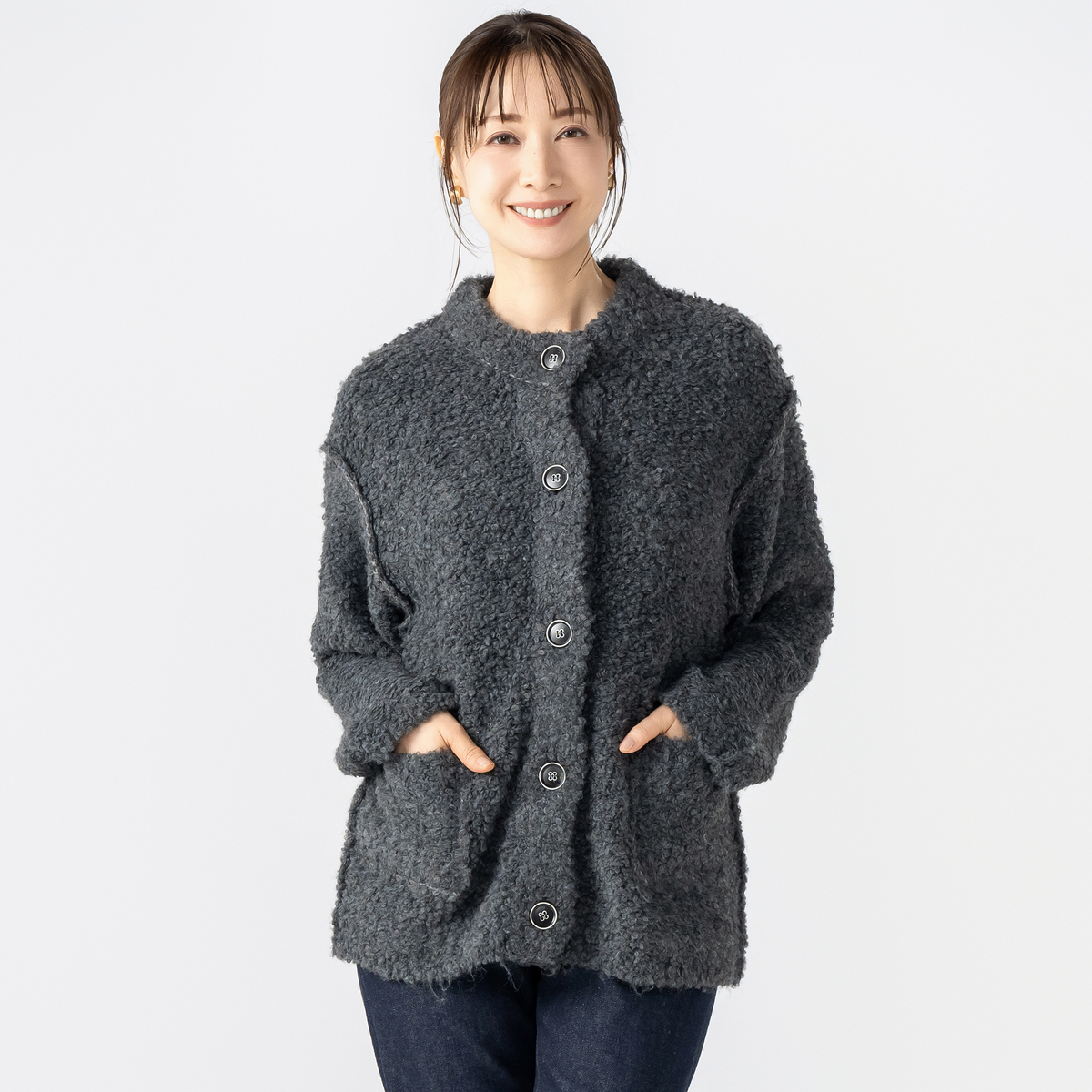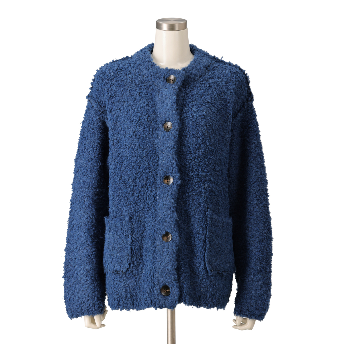 ブークレ糸を柔らかく編み込んだローゲージブークレニットのカーディガン。空気を含んだようなもこもこの質感が魅力です。もこもことした質感が見た目にもぬくもりを感じさせます
