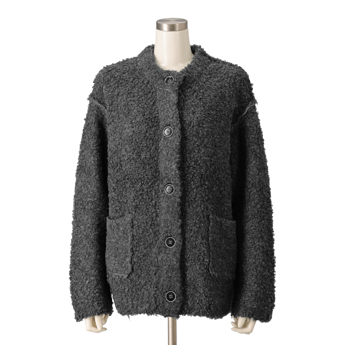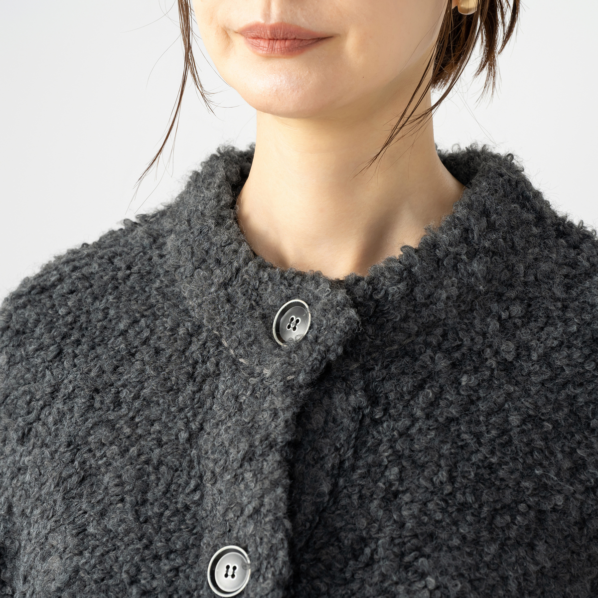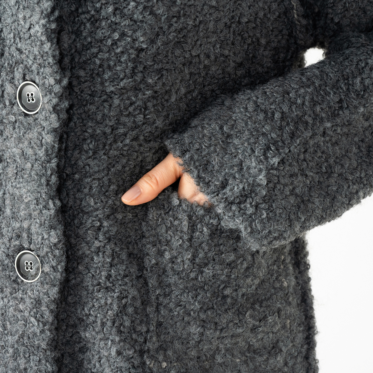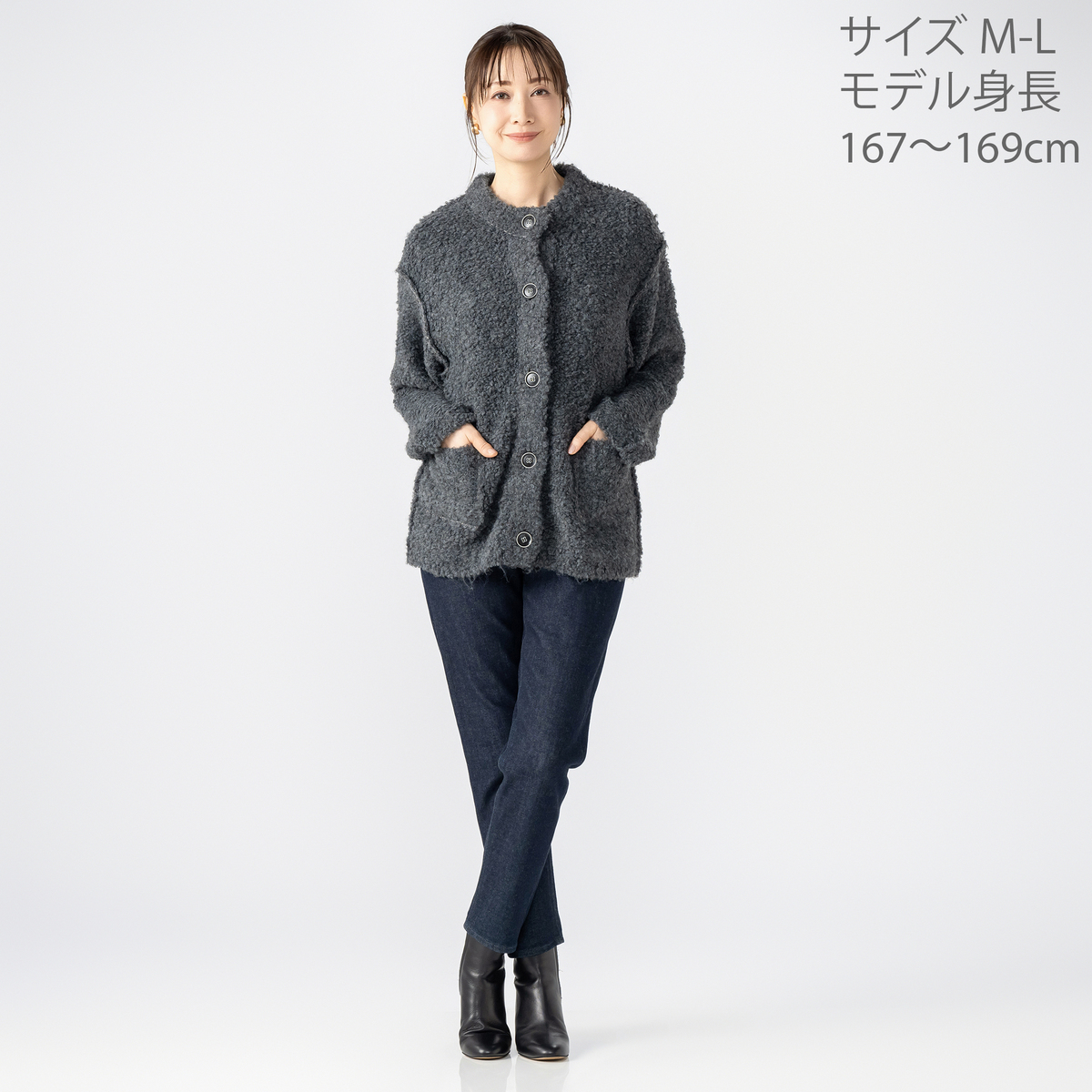 ブークレ糸を柔らかく編み込んだローゲージブークレニットのカーディガン。空気を含んだようなもこもこの質感が魅力です。もこもことした質感が見た目にもぬくもりを感じさせます