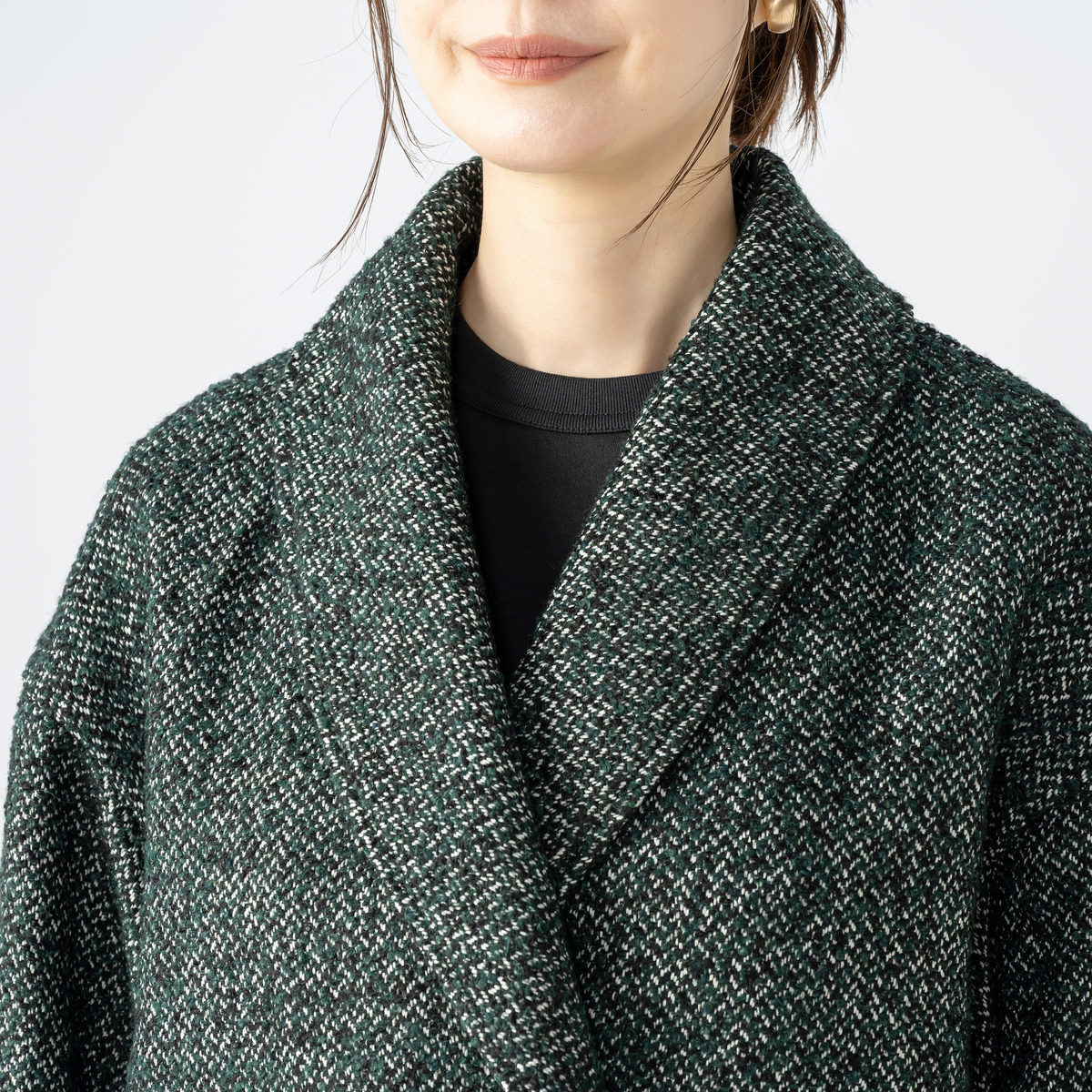 お顔まわりにやさしい雰囲気を添えるショールカラーとダブルブレスト仕立てのコートです。柔らかなカッティングが美しさを際立たせ、インナーとの組合せも幅広くお楽しみいただけます