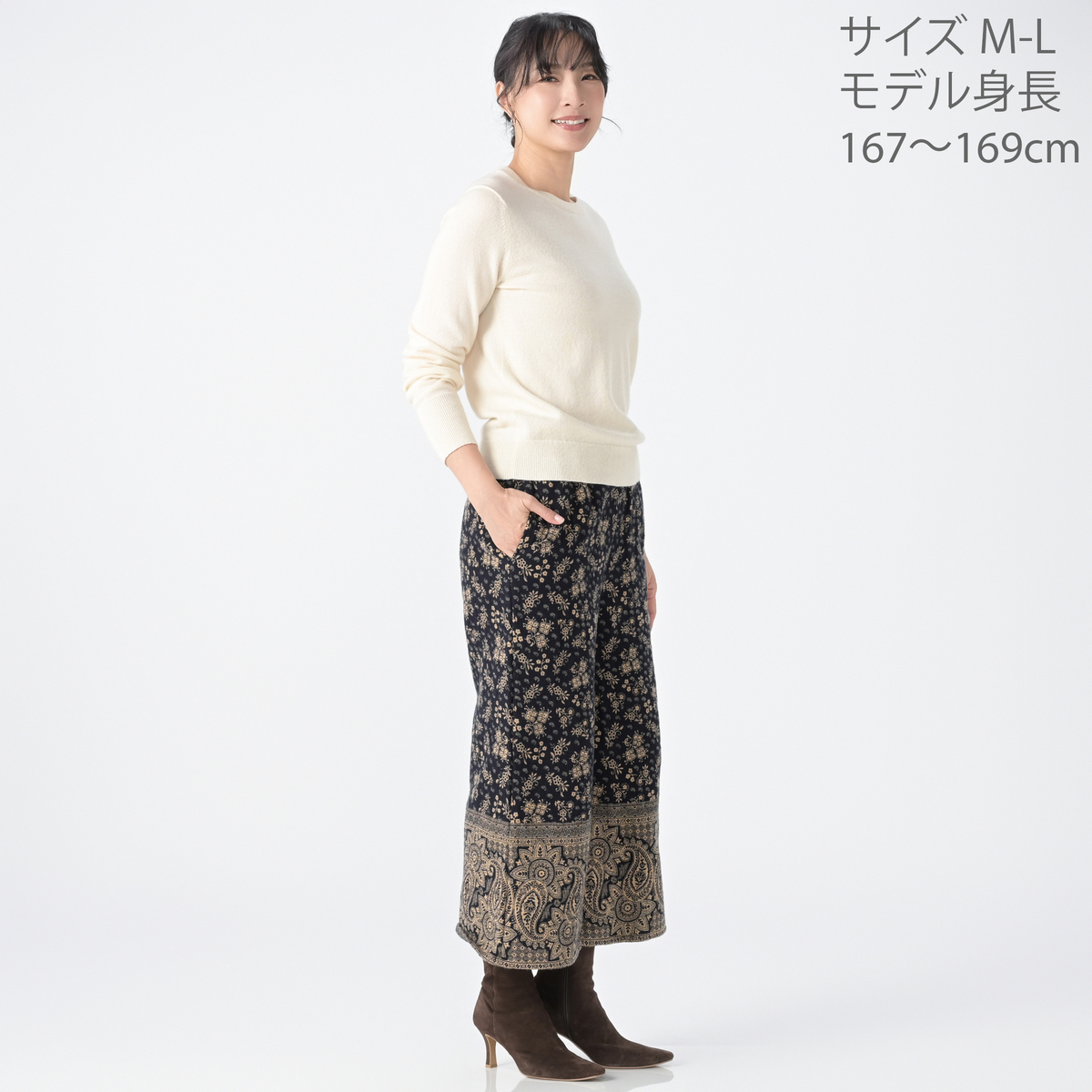 [商品寸法(ヌード)cm] サイズ ウエスト ヒップ 股下 MーL: 68(64〜77) 100(87〜100) 54 LLー3L:76(77〜93) 110(97〜110) 53 サイズ 前股ぐり わたり幅 MーL: 34 32 LLー3L:36 35 [ウエストゴム] 全体に有 [素材] アクリル100% [お手入れ] 洗濯機洗い可 [注意事項] ※商品寸法の誤差は多少発生します。ご了承下さい ※蛍光増白剤配合洗剤使用禁止 ※アイロンは当て布使用 ※この製品はインド製の生地を使用しています。染め、織りむら等による粗野感と着心地を特徴とし、独特な(製品は1点1点多少表情が違います)色目、風合いを持っています ※水洗いにより多少色落ちする場合がありますので白物と分けてお洗い下さい。一度お洗い頂いてからのご使用をお薦め致します ※濡れたまま他の物と重ねておくと移染しますので洗濯後は形を整えて早めに干して下さい ※乾燥機のご使用はお避け下さい ※生成、染色商品には無蛍光洗剤をご使用下さい ※性質上、摩擦により毛羽立ち、毛玉が出来やすい商品です ※お洗濯により多少縮む場合があります。ご了承下さい ※アイロンは当て布を使用して下さい ※この商品は自然の風合を求めた特別な製品の為色むら織りむら等が製品の特性です ※生地の特性により縫い目の部分をご注意の上お取扱いください ※この製品は素材の特性上水分や汗、摩擦などにより色落ちすることがありますのでご着用の際は十分ご注意ください 【インド製】