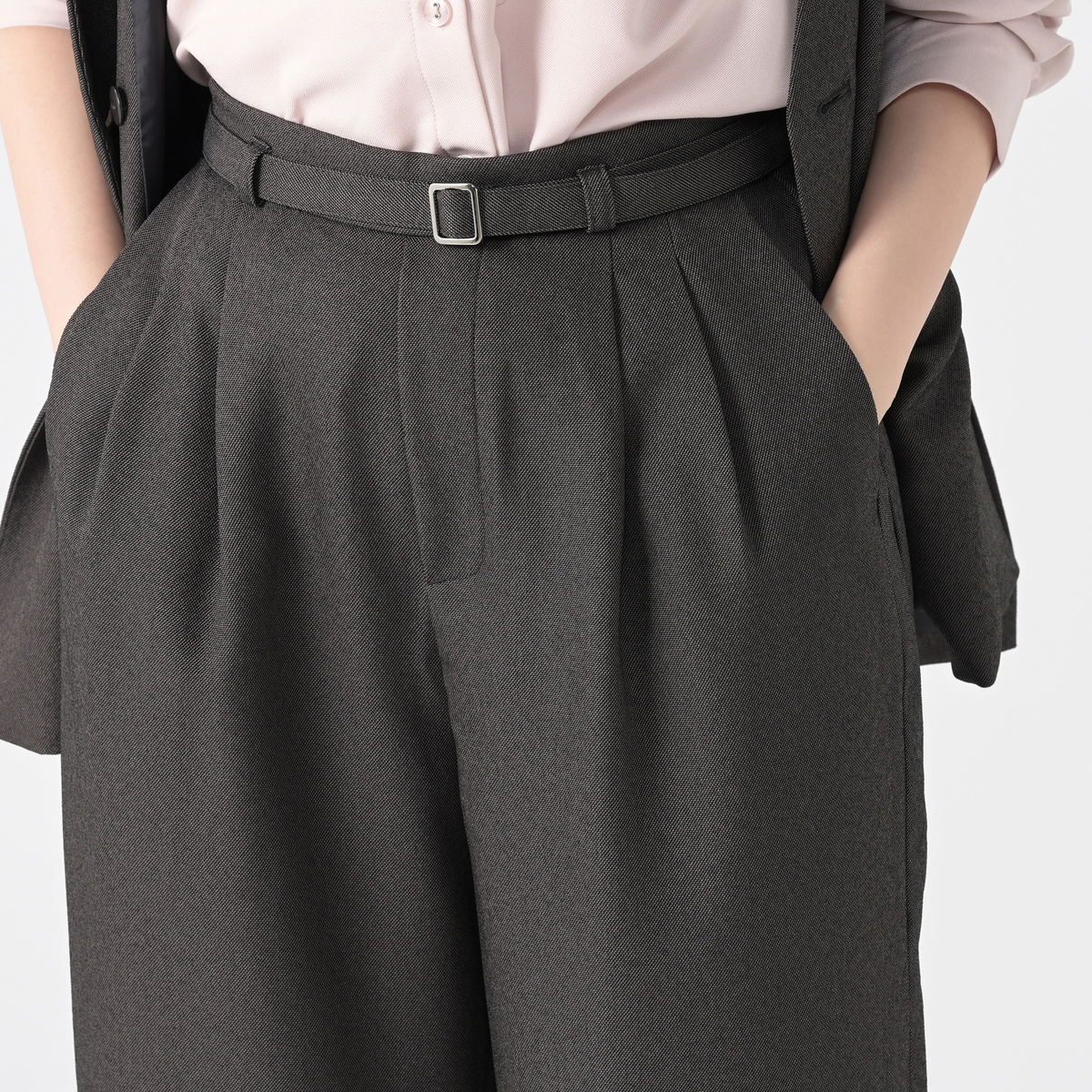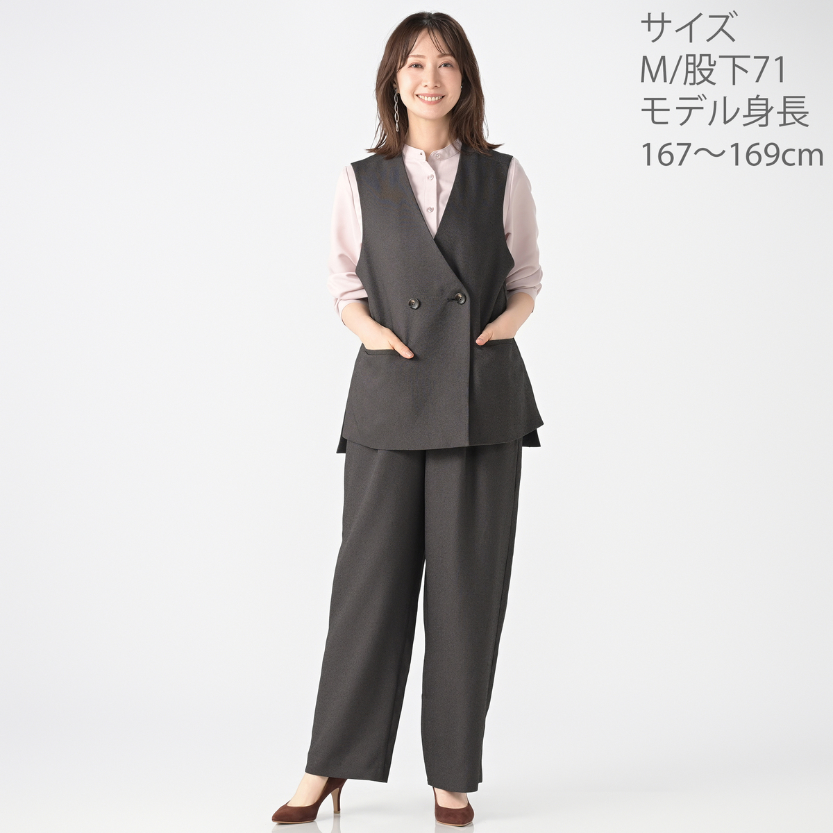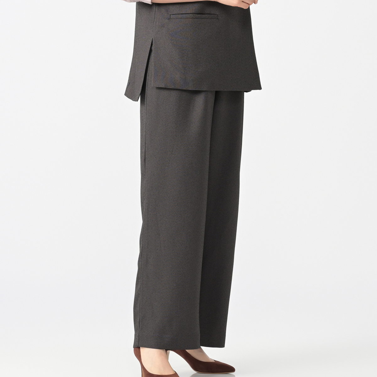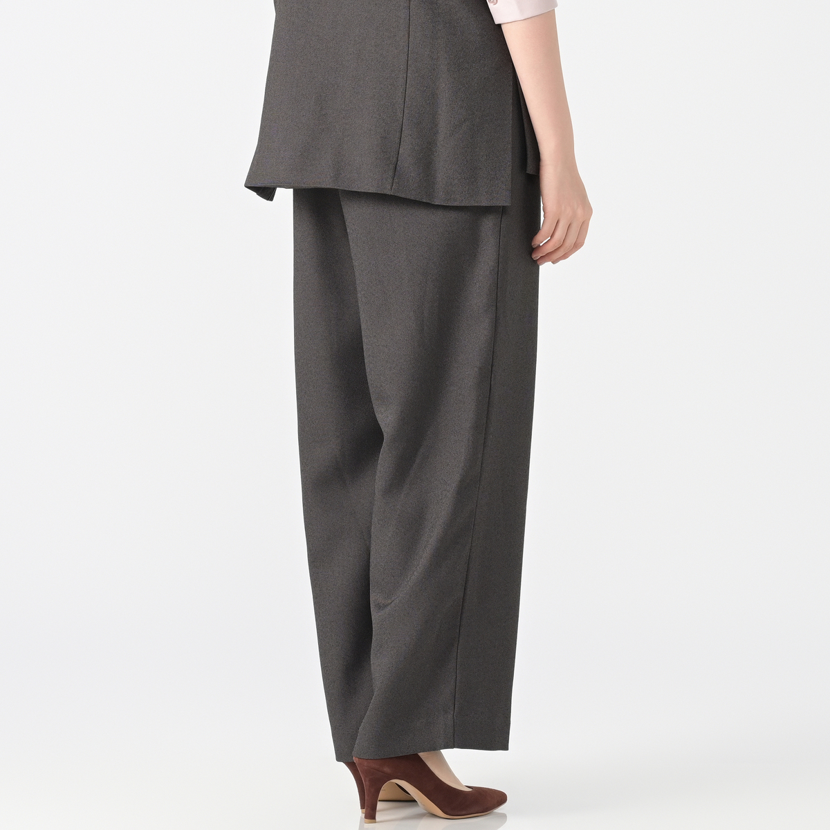 ポリエステル素材に梳毛調のシャークスキン織りを施し杢調に見える(*1)ワイドパンツ。ウエストの後ろ全体にはゴムギャザーを配し、引っ張って穿けるプルオン仕様。前中心はダミー開きのファスナーがないフラットな仕上がりで、すっきり見えに。さらにフロントの2タックが体型カバーを叶えます