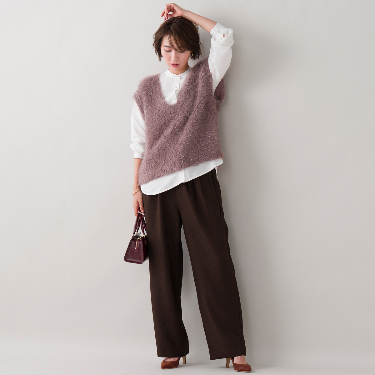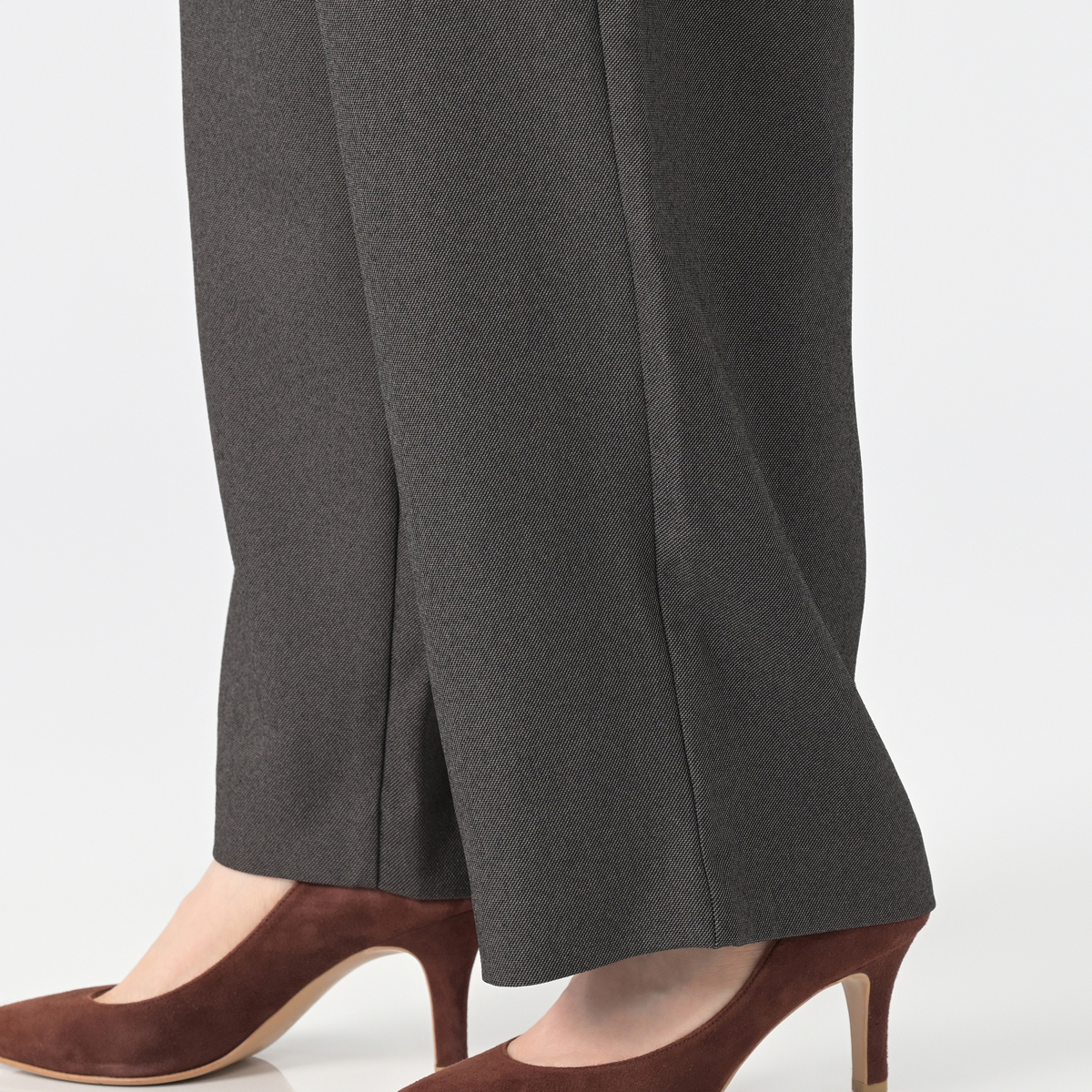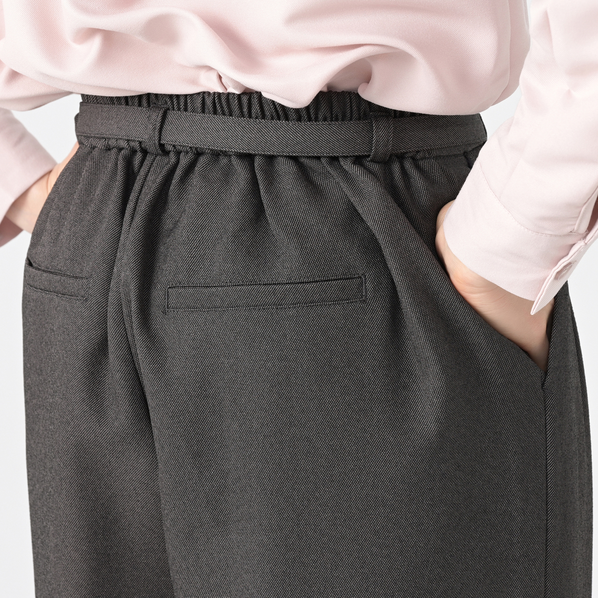 ポリエステル素材に梳毛調のシャークスキン織りを施し杢調に見える(*1)ワイドパンツ。ウエストの後ろ全体にはゴムギャザーを配し、引っ張って穿けるプルオン仕様。前中心はダミー開きのファスナーがないフラットな仕上がりで、すっきり見えに。さらにフロントの2タックが体型カバーを叶えます